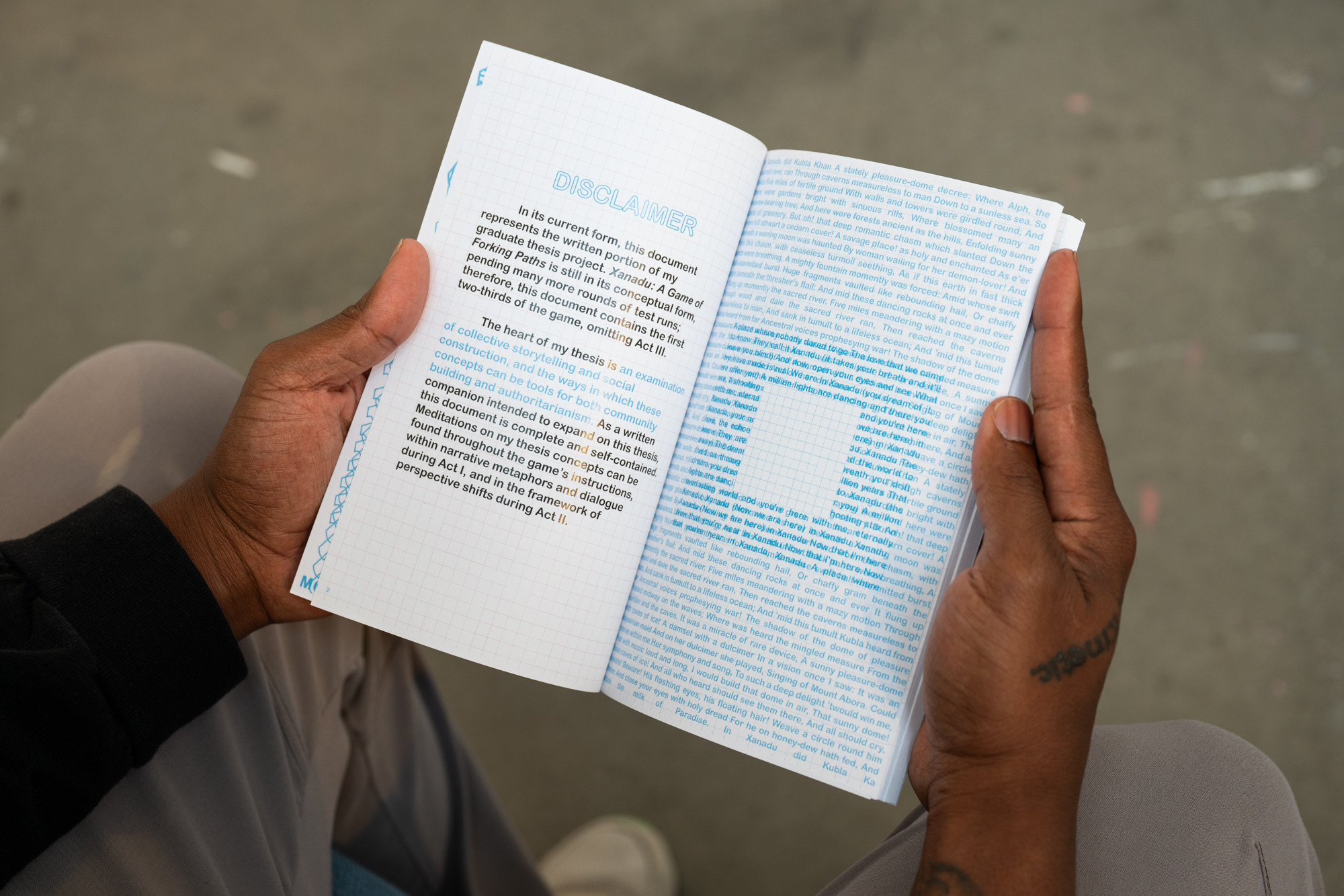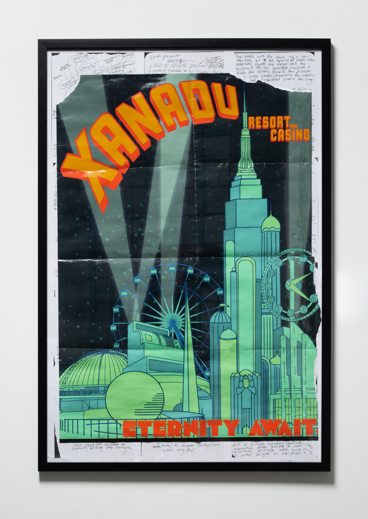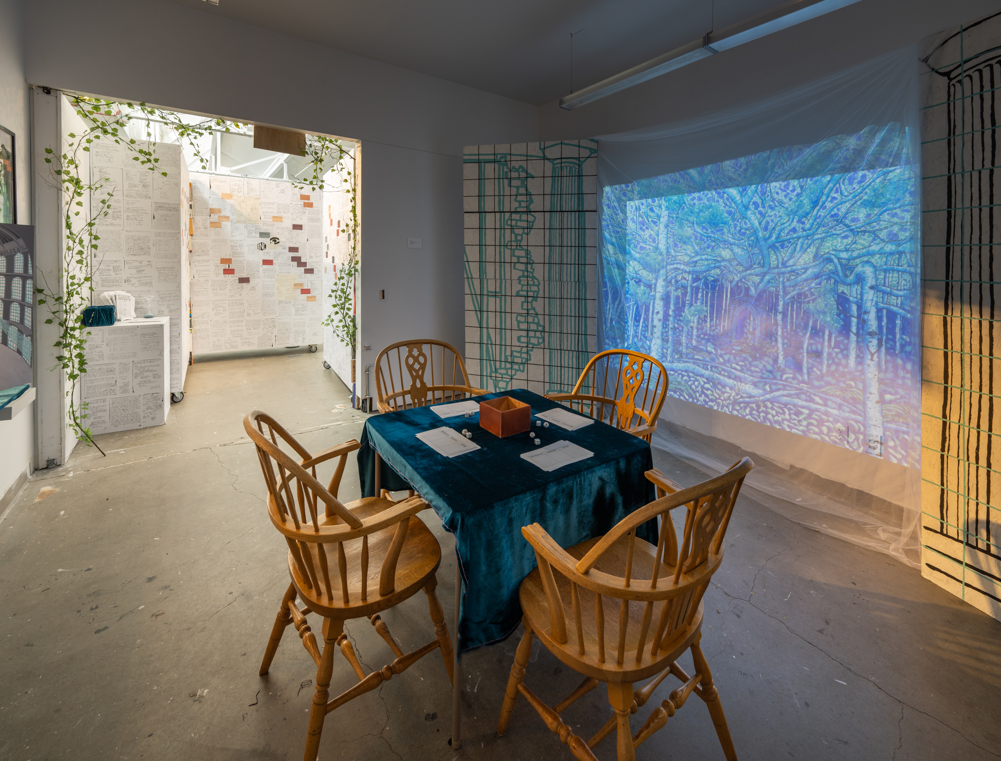 Xanadu is a tabletop role-play game about social construction: the concept that societies collectively invent the terms that then come to define reality. My purpose is to suggest that there is revolutionary power in this, and to explore the ways in which play, imagination, and nonlinear storytelling can develop viable descriptions of reality outside of Western constructs. My artwork often responds to observations about social systems and epistemologies. From what I observe, the systems that dominate societies worldwide derive primarily from slavery, war, and supremacist Western ideologies, and work in tandem to power a centuries-long process of mass exploitation. In my thesis work, I wanted to distill these intertwining systems into a microcosm that names and deconstructs, but does not reproduce, the violence of these systems of oppression, while making space for creative experimentation with alternatives. Writing the game was also a way of creating a context for the artwork I would make in response to it. The exhibition is designed to show the temporality of the project’s composition, and to offer thematic breadcrumbs about the game’s narrative universe. It functions as a pathway, wall-papered with notes and early concept sketches that give way to more concrete game materials, alongside symbolic works relating to the game’s themes of performativity, social construct, authoritarianism, and community. The “destination” at the end of the pathway mimics the scene in which player-characters find themselves when the game begins.