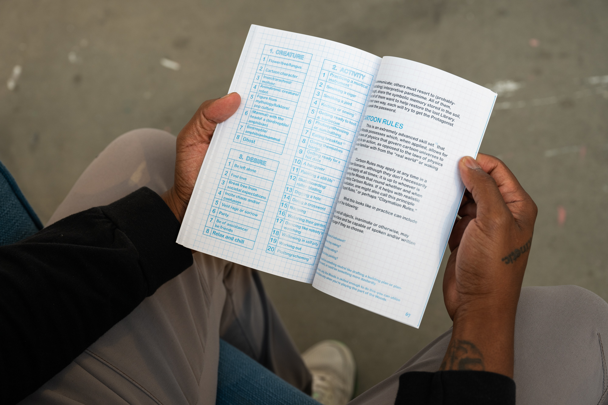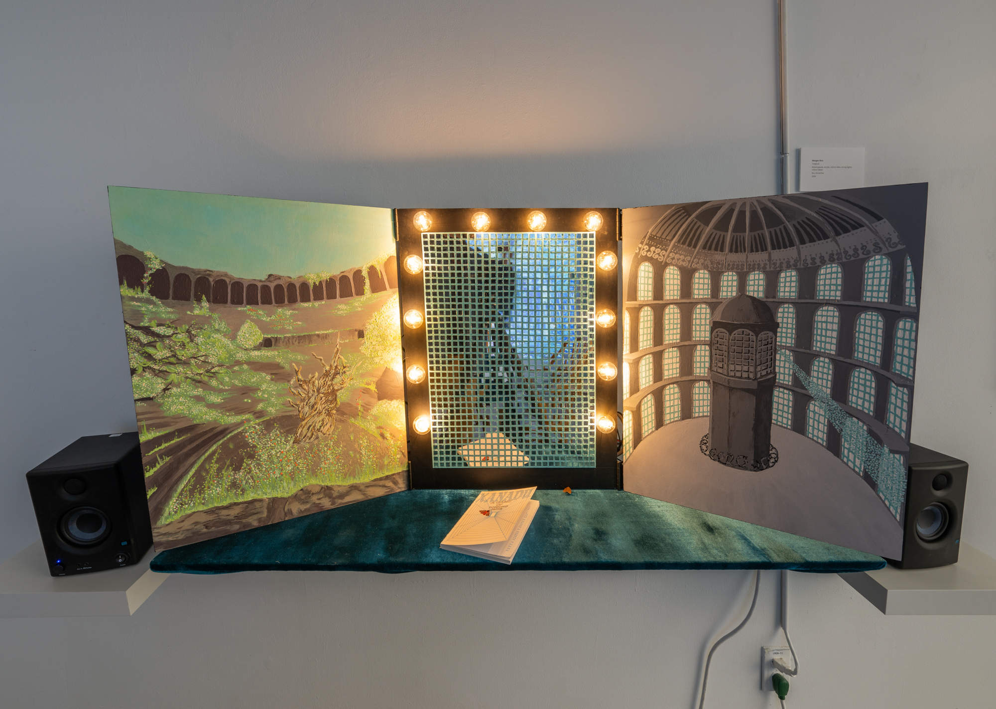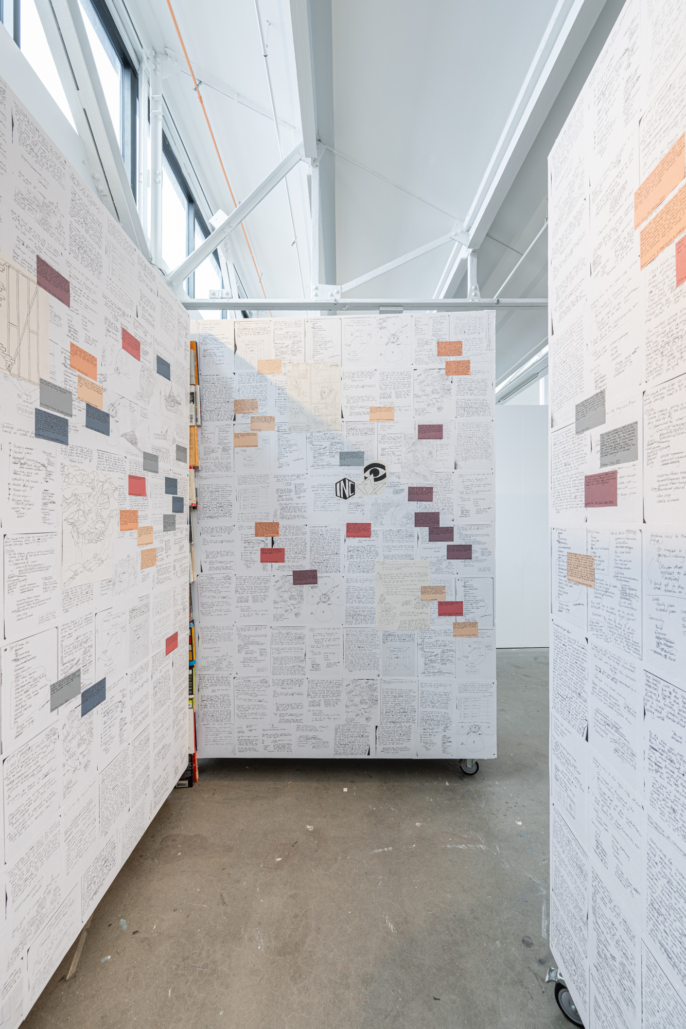 Xanadu is a tabletop role-play game about social construction: the concept that societies collectively invent the terms that then come to define reality. My purpose is to suggest that there is revolutionary power in this, and to explore the ways in which play, imagination, and nonlinear storytelling can develop viable descriptions of reality outside of Western constructs. My artwork often responds to observations about social systems and epistemologies. From what I observe, the systems that dominate societies worldwide derive primarily from slavery, war, and supremacist Western ideologies, and work in tandem to power a centuries-long process of mass exploitation. In my thesis work, I wanted to distill these intertwining systems into a microcosm that names and deconstructs, but does not reproduce, the violence of these systems of oppression, while making space for creative experimentation with alternatives. Writing the game was also a way of creating a context for the artwork I would make in response to it. The exhibition is designed to show the temporality of the project’s composition, and to offer thematic breadcrumbs about the game’s narrative universe. It functions as a pathway, wall-papered with notes and early concept sketches that give way to more concrete game materials, alongside symbolic works relating to the game’s themes of performativity, social construct, authoritarianism, and community. The “destination” at the end of the pathway mimics the scene in which player-characters find themselves when the game begins.