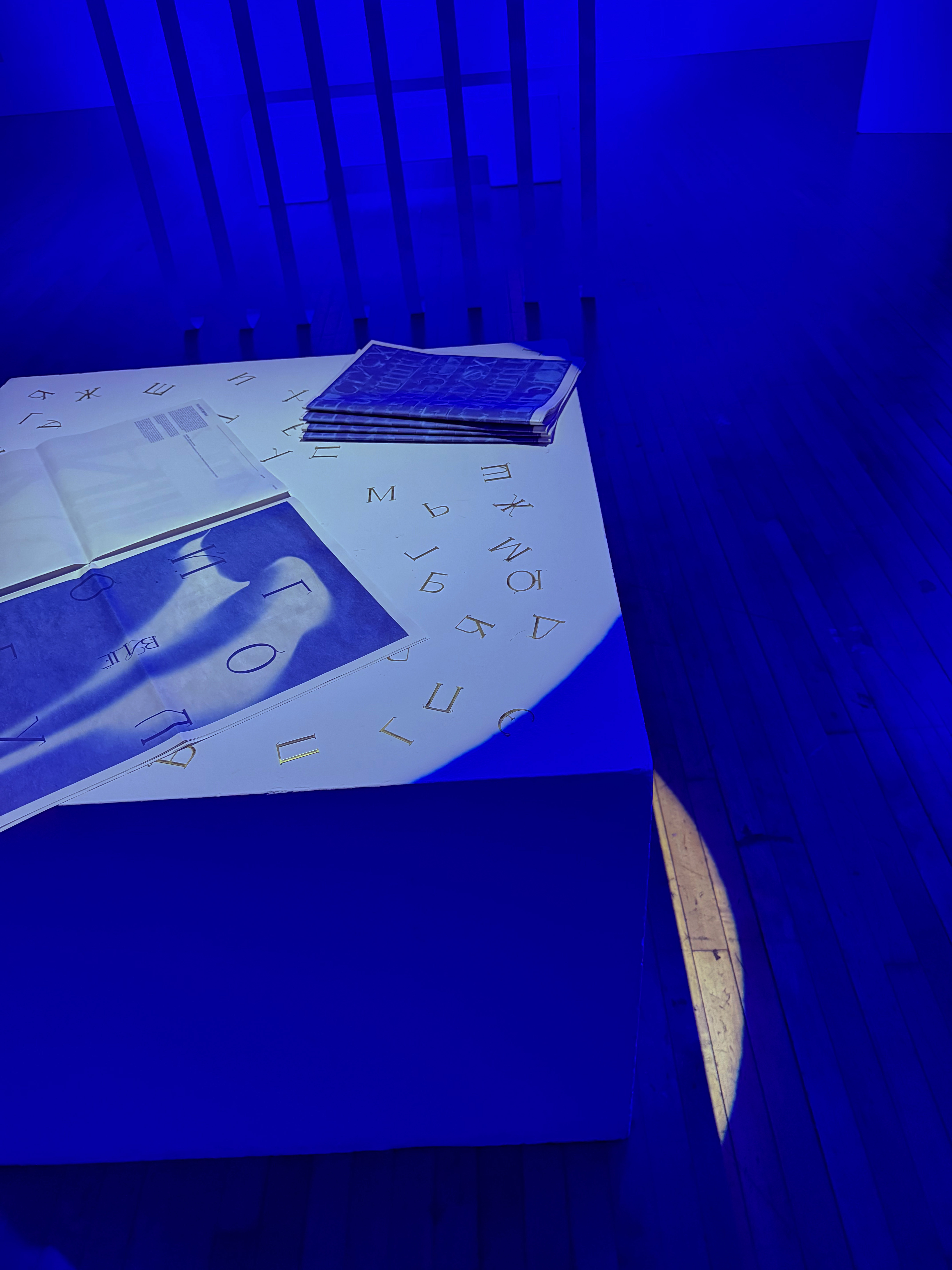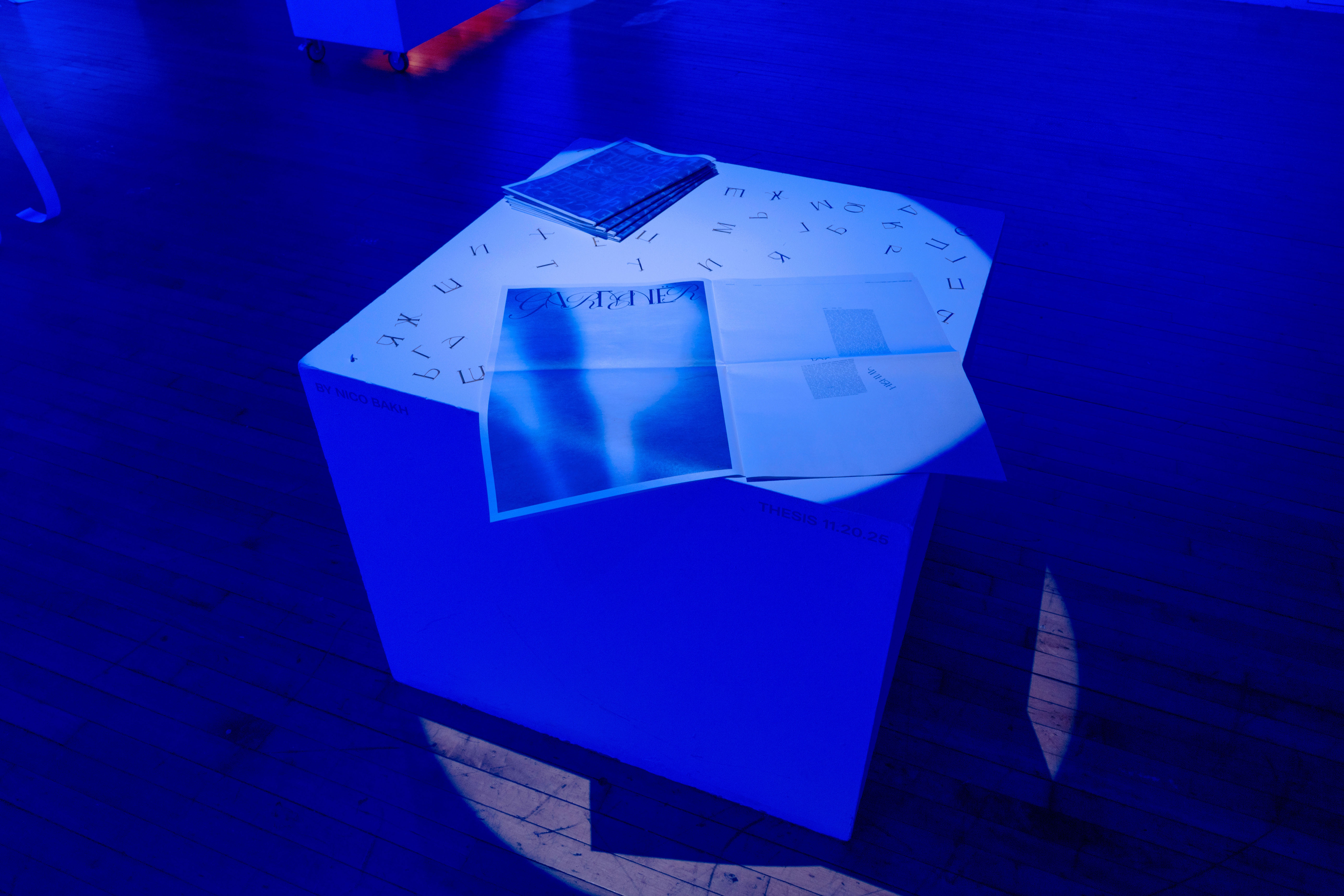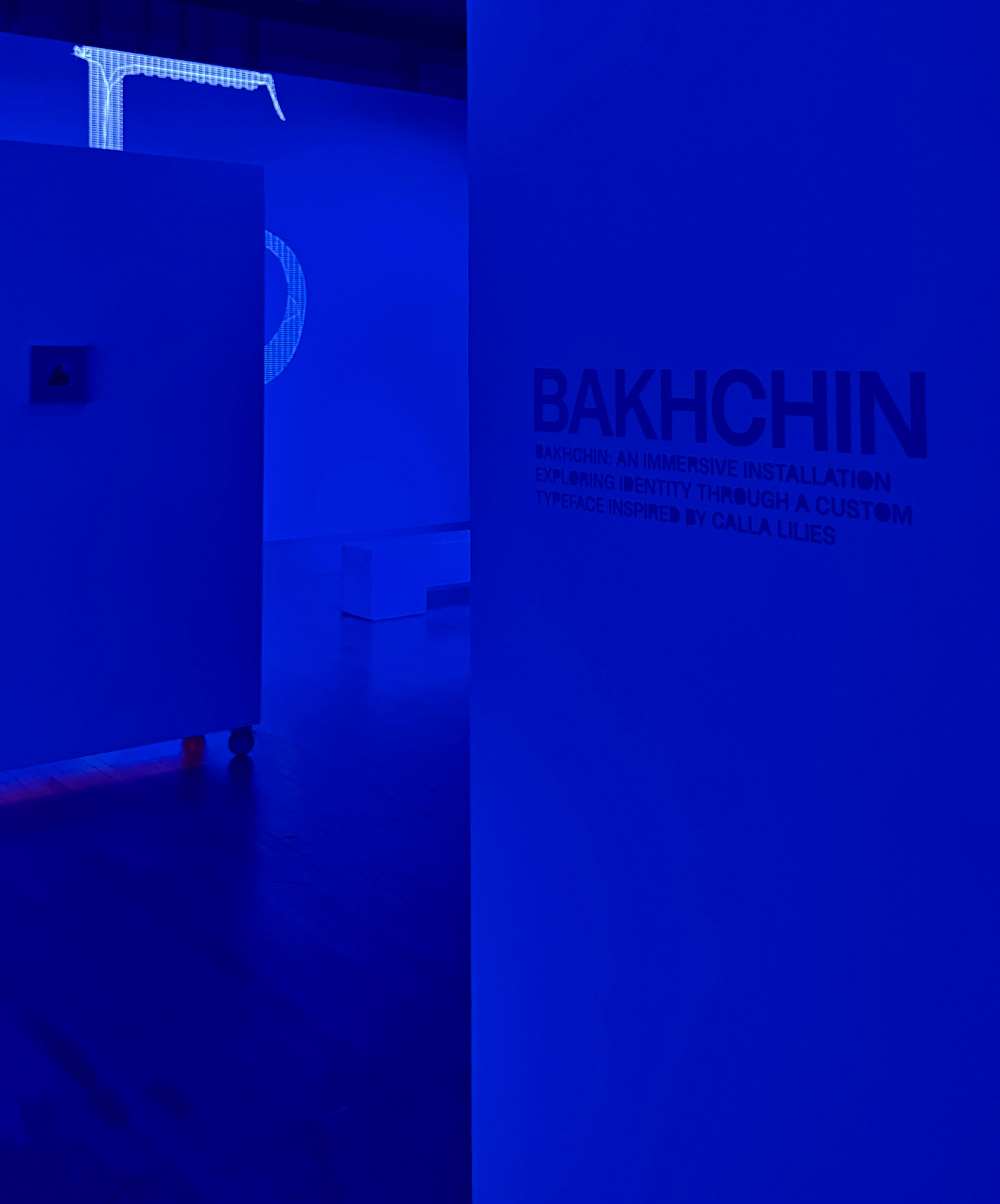 This thesis highlights the creation and application of Bakhchin: an ornamental display typeface developed through a process of typographic deconstruction and cultural reflection. Drawing from personal history as a second-generation American with Georgian, Armenian, and Russian influences, the project explores how language, memory, and identity are interwoven through typographic form. Originating from a core memory and experience of creating Cyrillic letters from a roman alphabet for memorial ribbons in a family floral business, the typeface evolves into an immersive installation exploring themes of identity. Research into experimental typographers and designers—such as Herb Lubalin, Massimo Vignelli, and Eikou Zhang, informs the project’s focus on craft, calligraphy and architectural principles of structure, scale, and spatial interactions. The calla lily, a flower culturally associated with masculinity, becomes the foundational reference for the typeface’s visual characteristics. Words embedded with cultural and personal significance, including terms tied to gender expression, homophobia, and silence are recontextualized to reclaim agency and challenge inherited cultural constructs. The installation features cyanotype prints, embroidery, newsprint, patterns, projection, gold-cut stencils, and an immersive, sanctuary-like environment to examine how typography can function simultaneously as artifact, narrative, and spatial experience. Influences from immersive installations, contemporary art, and floral arrangements shape the multisensory experience of the space. Through these materials, Bakhchin becomes both a typographic system and a tool in exploring themes of reconstruction, queerness, silence, and cultural inheritance. Ultimately, the project positions typography as a medium capable of articulating complex themes. Bakhchin reflects the fragility, fluidity, and resilience of identity as a second-generation American—by reclaiming language as both personal and collective connection, and inviting viewers to encounter identity through form, image, and light— by proudly wearing blue.