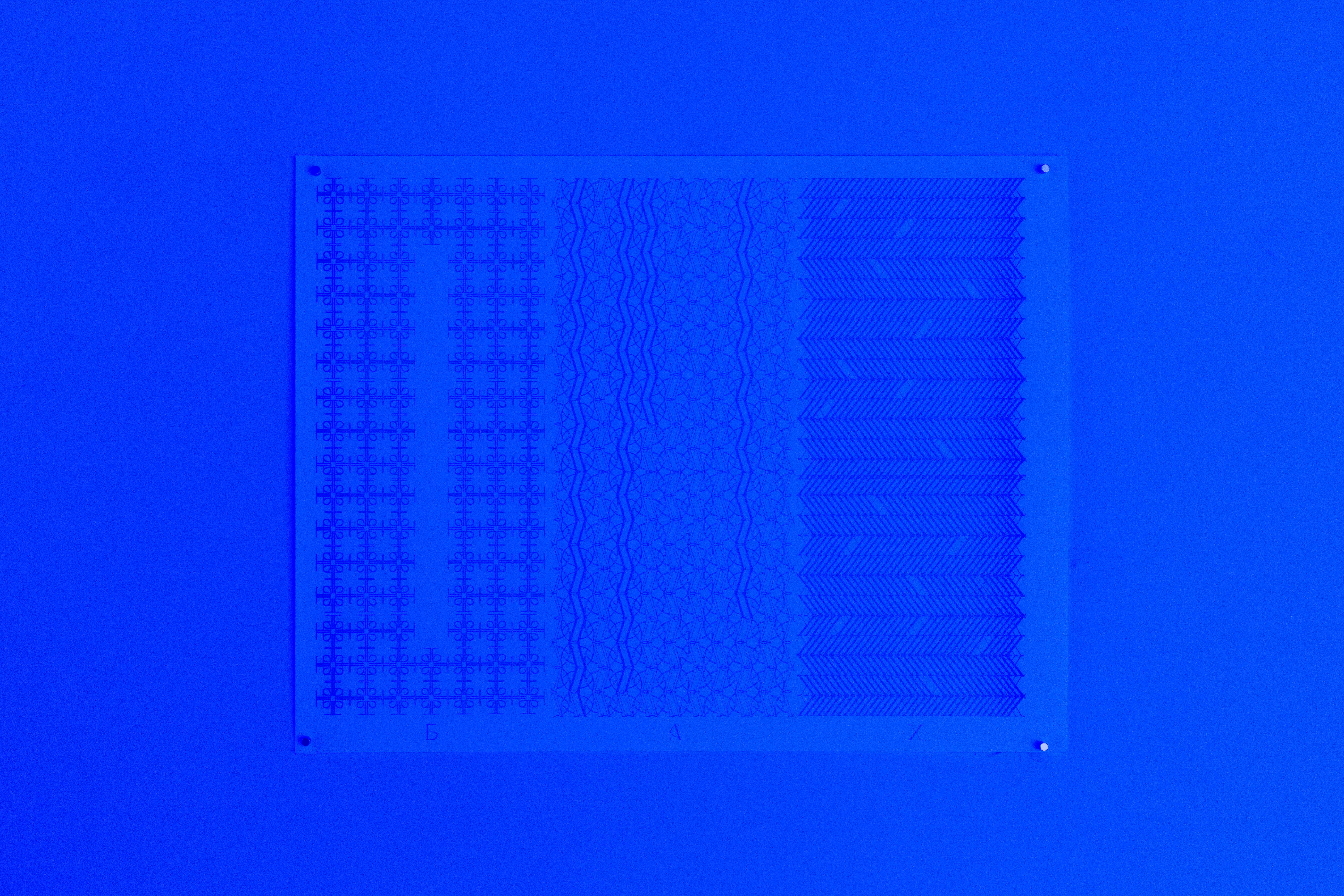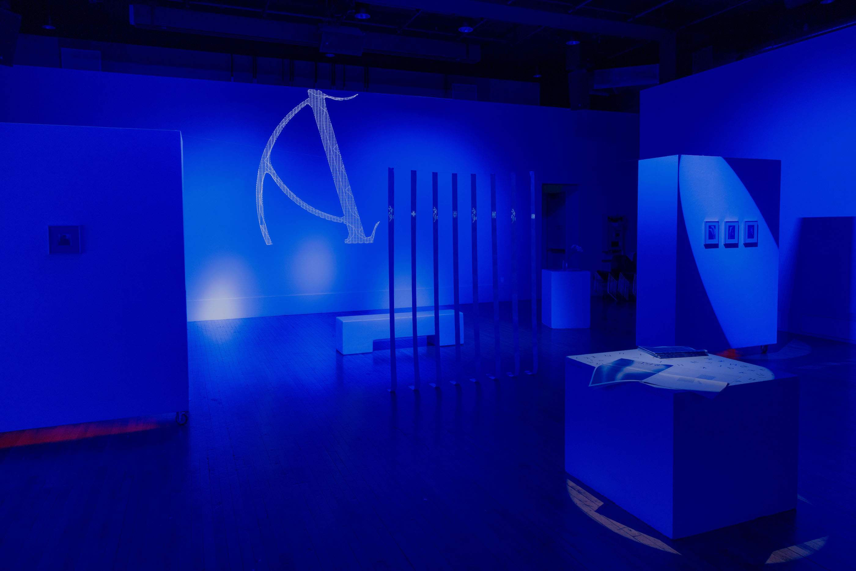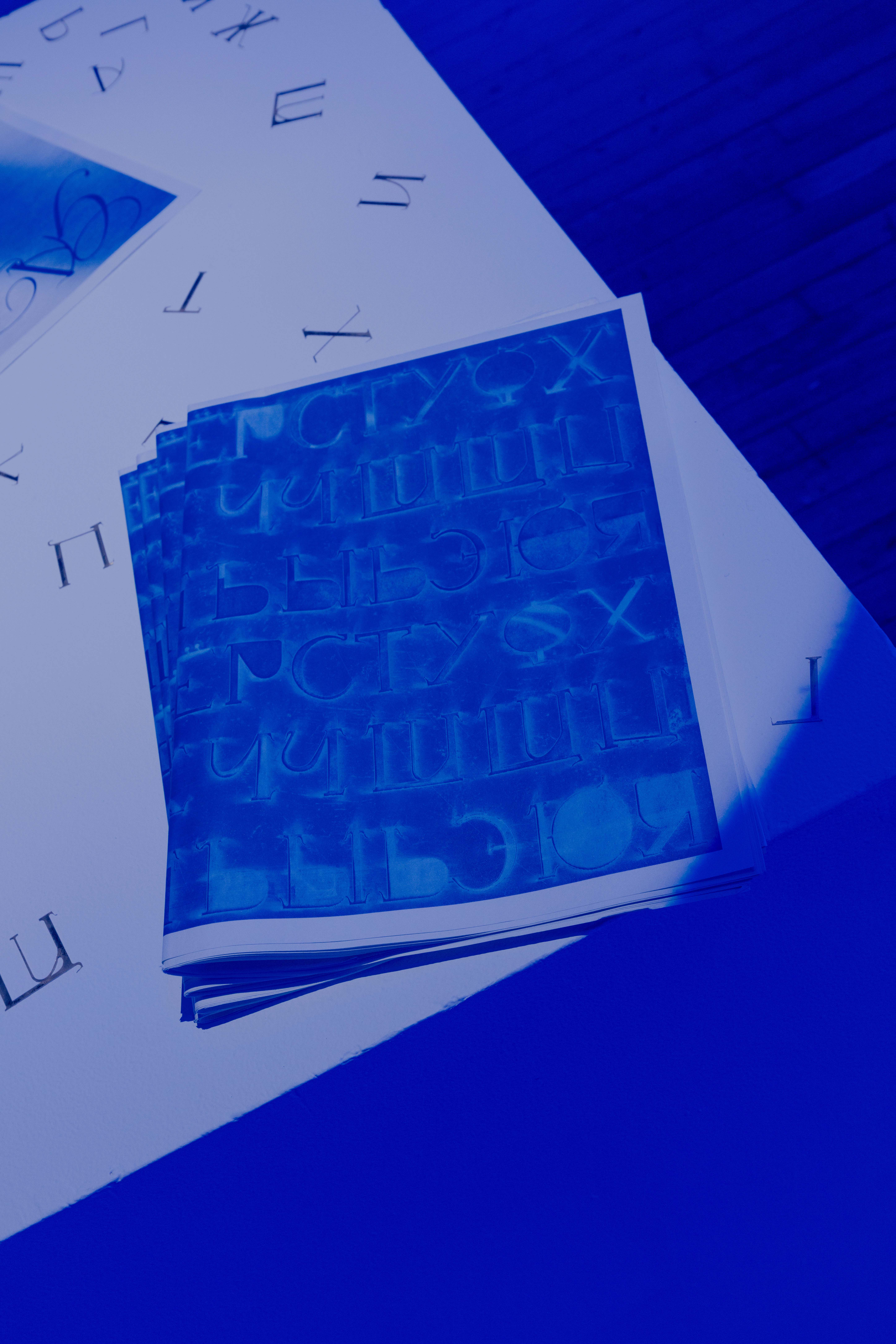 This thesis highlights the creation and application of Bakhchin: an ornamental display typeface developed through a process of typographic deconstruction and cultural reflection. Drawing from personal history as a second-generation American with Georgian, Armenian, and Russian influences, the project explores how language, memory, and identity are interwoven through typographic form. Originating from a core memory and experience of creating Cyrillic letters from a roman alphabet for memorial ribbons in a family floral business, the typeface evolves into an immersive installation exploring themes of identity. Research into experimental typographers and designers—such as Herb Lubalin, Massimo Vignelli, and Eikou Zhang, informs the project’s focus on craft, calligraphy and architectural principles of structure, scale, and spatial interactions. The calla lily, a flower culturally associated with masculinity, becomes the foundational reference for the typeface’s visual characteristics. Words embedded with cultural and personal significance, including terms tied to gender expression, homophobia, and silence are recontextualized to reclaim agency and challenge inherited cultural constructs. The installation features cyanotype prints, embroidery, newsprint, patterns, projection, gold-cut stencils, and an immersive, sanctuary-like environment to examine how typography can function simultaneously as artifact, narrative, and spatial experience. Influences from immersive installations, contemporary art, and floral arrangements shape the multisensory experience of the space. Through these materials, Bakhchin becomes both a typographic system and a tool in exploring themes of reconstruction, queerness, silence, and cultural inheritance. Ultimately, the project positions typography as a medium capable of articulating complex themes. Bakhchin reflects the fragility, fluidity, and resilience of identity as a second-generation American—by reclaiming language as both personal and collective connection, and inviting viewers to encounter identity through form, image, and light— by proudly wearing blue.