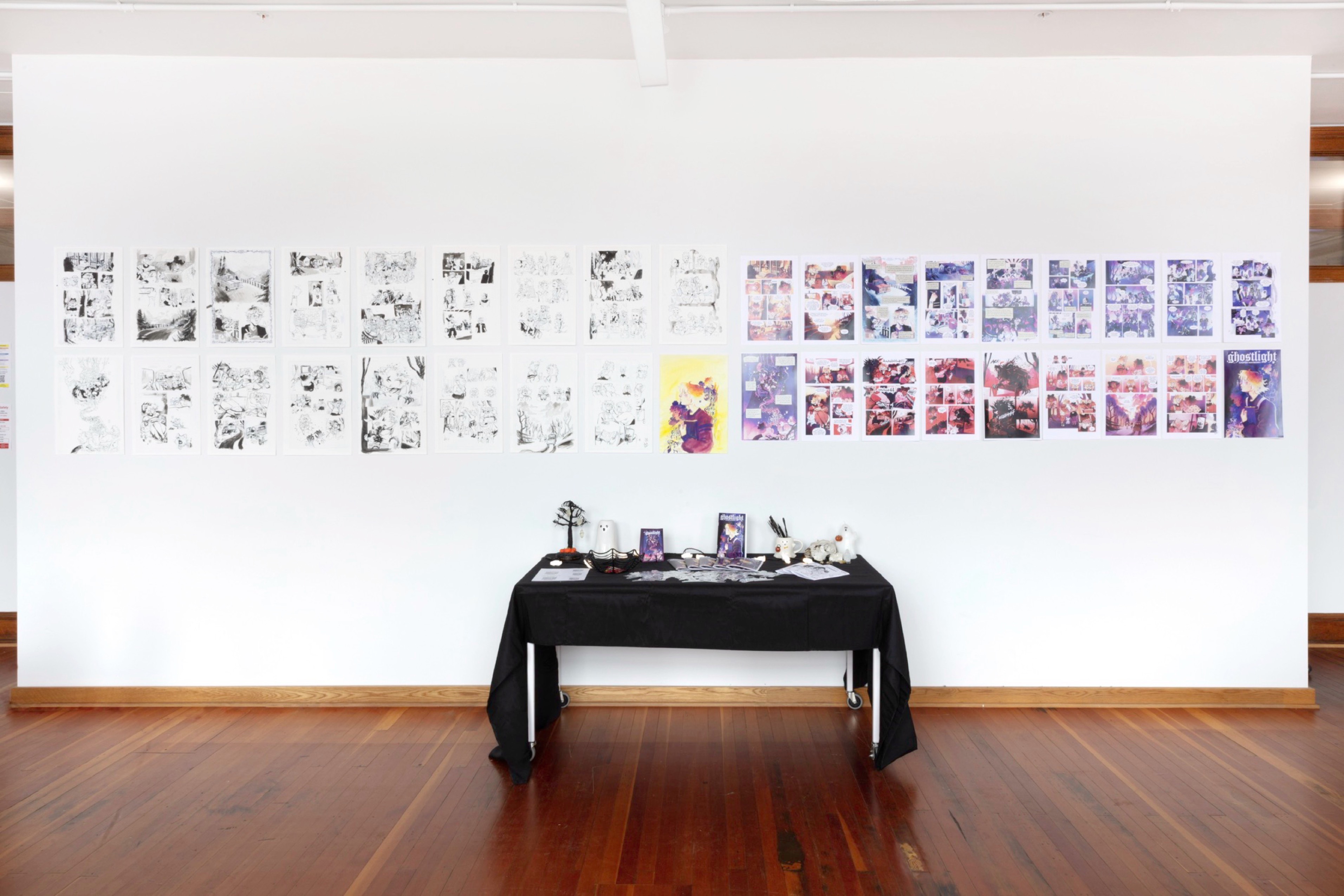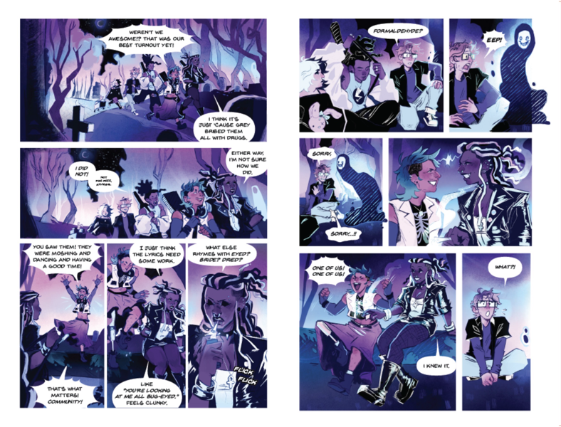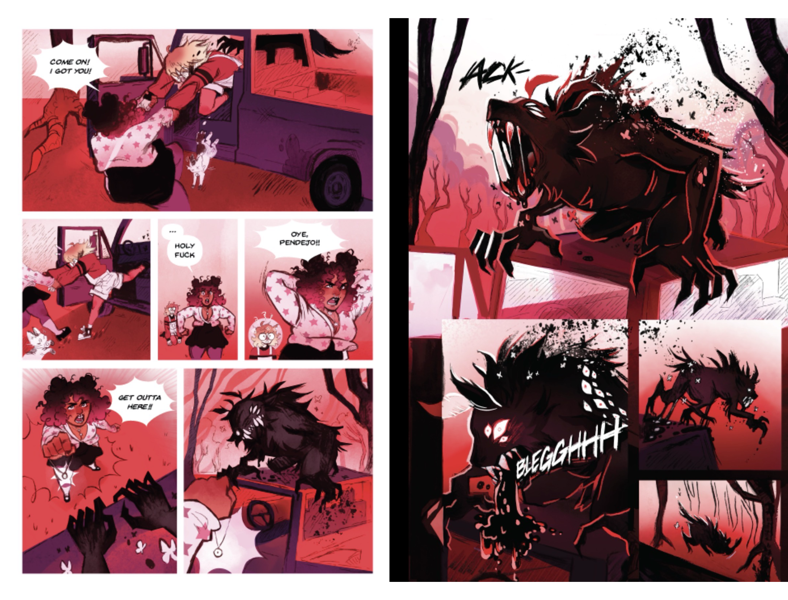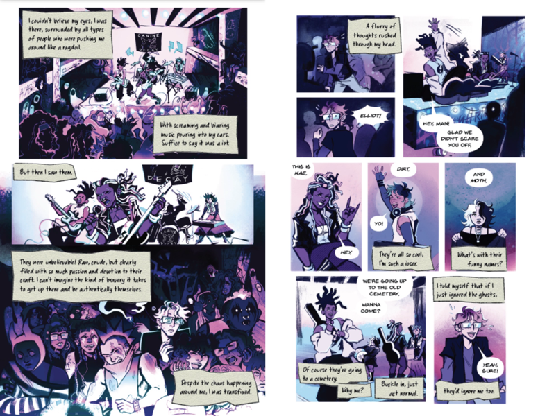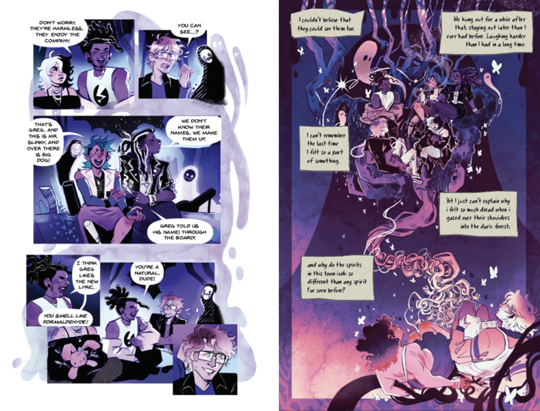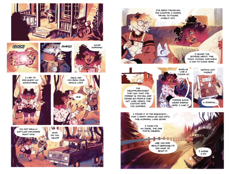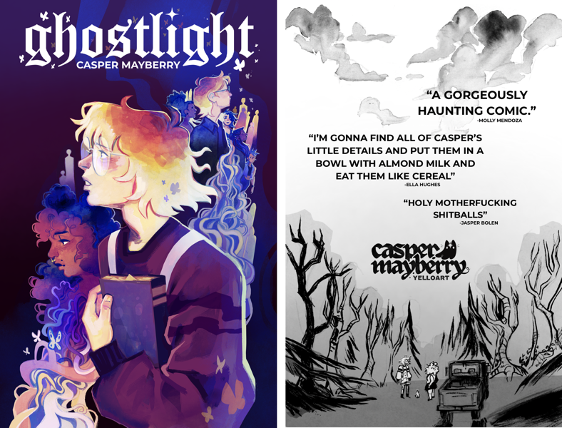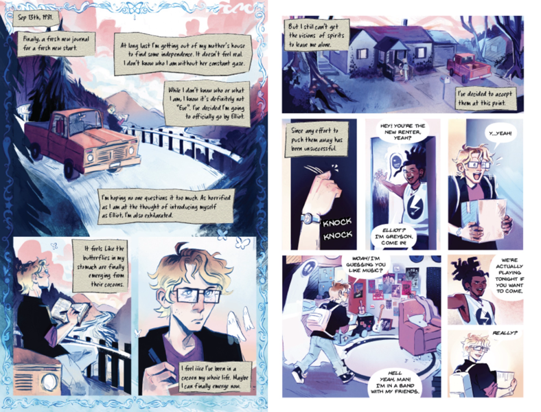 Ghostlight is a graphic novel where Emily Woods, a girl haunted by spirits, searches for her missing father and reveals dark truths along with a danger that stalks her from beyond. This novel explores the intersections of horror, trans identity, and visual storytelling through a story about the experience of feeling “othered” as a trans person, and what happens when the past comes back to haunt the people left behind. My pitch includes 17 full-color pages created with analog ink and digital coloring, along with character, prop, and environment development to establish the visual language and narrative pacing for a full 300-page graphic novel.
