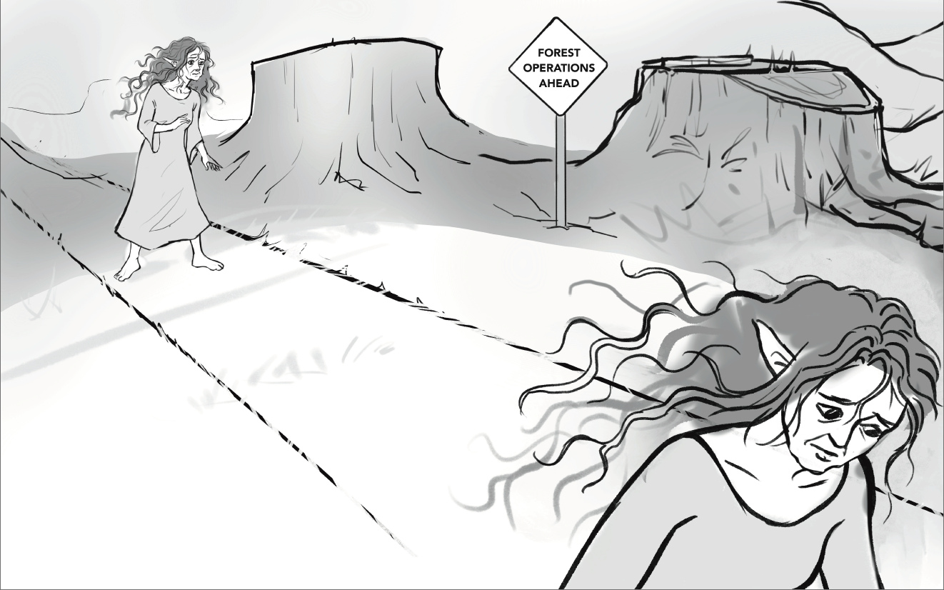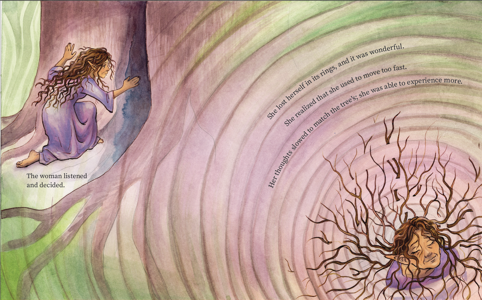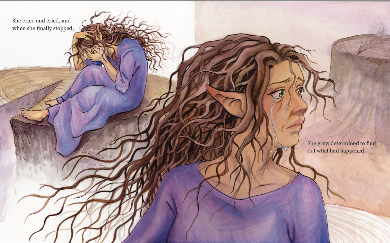 enviromental grief, picturebook, nymp, childrensbook, watercolor, mixed media, old-growth trees