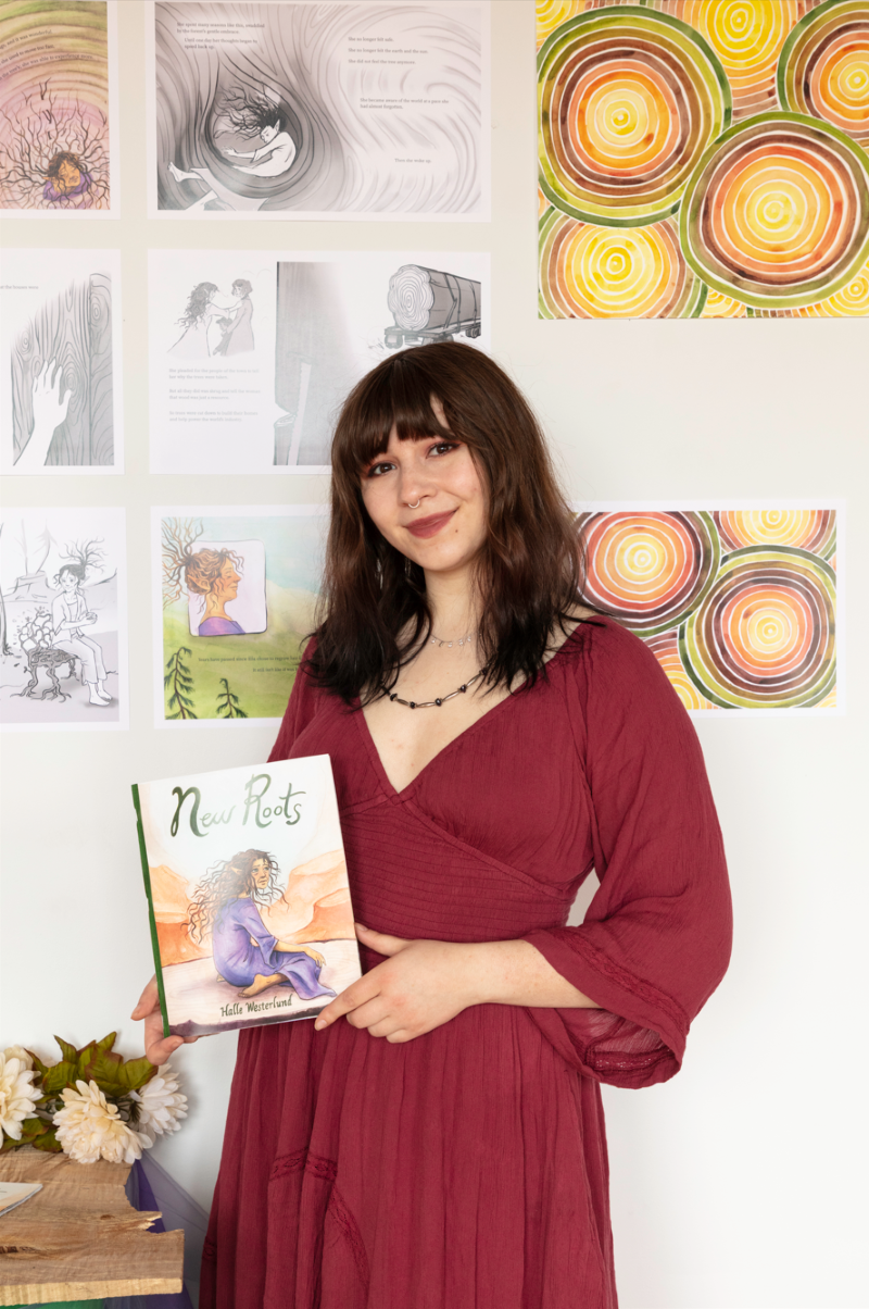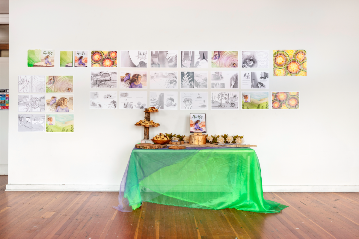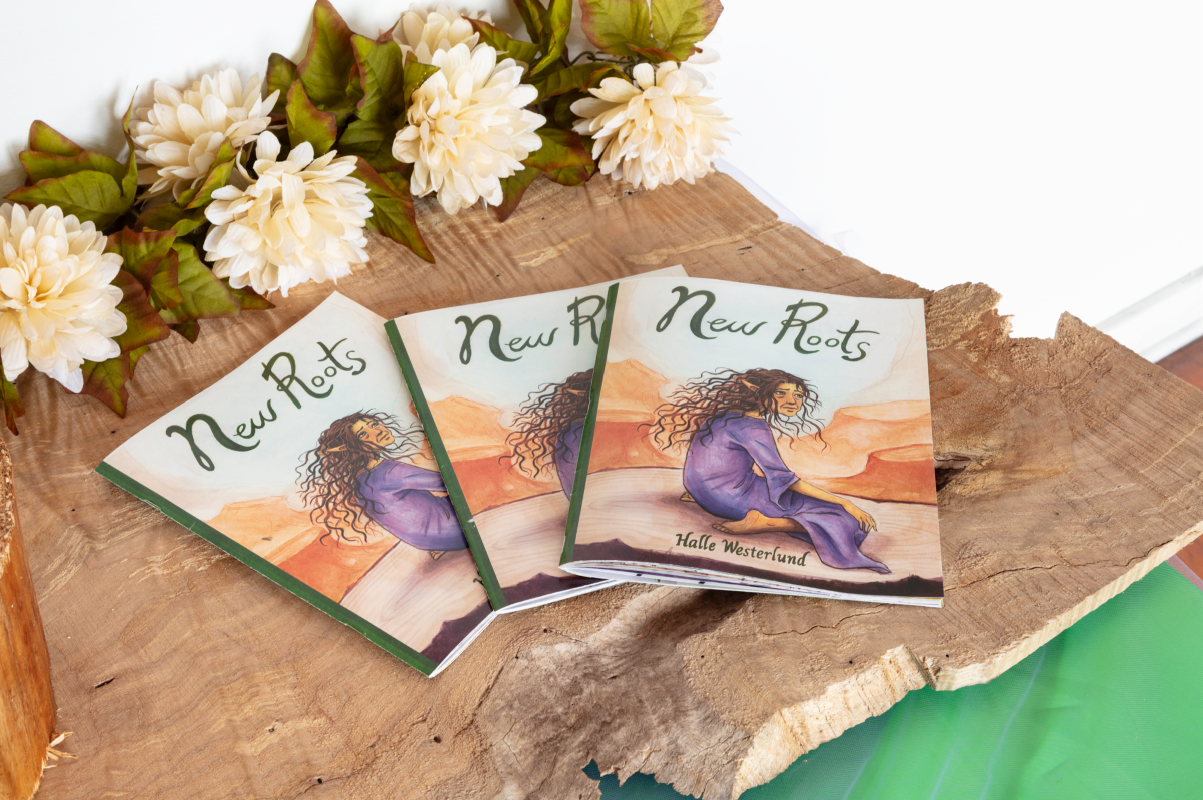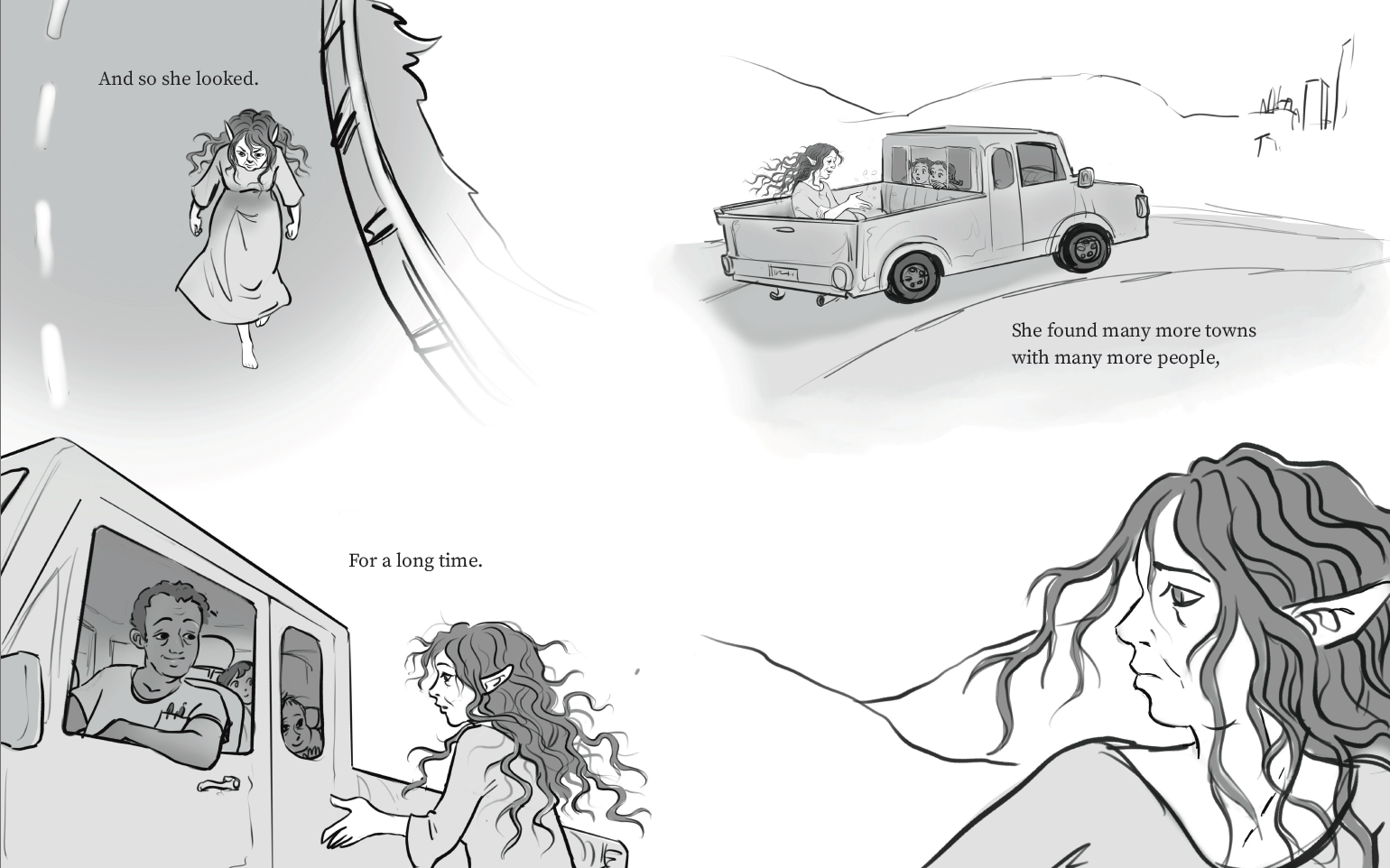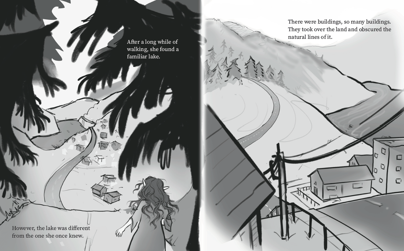 New Roots is a 40-page, self-ended picture book dummy, exploring themes of environmental grief, specifically around the loss of old-growth forests. While New Roots is targeted to children ages six to eight, the book can be enjoyed by any person grappling with grief for the environment. The story follows a Nympe as she explores a modern world, comes to terms with the loss of her forest, and learns new hope in new beginnings.