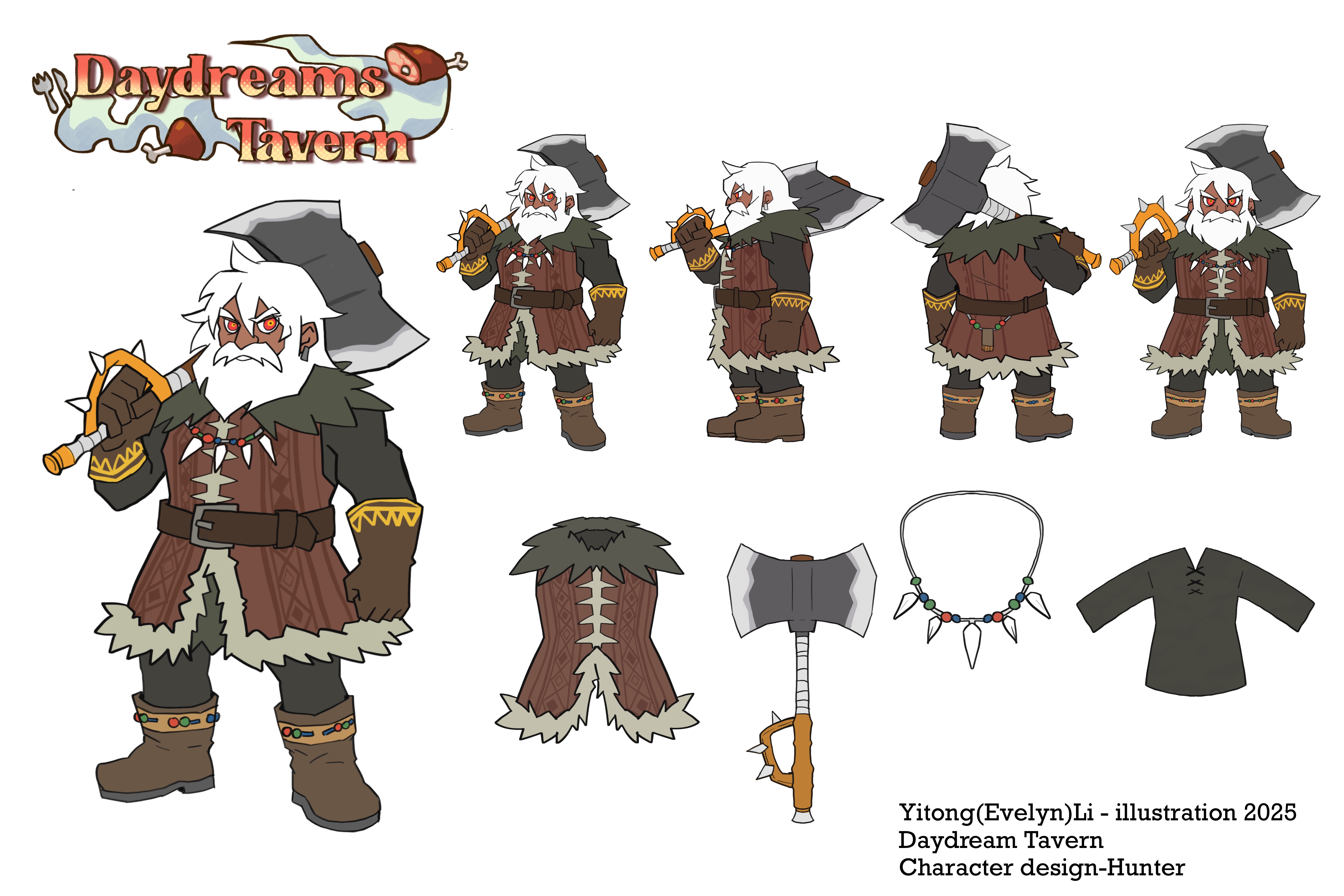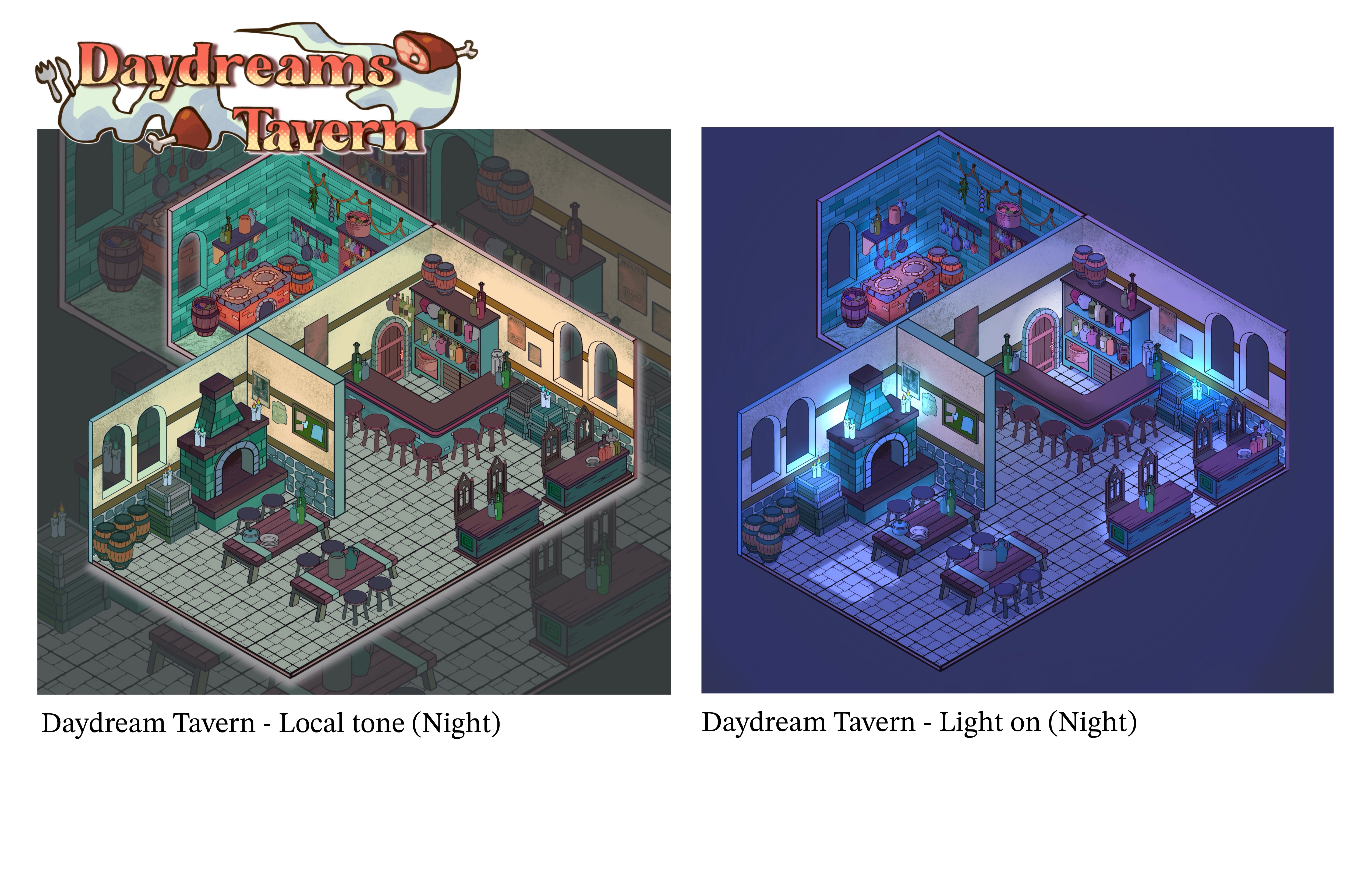 Daydream Tavern is a worldbuilding project that focuses on character design and interior design. This worldbuilding concept is suited for industries such as game development. But I do not focus on game development or story writing; I Focus only on design and visual arts part. Daydream Tavern, is a small riverside tavern standing along a stream that flows toward the sea. Its setting is inspired by Europe in the 1980s and 1990s. During the day, travelers stop by to rest and enjoy familiar meals. The atmosphere feels peaceful, yet there is an odd sense of mystery surrounding the place. People are curious about this mysterious tavern, as it is said that you can find some unusual ingredients there. But what truly sets this tavern apart is what happens after sunset. At night, the tavern serves only monsters, and humans cannot pass through its doors. Even the owner herself is not entirely human, at a certain time, she transforms from her human appearance into a monster so she can serve the nighttime monster guests.