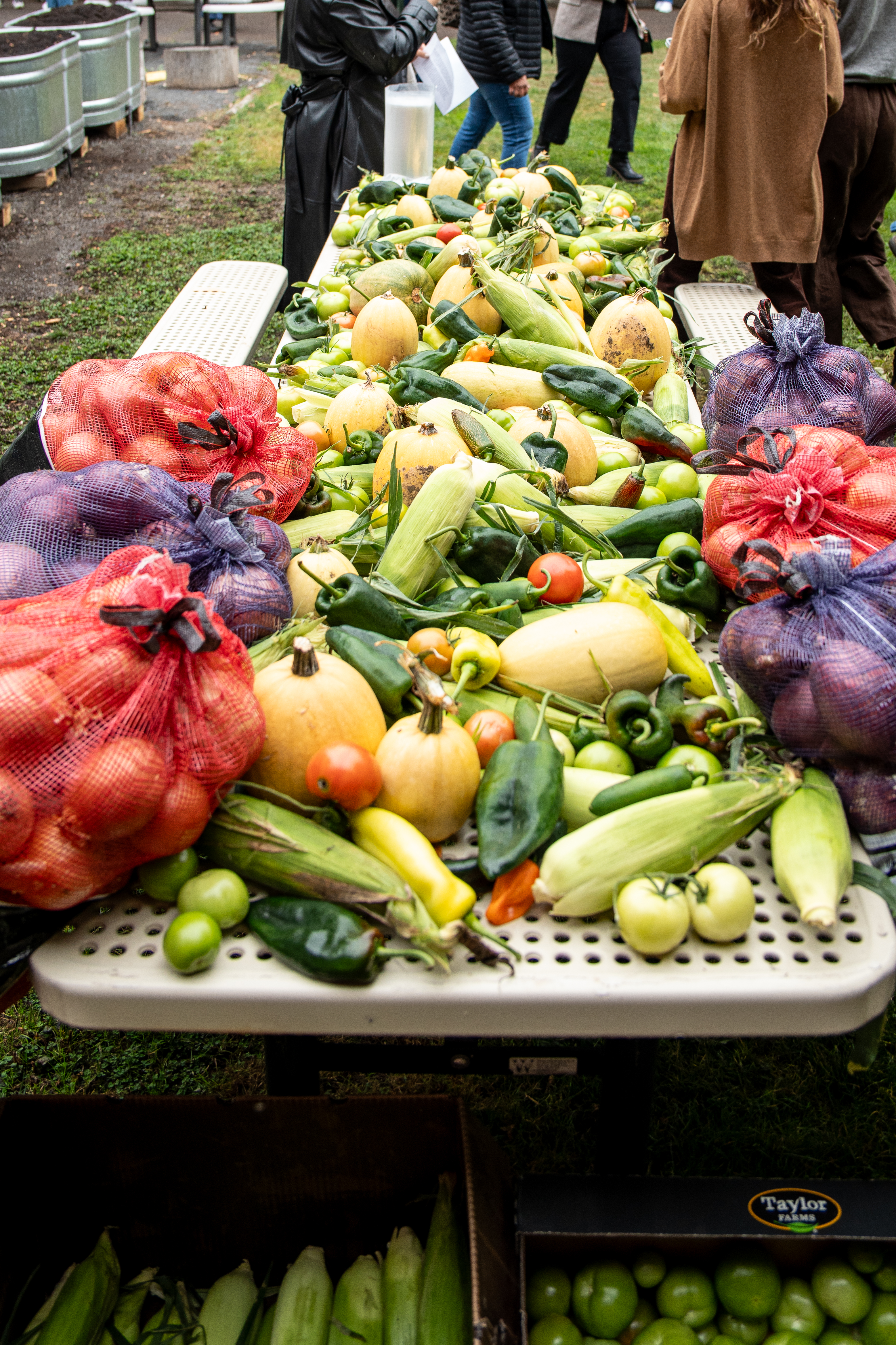 Photograph of a picnic table filled with vegetables harvested by Mr. Alfonso Guzmán, shared with attendees of his dedication ceremony.