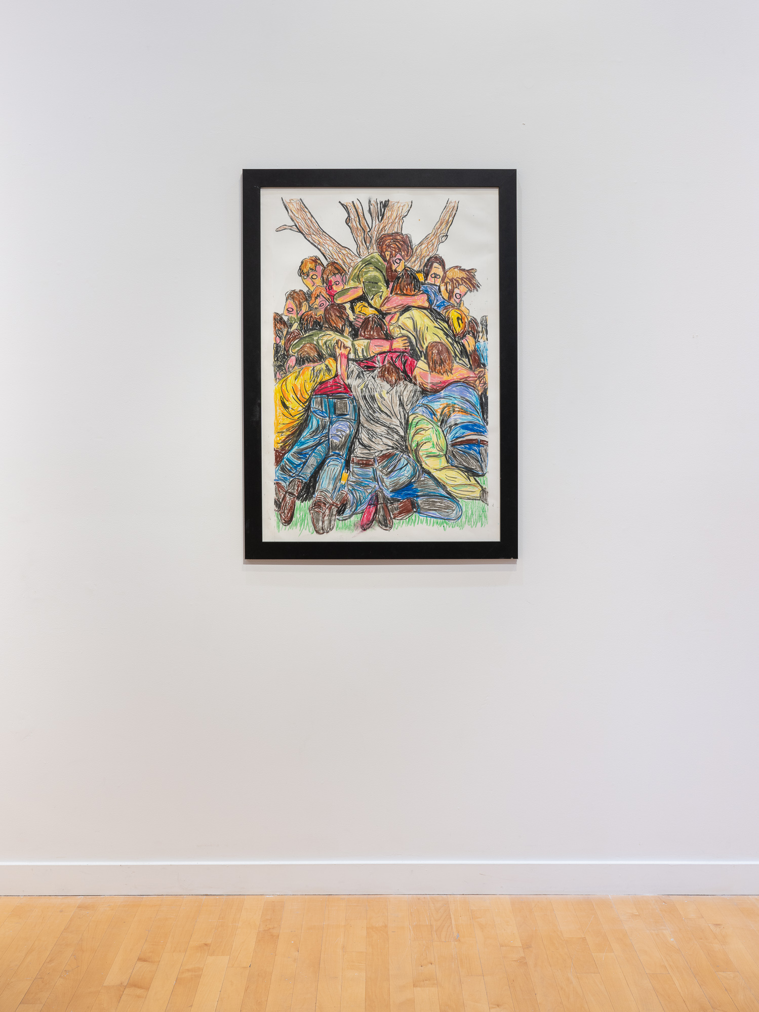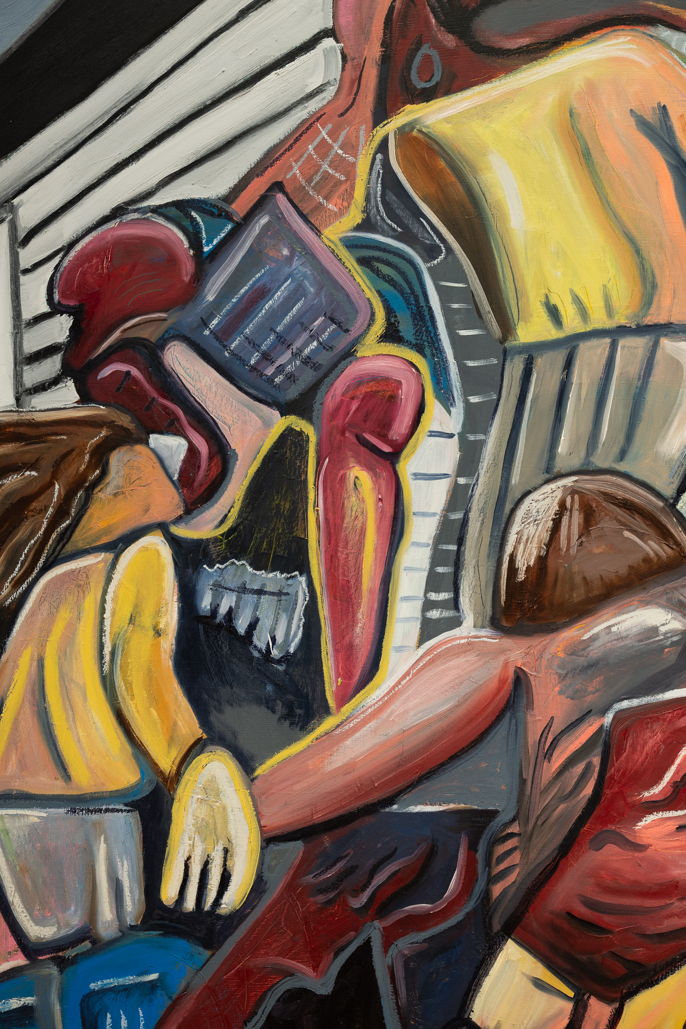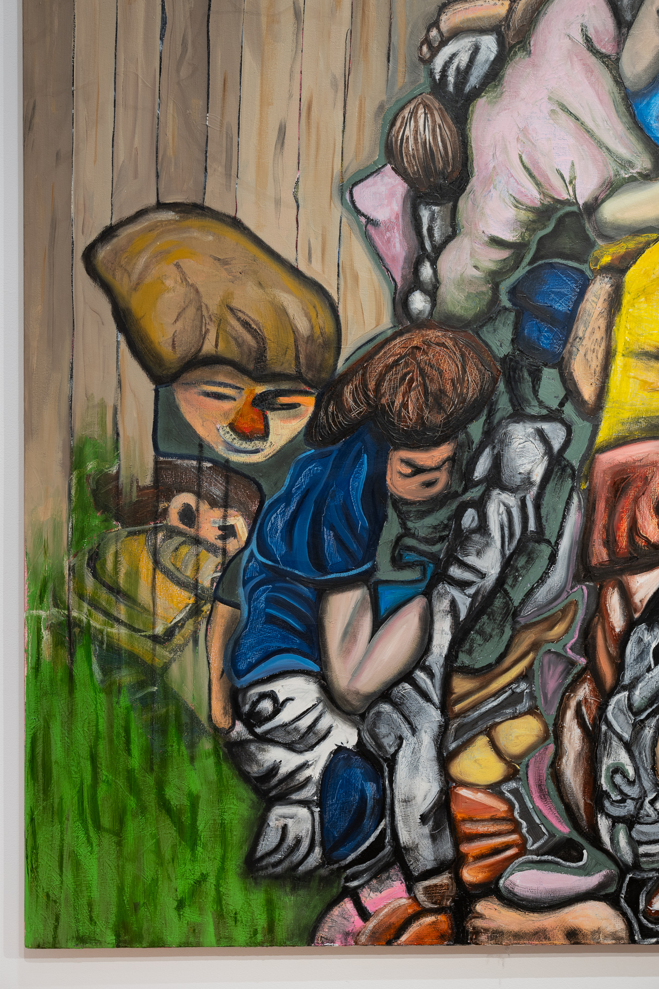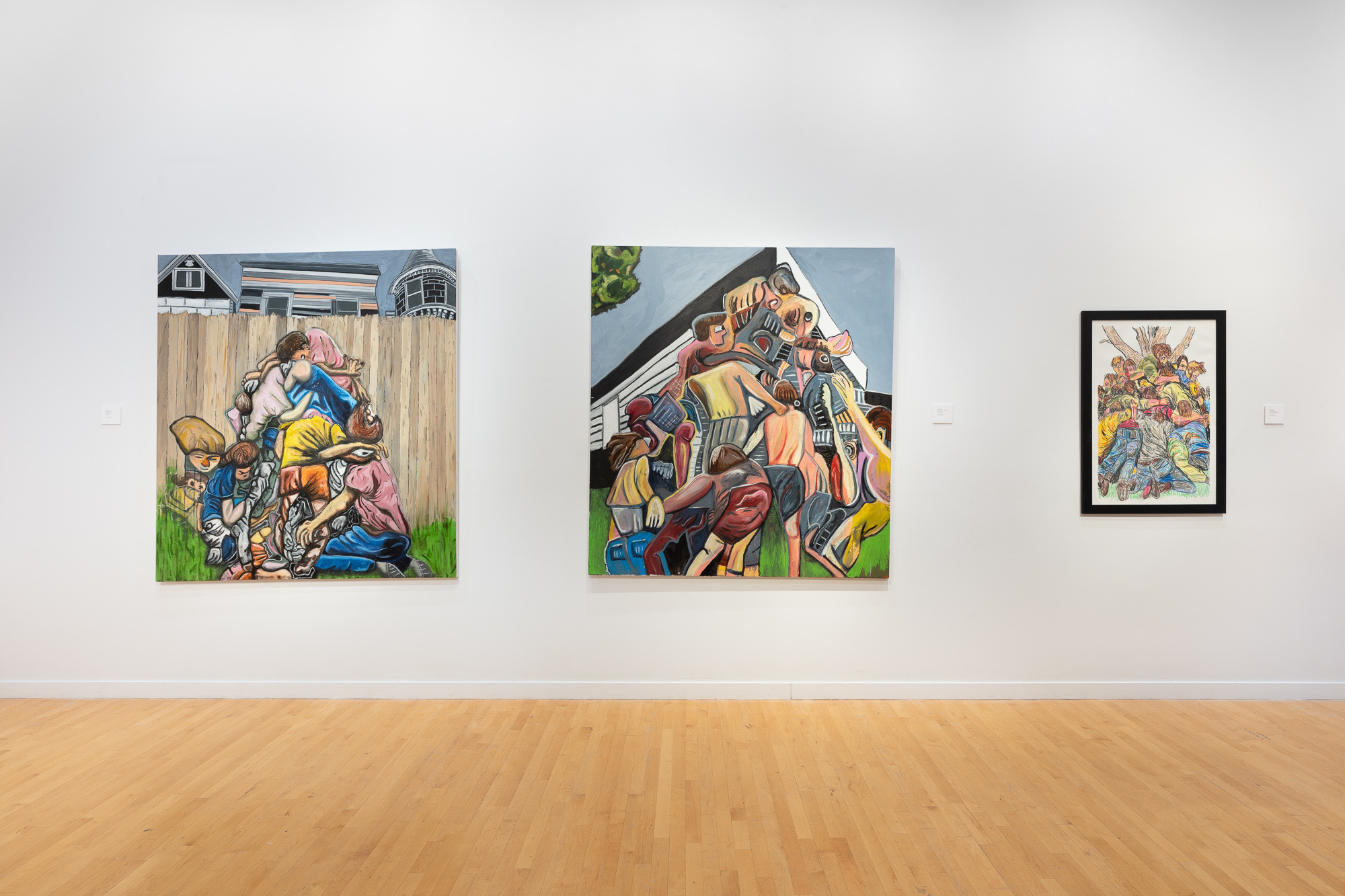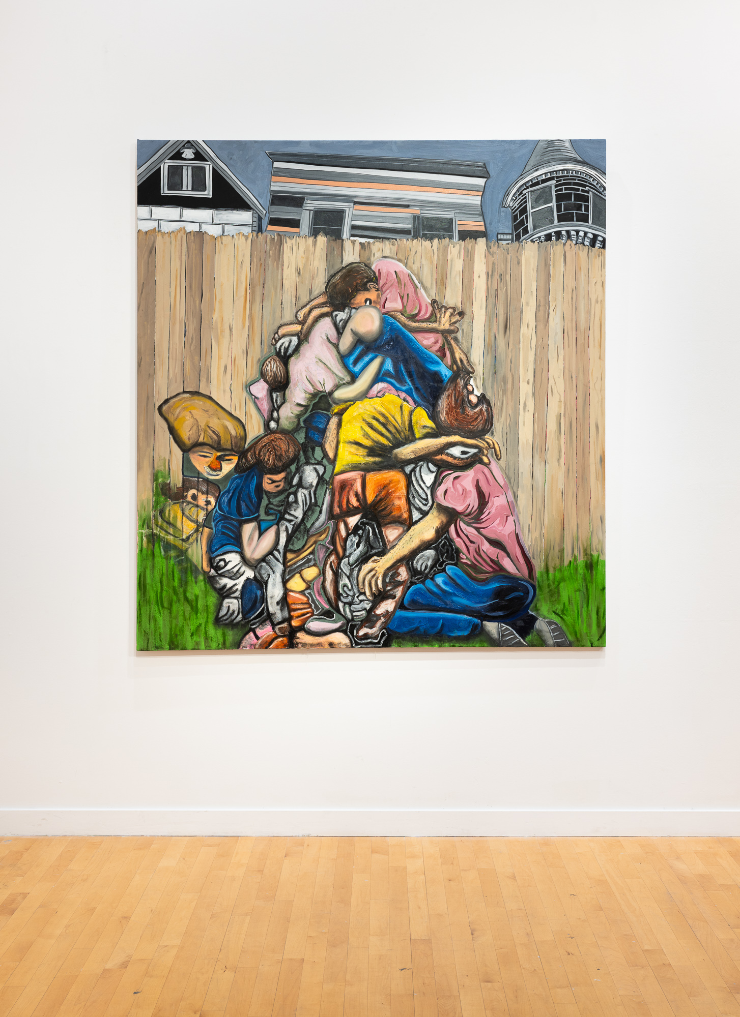 These works are not literal depictions of past events, but emotional reconstructions. I often start with a specific fragment—a cracked sidewalk, a chain-link fence, the tangle of limbs during a backyard brawl—and let the painting evolve from there. Figures dissolve into landscape, spaces flatten or twist, and forms repeat or vanish entirely. I lean into ambiguity, trusting the process to mirror the uncertainty of memory itself.