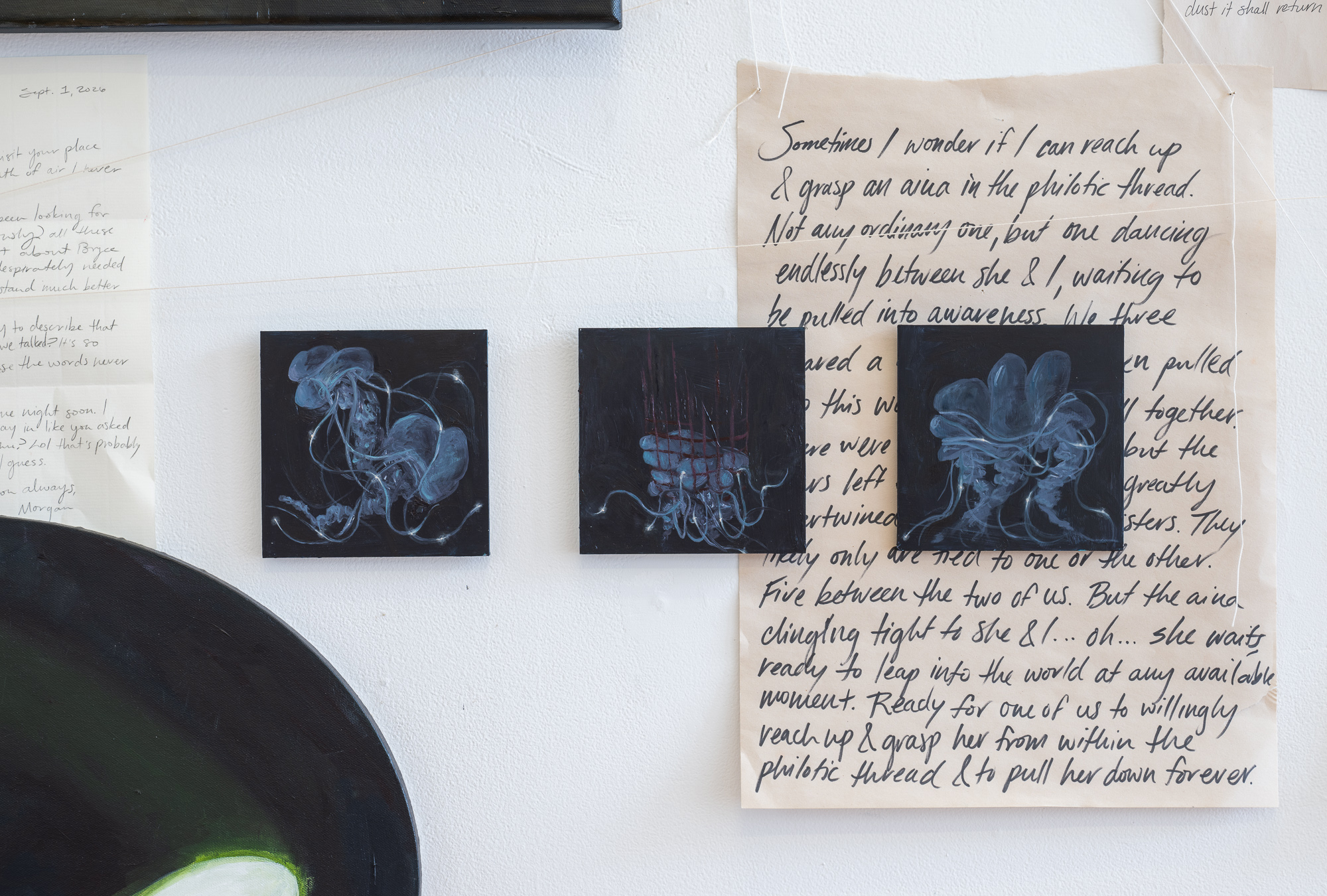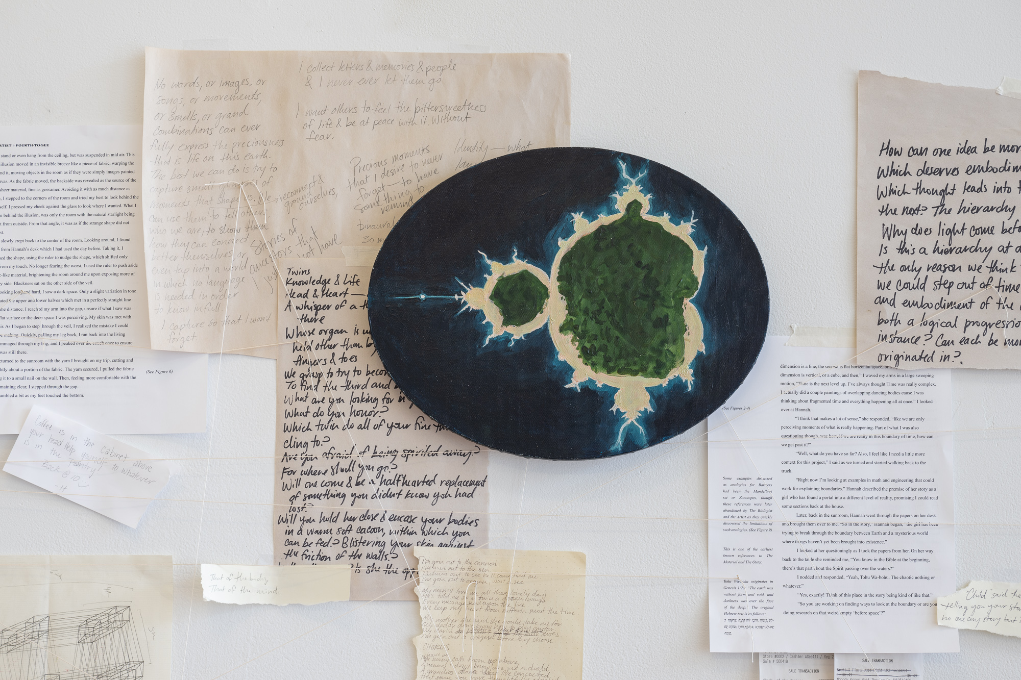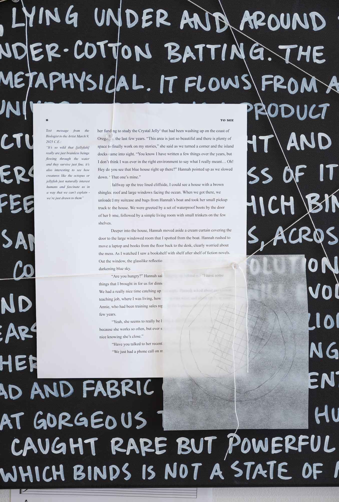 Stories form the backbone of human understanding, spirituality, and cultural evolution. They can expand our conceptual frameworks and excite a desire for deeper knowledge as they push beyond the boundaries of the known into the realm of "what if." In Gary Zukav's The Dancing Wu Li Masters, he suggests that "it is possible that scientists, poets, painters and writers are all members of the same family of people whose gift it is by nature to take those things which we call commonplace and to re-present them to us in such ways that our self-imposed limitations are expanded." To See: The Mystery of the Binding Threads is a project dedicated to the re-presentation of ideas discovered within quantum physics. It draws inspiration from stories I have both read and written over recent years—narratives centered on characters who discover realms where all things emerge from the Weave, a woven network in constant flux, shaped by human choice. Through written and painted works, I crafted a personal cosmology with the Weave at its center. It highlights the ways in which our sensory experience is limited and speculates on ways in which we can see more. Through the act of creation, we have the ability to reveal these mysterious threads of life and potentially manipulate their pattern. Though other mediums provide entry points for understanding the Weave, this series utilizes my primary medium of painting. The works either visualize elements from the accompanying story or interpret the Weave's impact on real-world experience through symbolism.