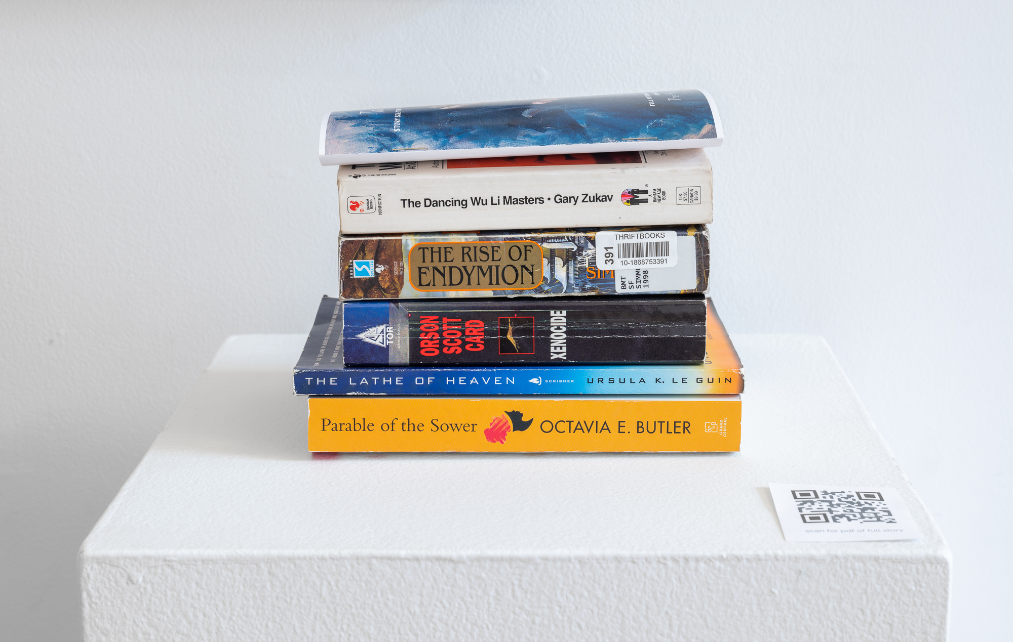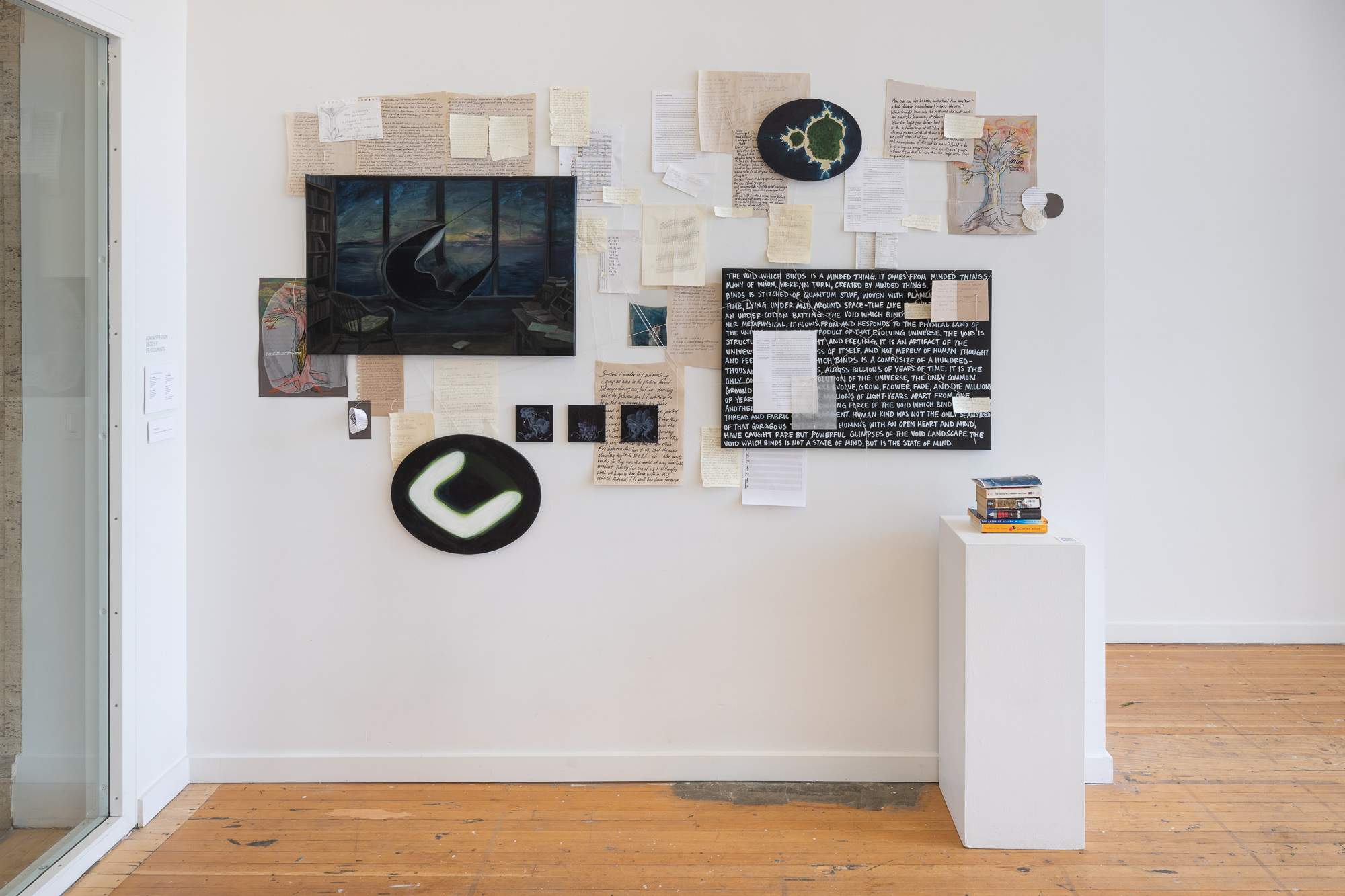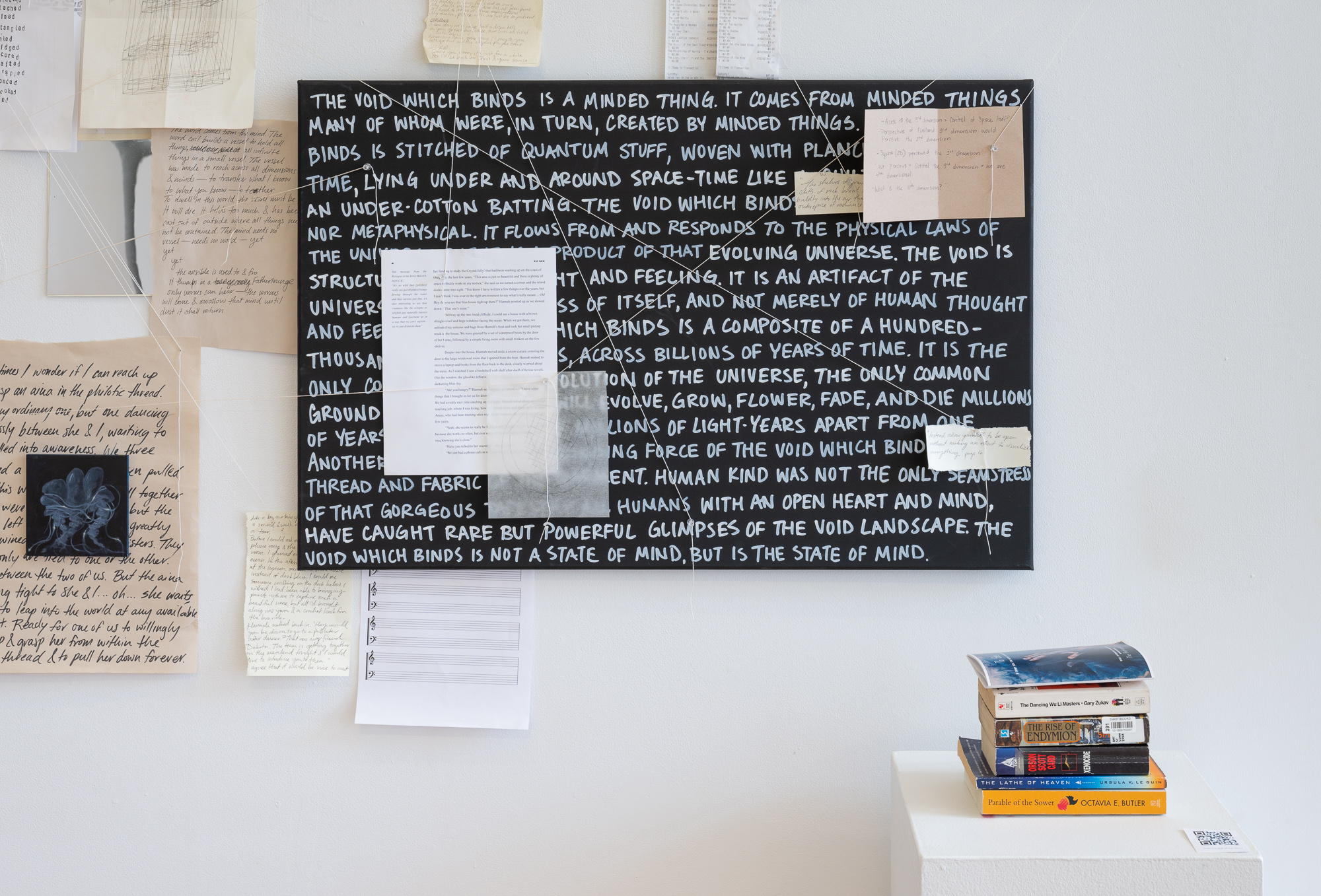 Stories form the backbone of human understanding, spirituality, and cultural evolution. They can expand our conceptual frameworks and excite a desire for deeper knowledge as they push beyond the boundaries of the known into the realm of "what if." In Gary Zukav's The Dancing Wu Li Masters, he suggests that "it is possible that scientists, poets, painters and writers are all members of the same family of people whose gift it is by nature to take those things which we call commonplace and to re-present them to us in such ways that our self-imposed limitations are expanded." To See: The Mystery of the Binding Threads is a project dedicated to the re-presentation of ideas discovered within quantum physics. It draws inspiration from stories I have both read and written over recent years—narratives centered on characters who discover realms where all things emerge from the Weave, a woven network in constant flux, shaped by human choice. Through written and painted works, I crafted a personal cosmology with the Weave at its center. It highlights the ways in which our sensory experience is limited and speculates on ways in which we can see more. Through the act of creation, we have the ability to reveal these mysterious threads of life and potentially manipulate their pattern. Though other mediums provide entry points for understanding the Weave, this series utilizes my primary medium of painting. The works either visualize elements from the accompanying story or interpret the Weave's impact on real-world experience through symbolism.
