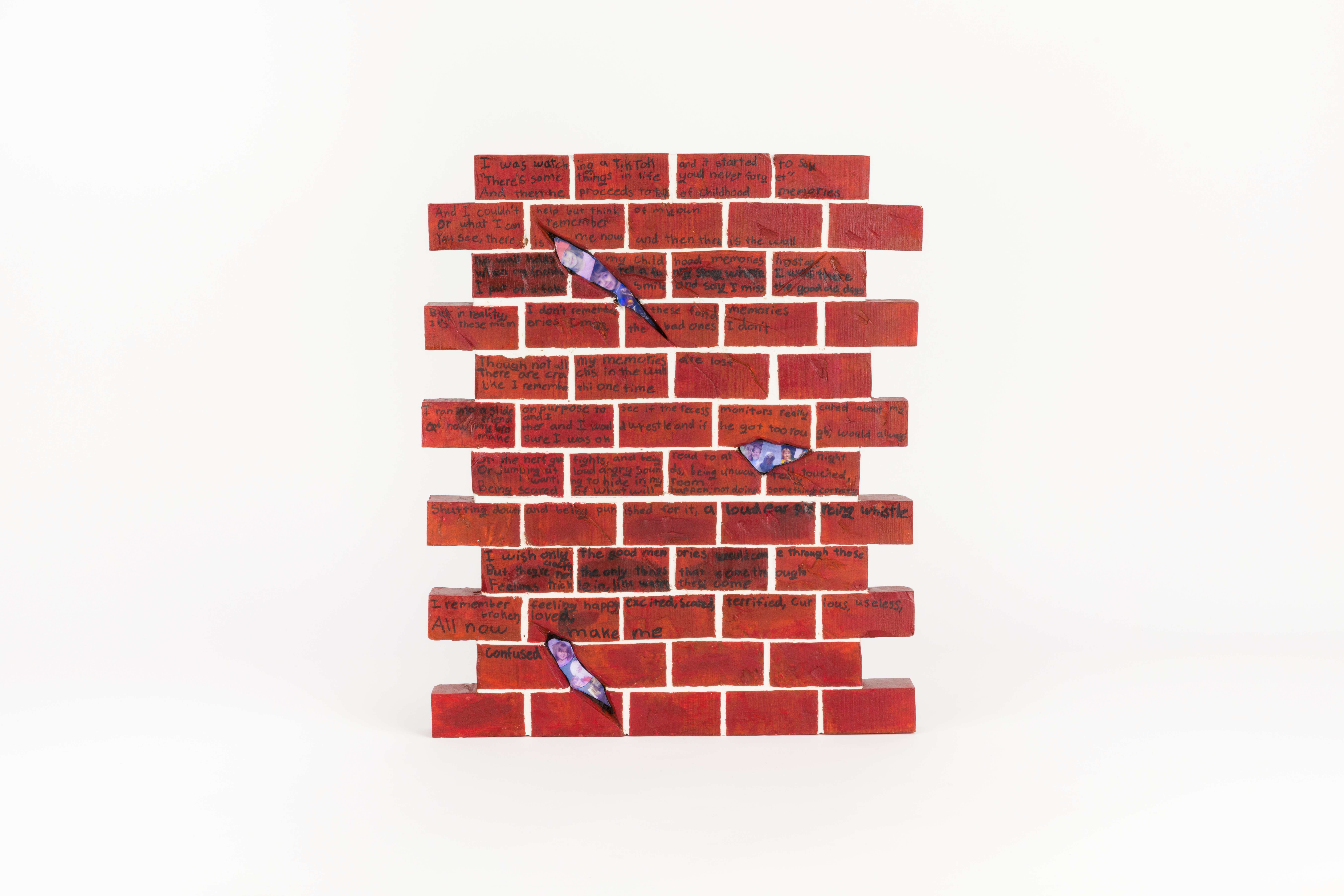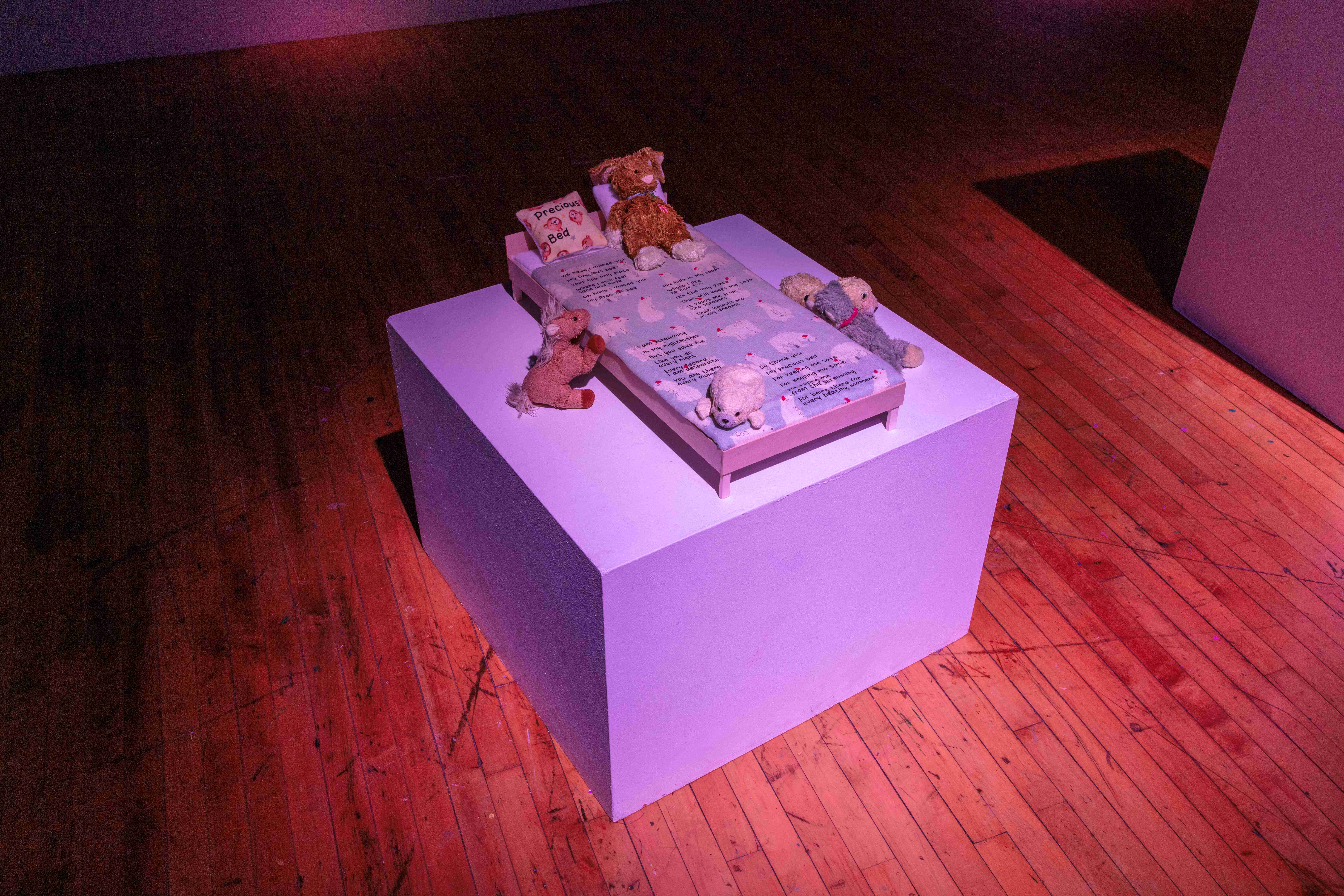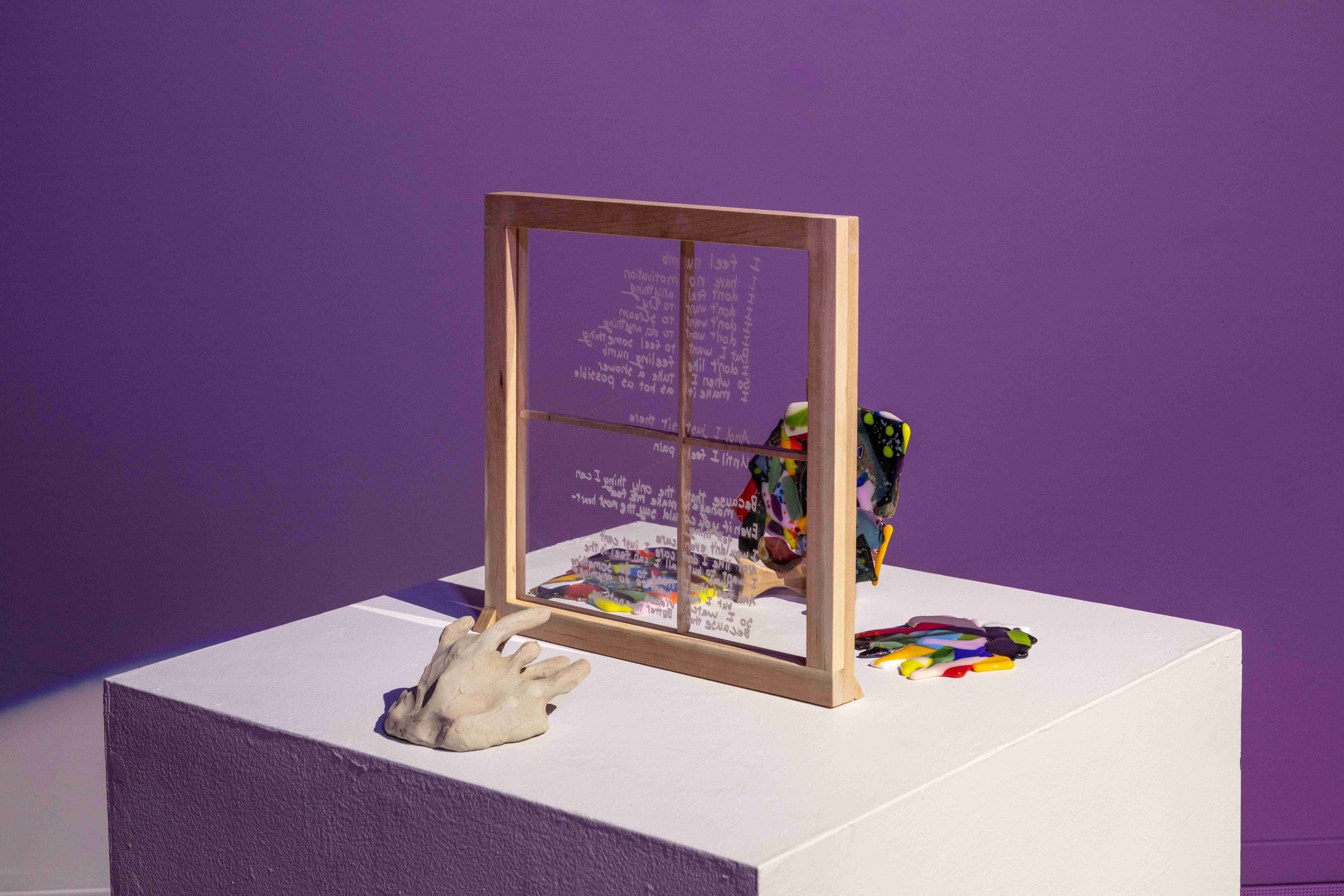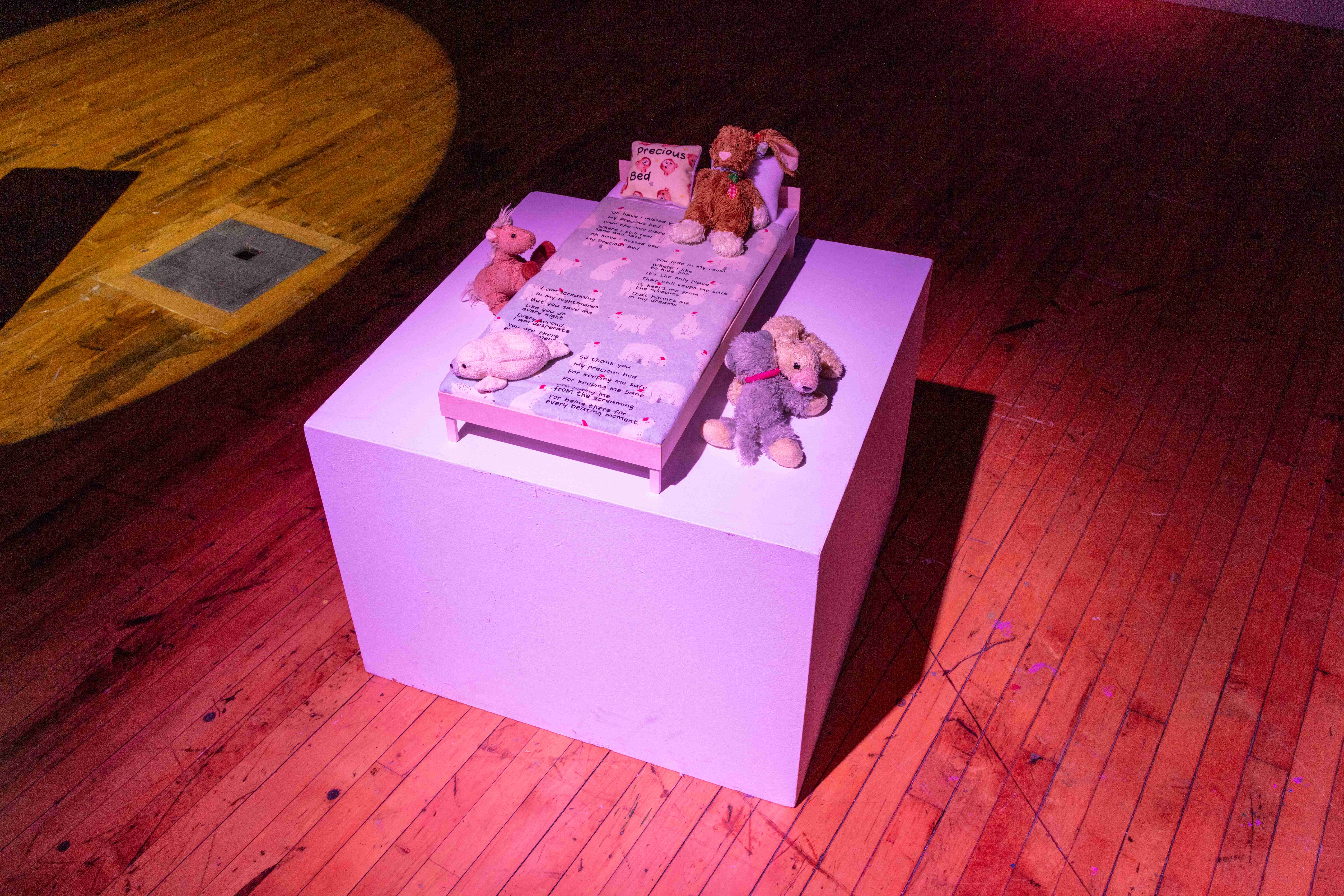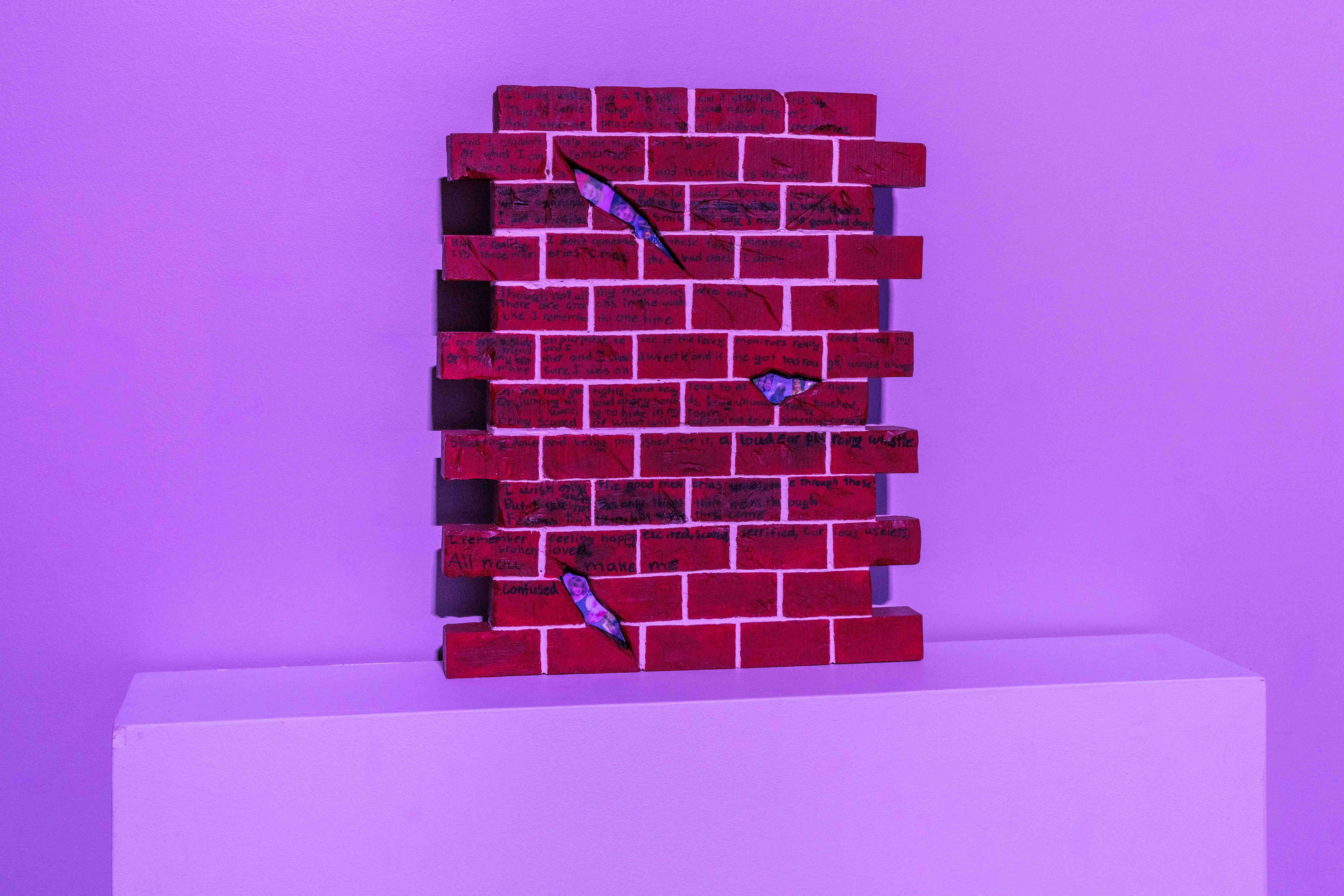 The content of this work looks into my past, where childhood abuse took place from around the ages of 8–15. The intent behind this work is to take the poems that I wrote during this time and poems that I have written to my younger self and bring them into physical space. In doing this, it allows me to process what I went through so I can begin to heal from my childhood trauma.