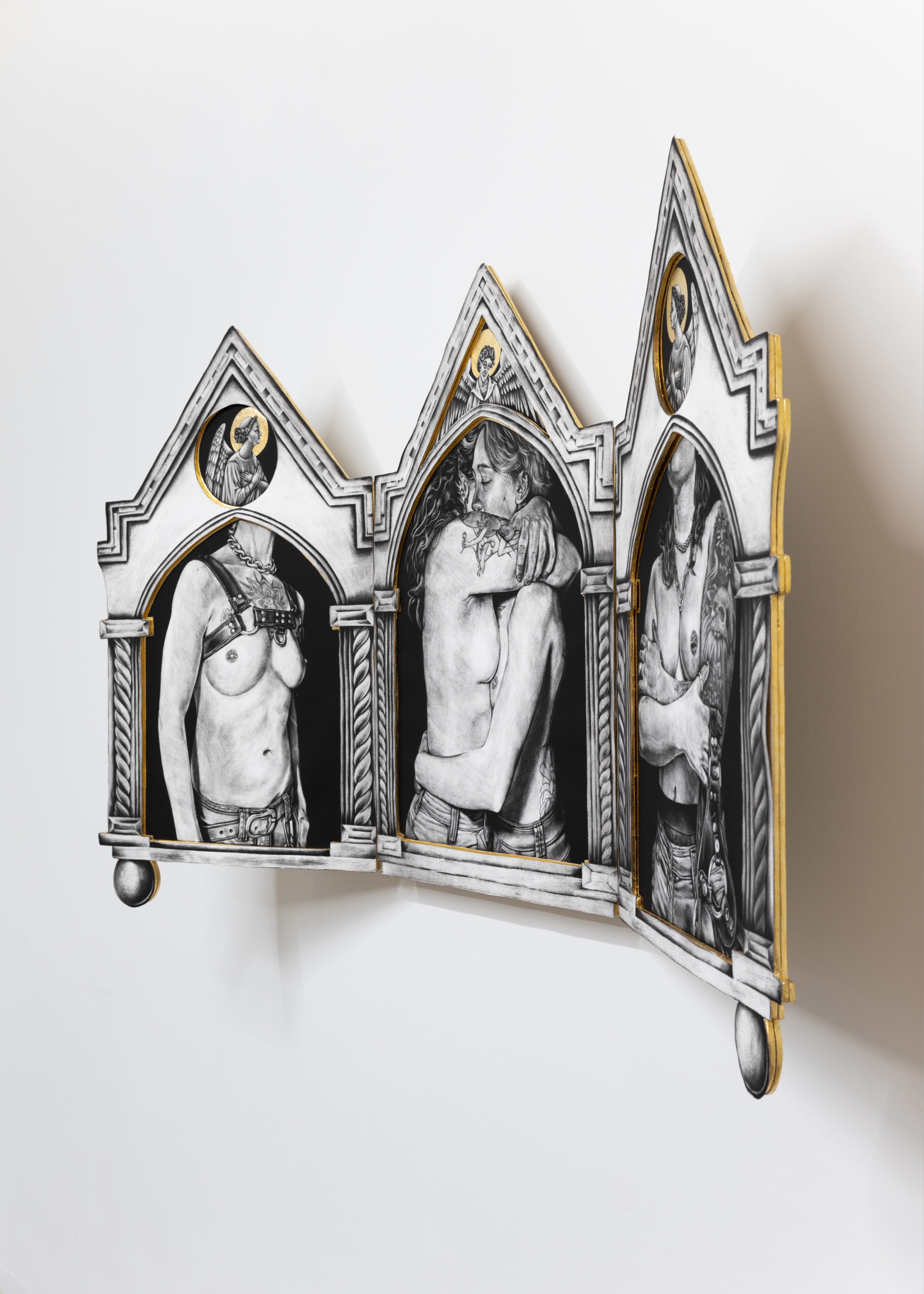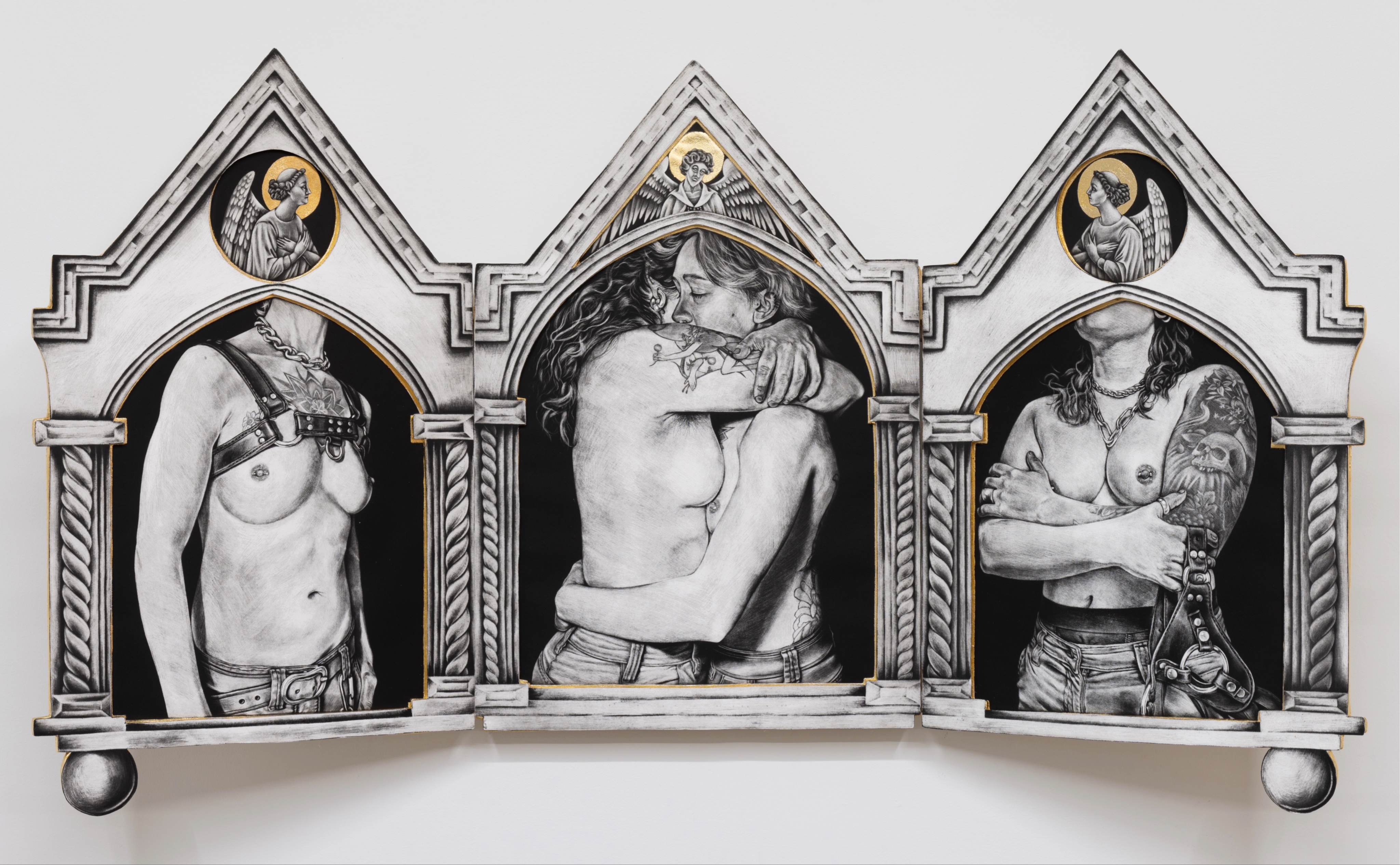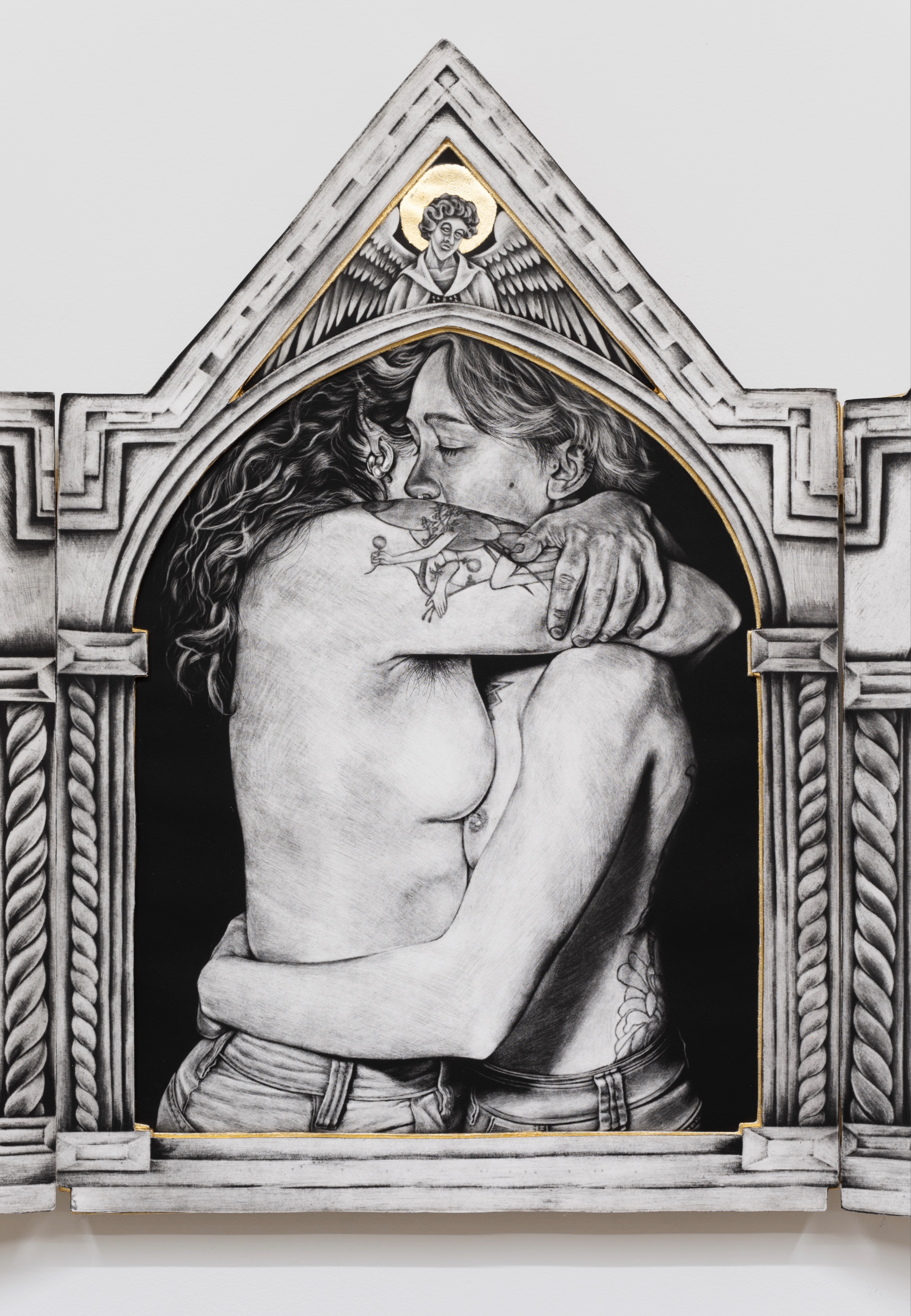 As a queer person I see the tender devotion that members of this community have for each other, and the subsequent need to deconstruct the binary matrix of the heteronormative world. By appropriating the imagery and aesthetics of the Catholic Church I seek to imbue these works with the aura and culturally accepted authority of religious art and sacred spaces. Not only is the imagery an act of devotion, but the making of these objects is as well. Intaglio, and more specifically mezzotints, are laborious etching processes that require an almost religious devotion to the medium. Through the countless hours of preparing plates and burnishing and scraping, the intimacy extends beyond the images themselves into their creation.