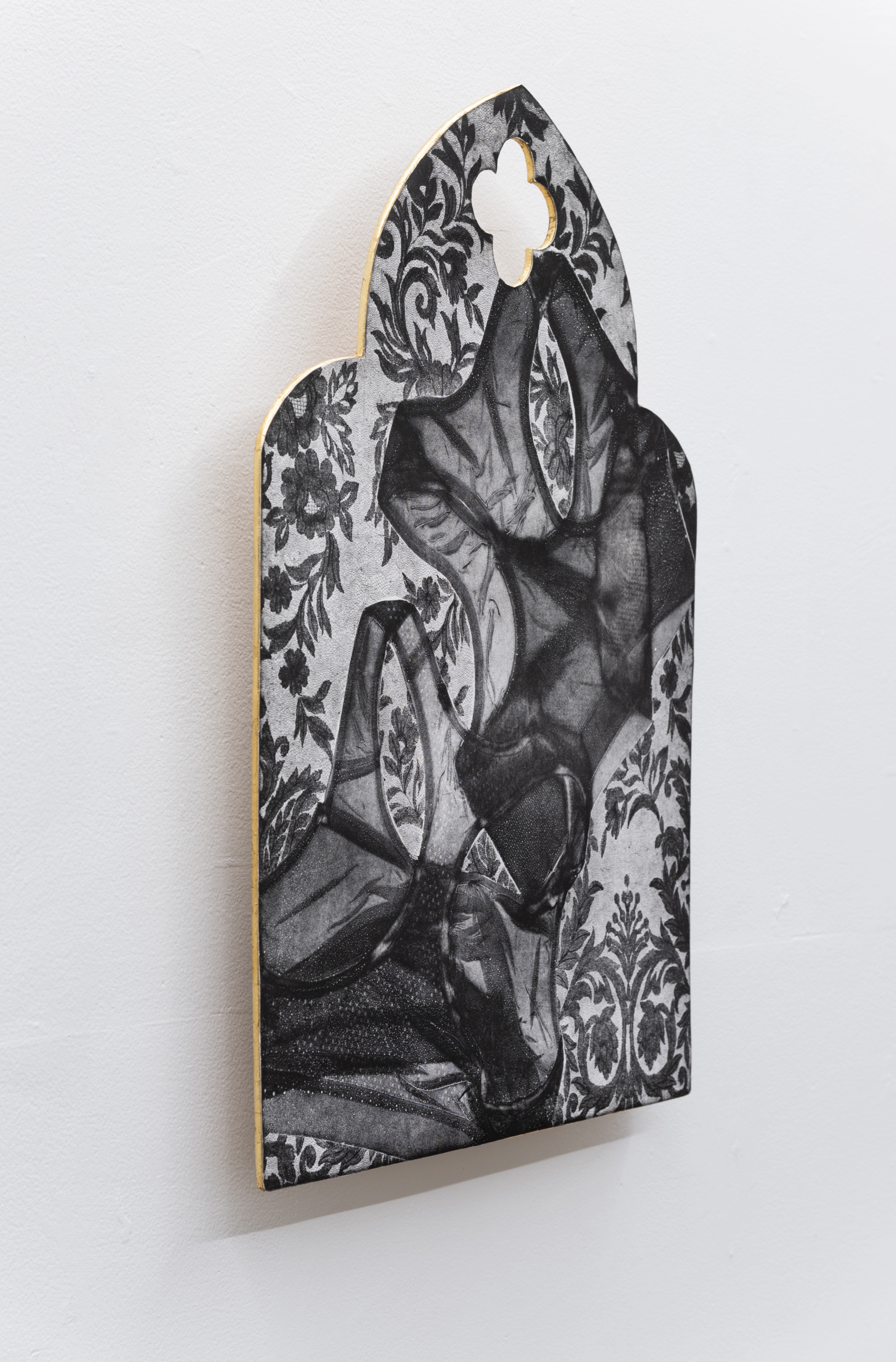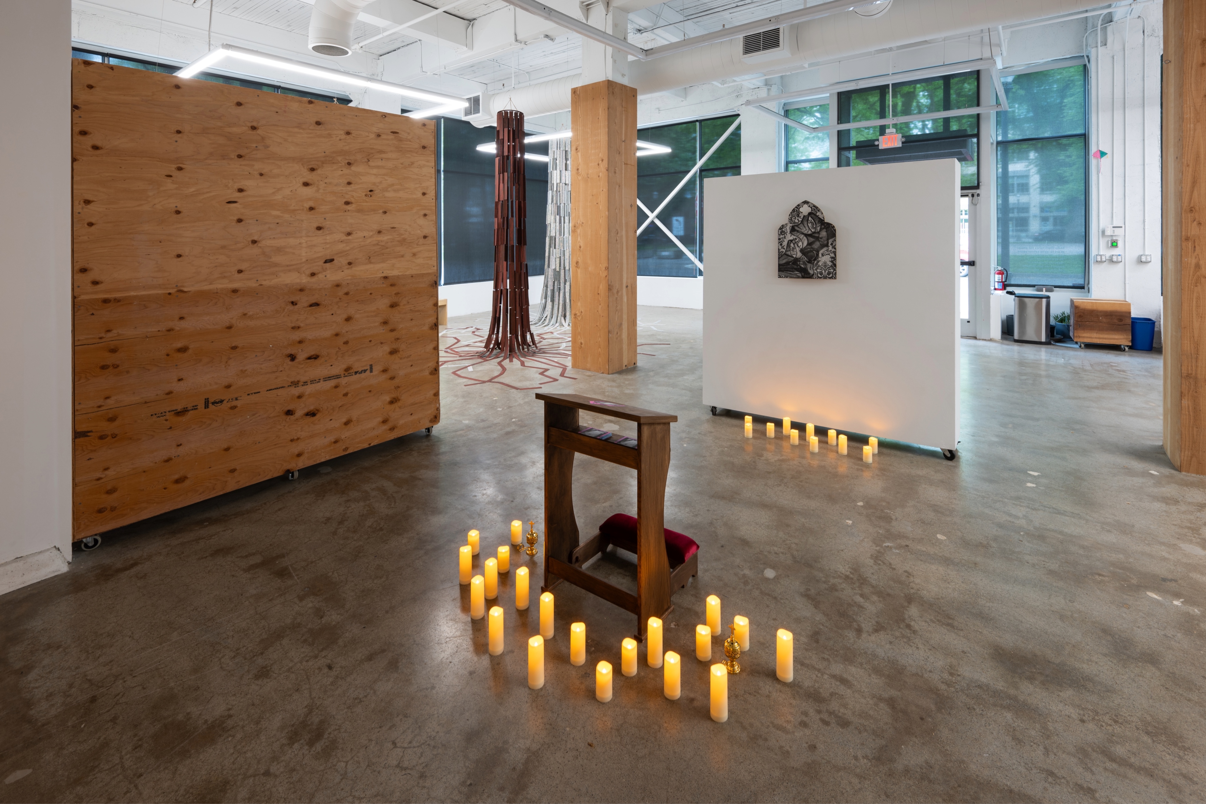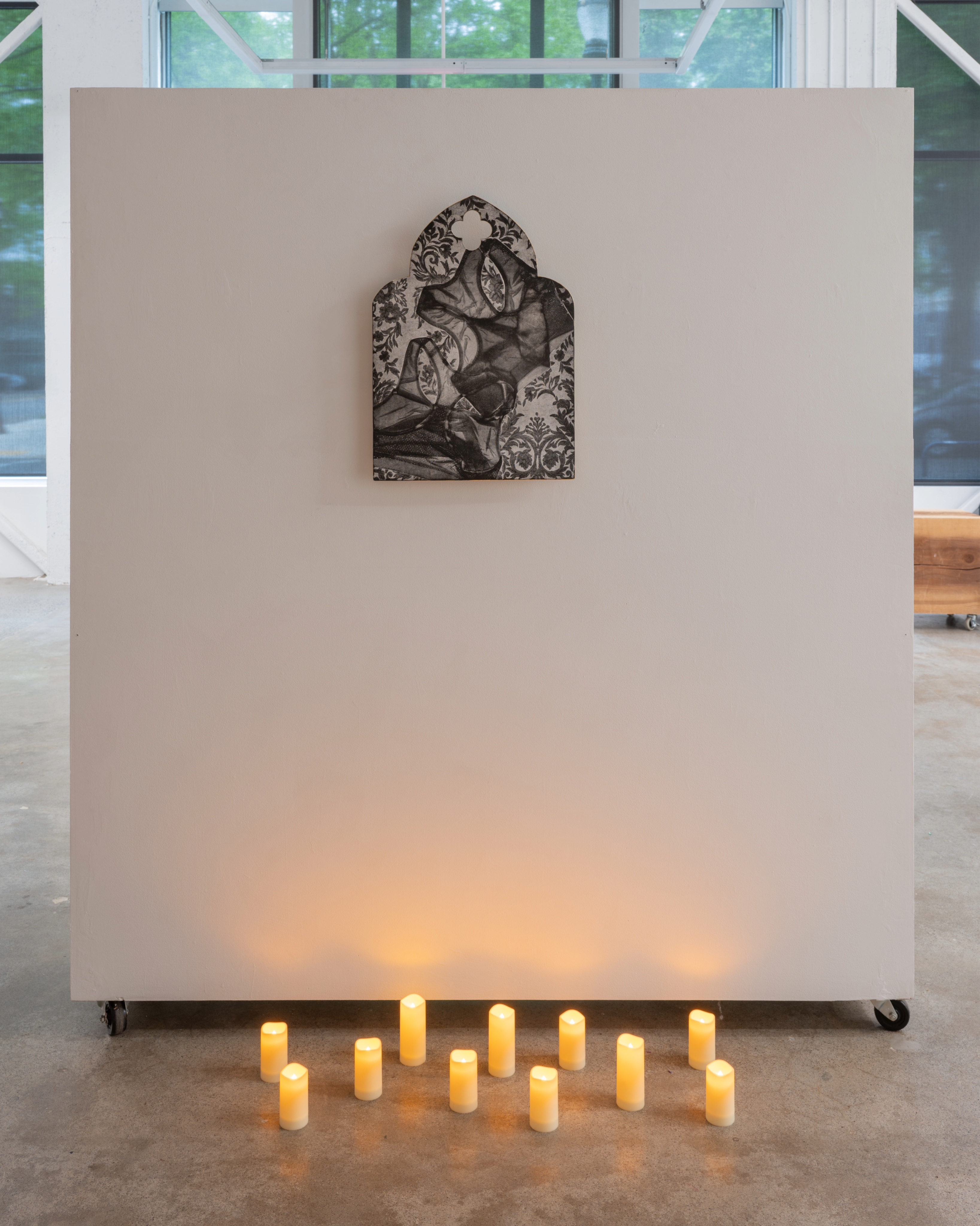 “The Sacred and the Profane: An Altar to Queerness”-honors the divine and holy within the marginalized identities of queerness. I have created a sacred sanctum where intaglio works become sculptural and merge with an immersive space to create an altar to queer devotion and defiance. The United States’ government and, its laws, and regulations are thoroughly influenced by Judeo-Christian culture, which holds a primarily moral opposition to the LGBTQIA+ community. This leads people to believe that queer people are profane or lesser: or, at worst, evil. In this body of work, I reinstate the value of queerness, elevating it to holiness. The altar becomes a transformative space where the sacred meets the subversive. It appropriates, references, and reimagines the iconography of the Catholic Church to assert queerness as divine and unapologetic.