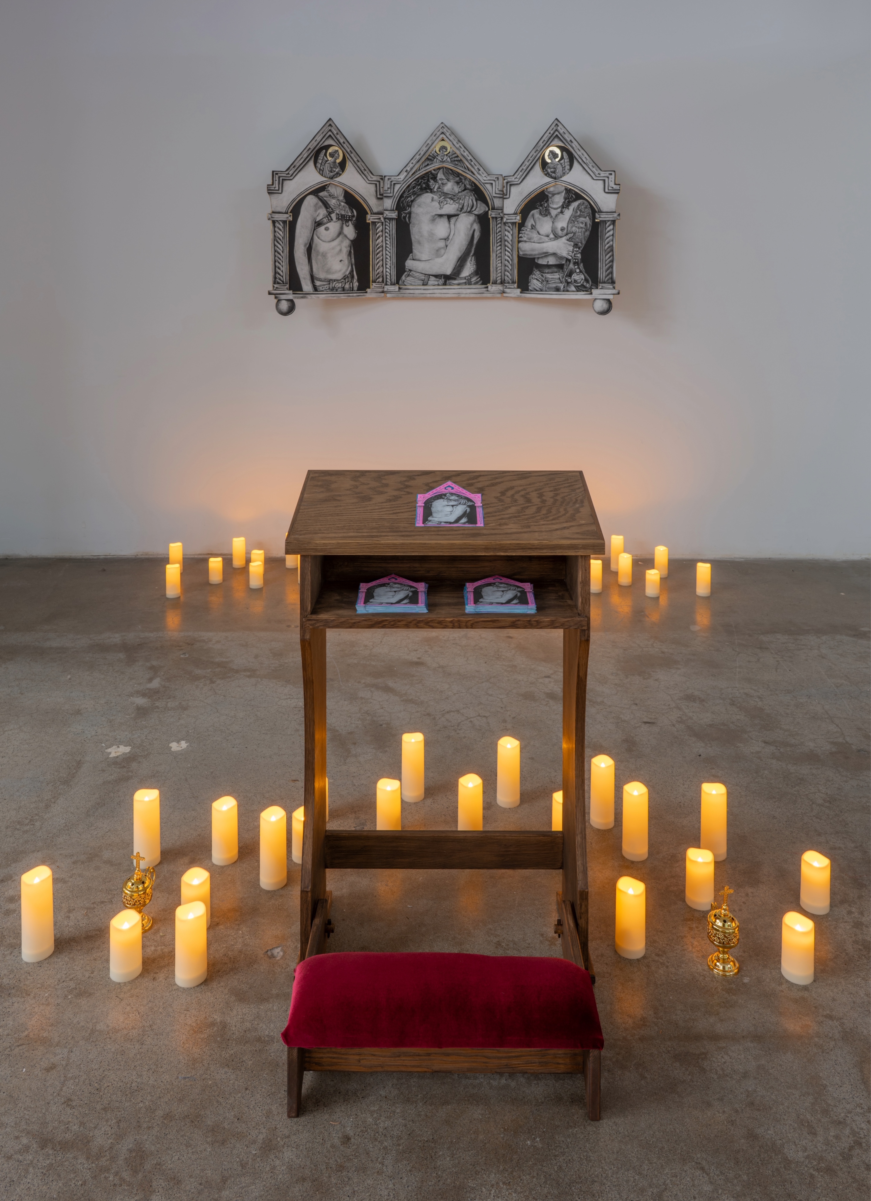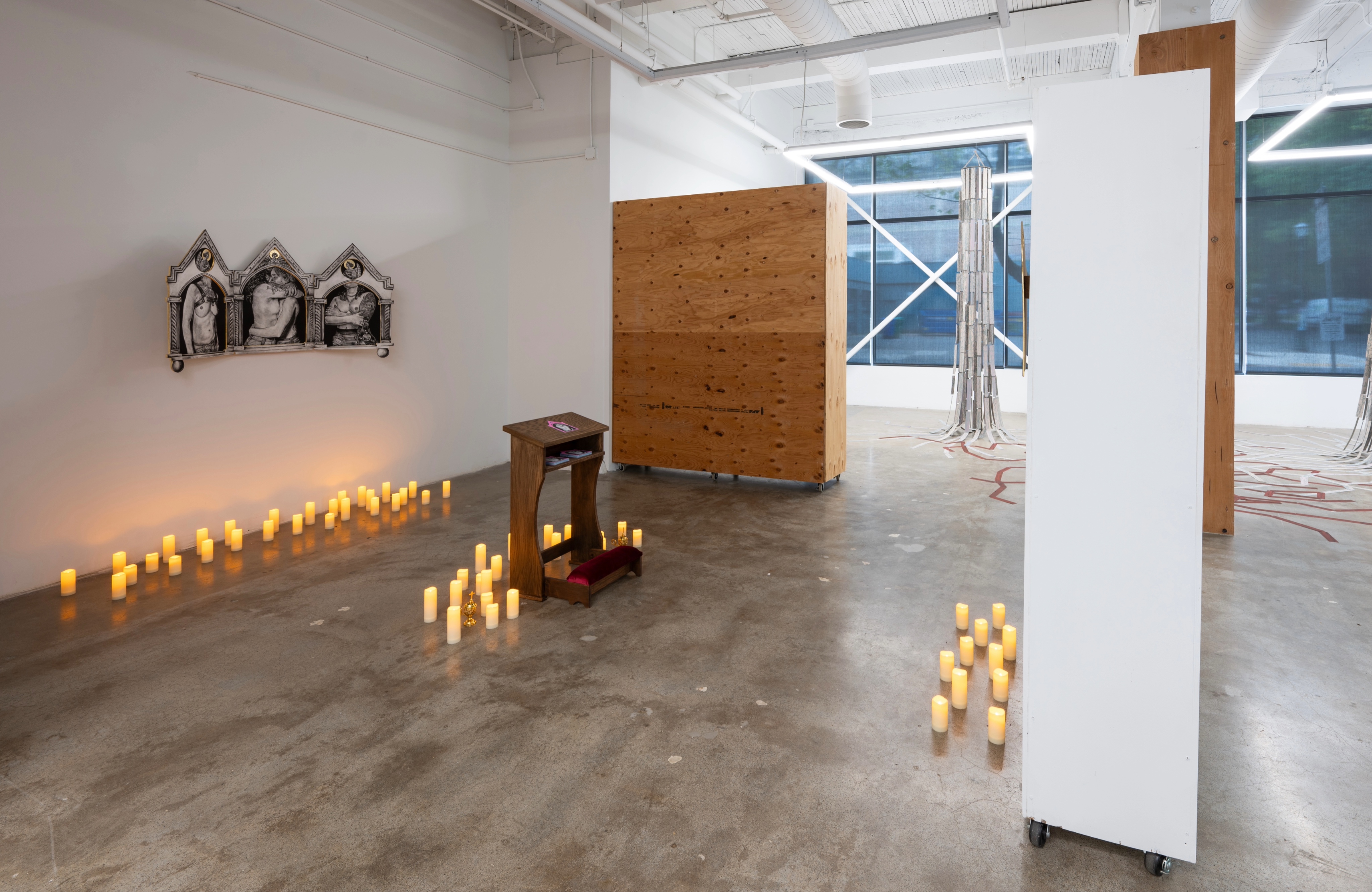 | dc.description.abstract | “The Sacred and the Profane: An Altar to Queerness”-honors the divine and holy within the marginalized identities of queerness. I have created a sacred sanctum where intaglio works become sculptural and merge with an immersive space to create an altar to queer devotion and defiance. The United States’ government and, its laws, and regulations are thoroughly influenced by Judeo-Christian culture, which holds a primarily moral opposition to the LGBTQIA+ community. This leads people to believe that queer people are profane or lesser: or, at worst, evil. In this body of work, I reinstate the value of queerness, elevating it to holiness. The altar becomes a transformative space where the sacred meets the subversive. It appropriates, references, and reimagines the iconography of the Catholic Church to assert queerness as divine and unapologetic. As a queer person I see the tender devotion that members of this community have for each other, and the subsequent need to deconstruct the binary matrix of the heteronormative world. By appropriating the imagery and aesthetics of the Catholic Church I seek to imbue these works with the aura and culturally accepted authority of religious art and sacred spaces. Not only is the imagery an act of devotion, but the making of these objects is as well. Intaglio, and more specifically mezzotints, are laborious etching processes that require an almost religious devotion to the medium. Through the countless hours of preparing plates and burnishing and scraping, the intimacy extends beyond the images themselves into their creation. This Altar stands as a devotion to something beyond the oppressive doctrines of the past- a celebration rather than a condemnation of identity, self expression, and empowerment. I invite the viewer to confront the intersection of religion, power and identity. I urge them to reconsider the sacred not as a space of exclusion, but as a site of inclusive reverence. | |