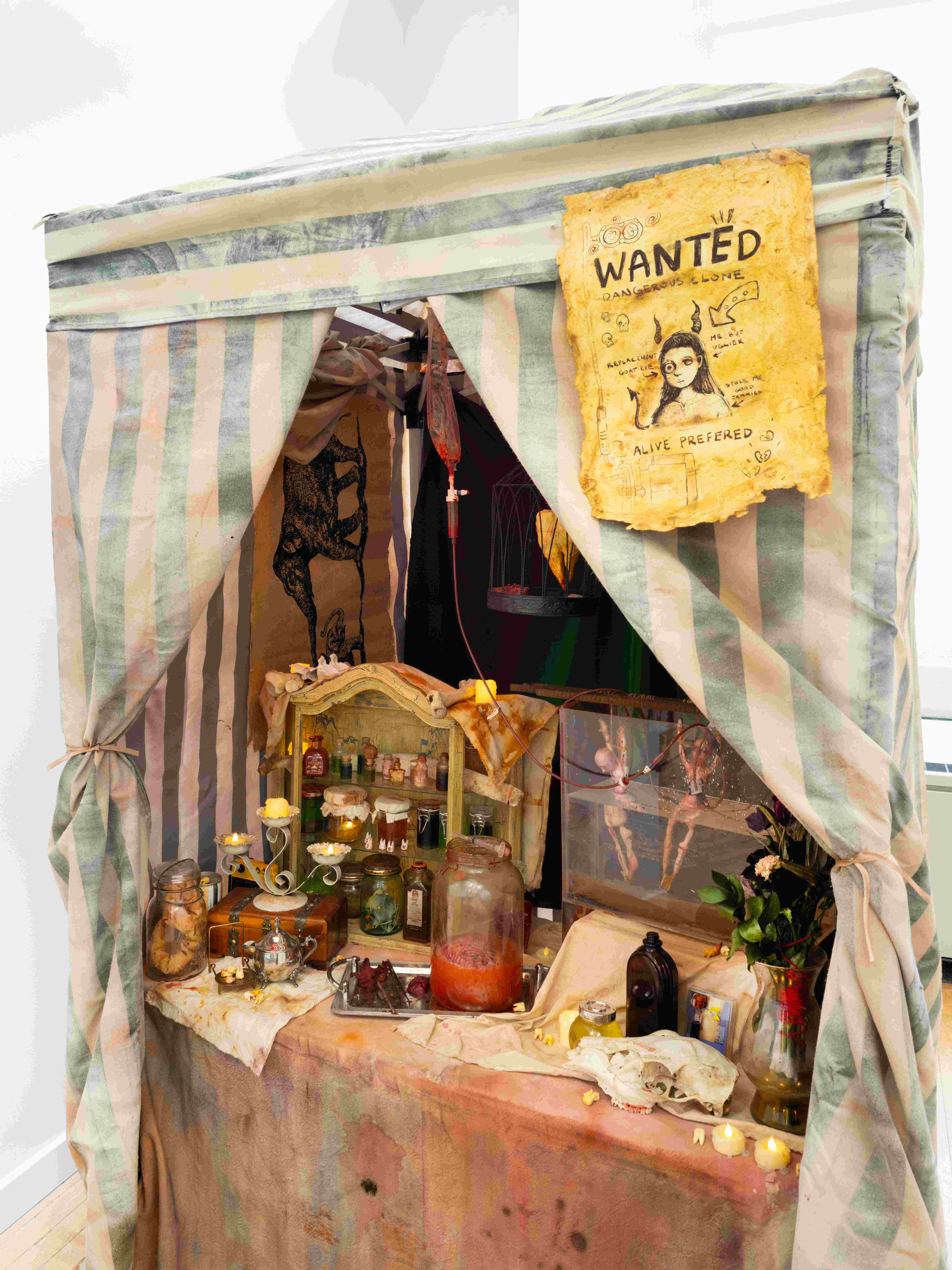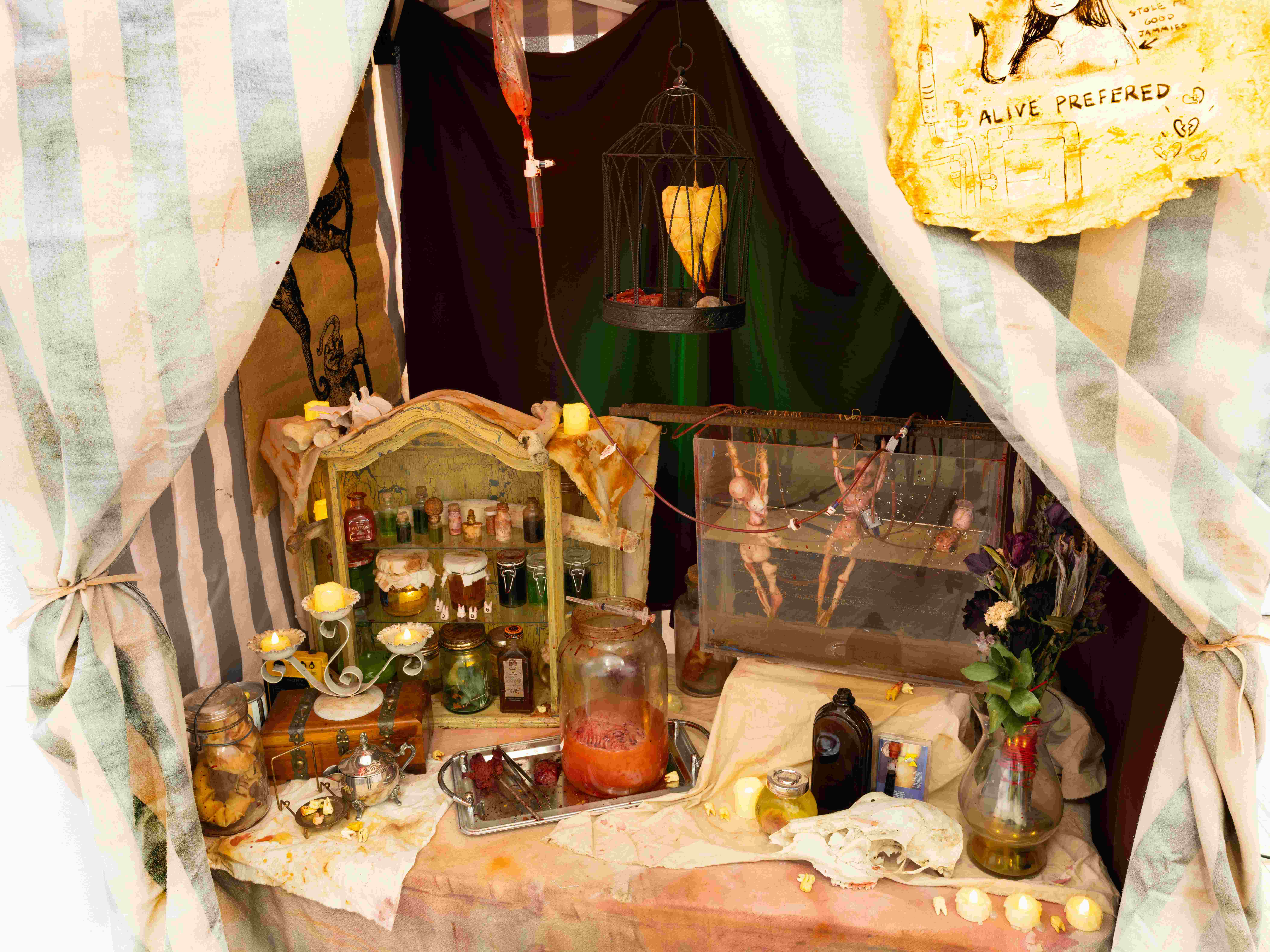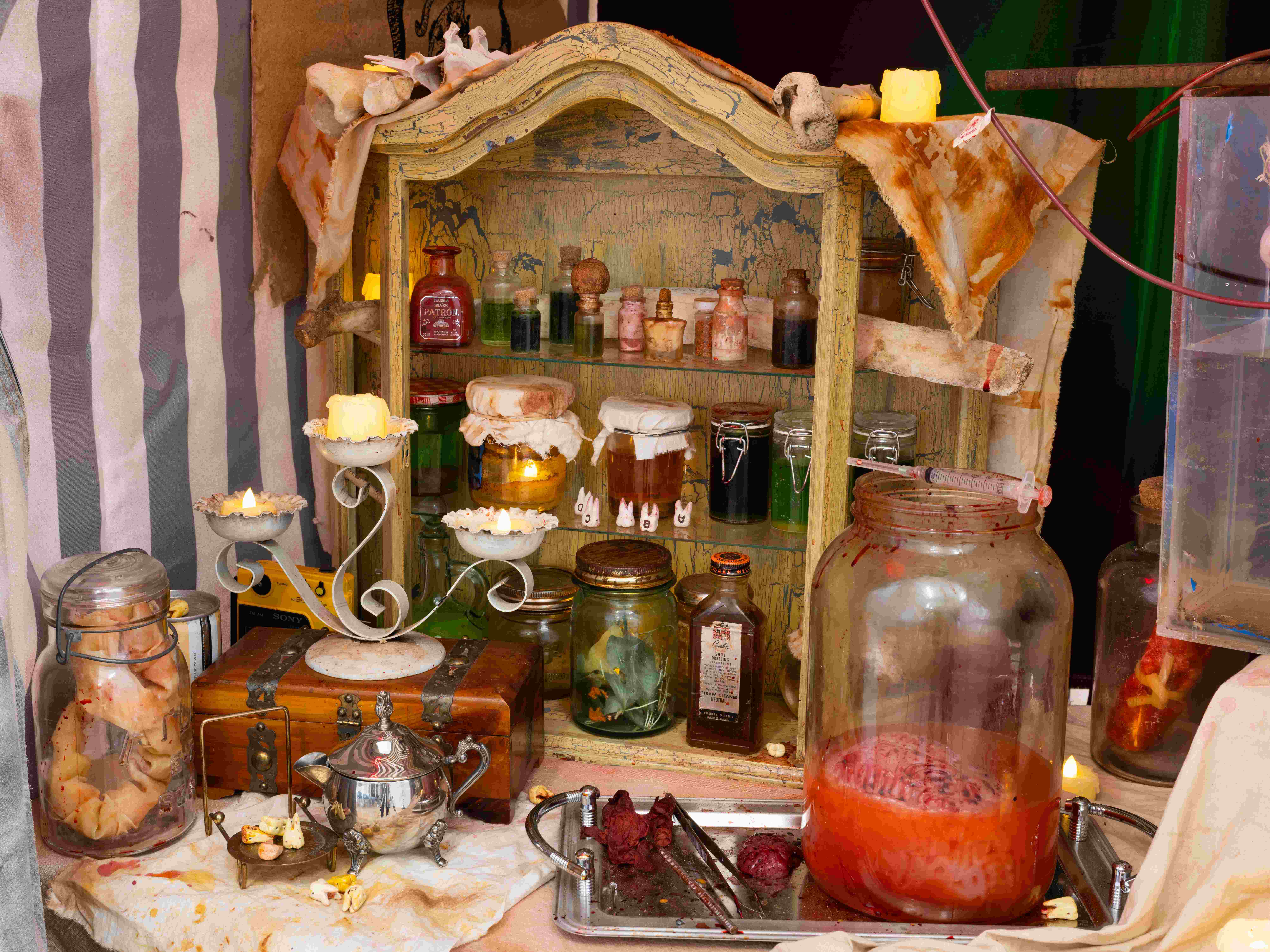 My installation, unofficially titled “Apothecary” or “Dead Last,” is a series of multimedia sculptures and props curated for a physical set of a roadside cannibal shop. Inspired by my cancer journey, I bring a new perspective on what cancer survivorship art looks like.