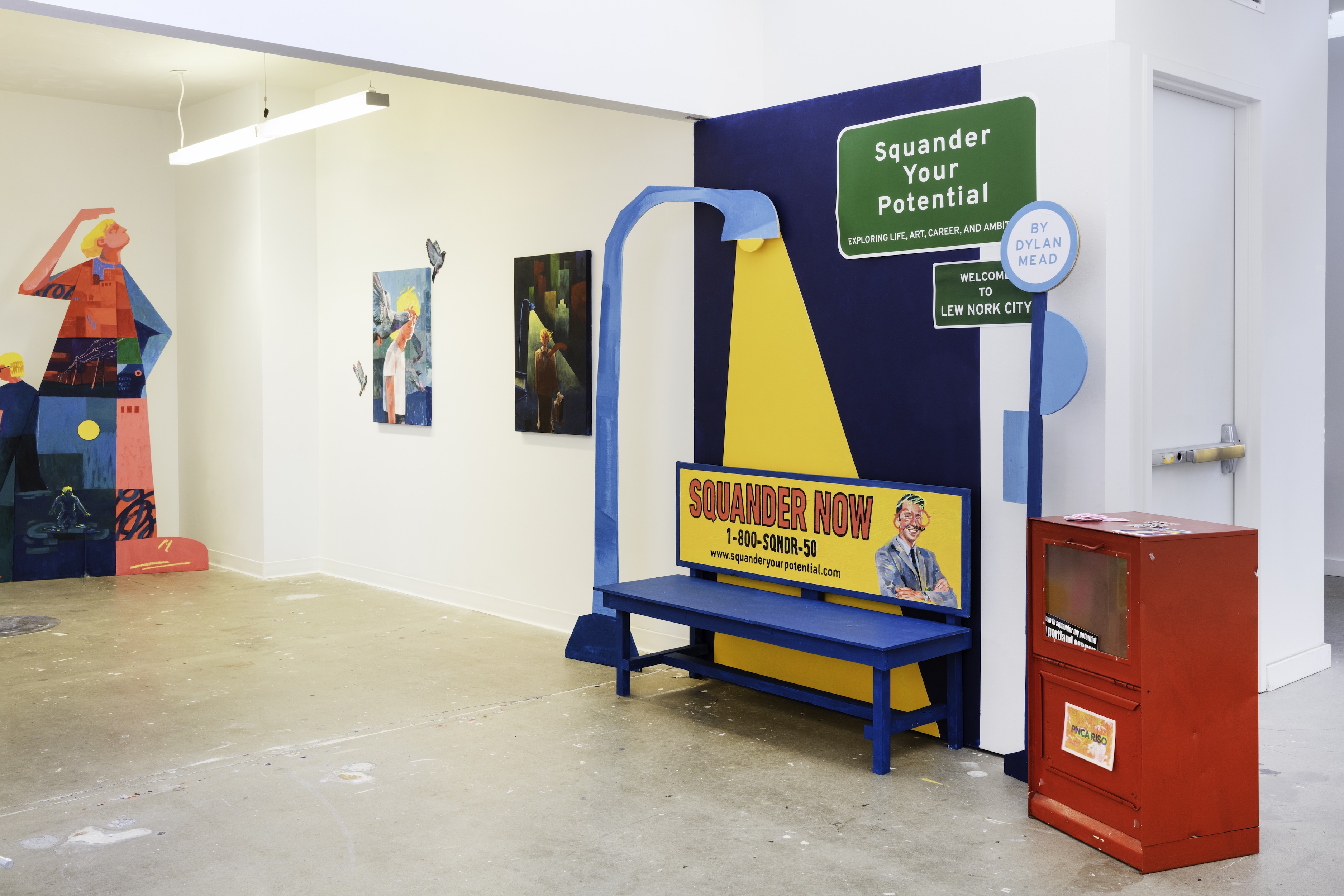 ‘Squander Your Potential’ is a multimedia installation, analyzing the concepts of potential, self-actualization, and all the self-sabotage that comes with being creative in the 21st century. In the context of a constructed fictional city, “Lew Nork City,” combining the signs and symbols of New York and Los Angeles, I’m questioning the role large cities play in artistic career and ambition, and what they represent for success and failure. I am using this exhibition to probe personal questions about art, career, ambition, success, and how labor affects an artist’s spirit. To the viewer, this installation becomes an immersive trip into 'Lew Nork City' and the life of an artist, inviting you to explore whether or not the idea of “potential” is something viable, tangible, or even a healthy thing to live by.