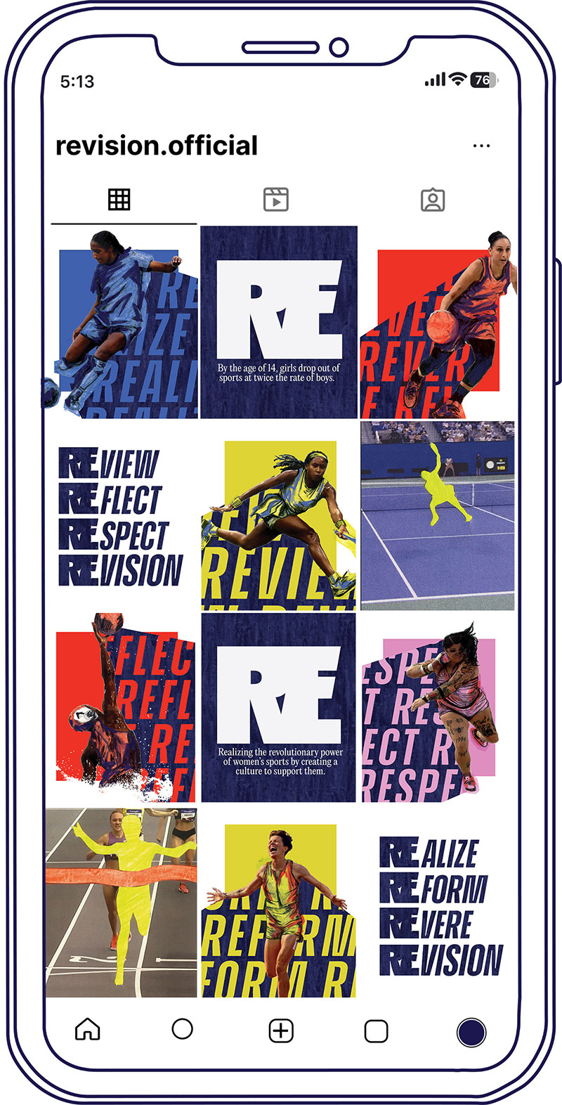 Revision is a messaging campaign designed to create a narrative of possibility and agency for women’s sports. It is designed to inspire, to actively subvert gender expectations, and to challenge social paradigms to reclaim negative narratives surrounding women’s sport with a sense of agency. It is a celebration of athletes and a celebration of creativity. It is a multimedia endeavor, blending design and illustration in different ways to emphasize its message. That message centers on creating a culture of support for women’s sports and inspiring young athletes everywhere to keep playing. It aims to balance the challenges being faced with celebrating the success, progress, and the positive impact of women’s sports. This is a project that celebrates all I have learned and continue to learn from sports and visualizes what I believe sports can become.
