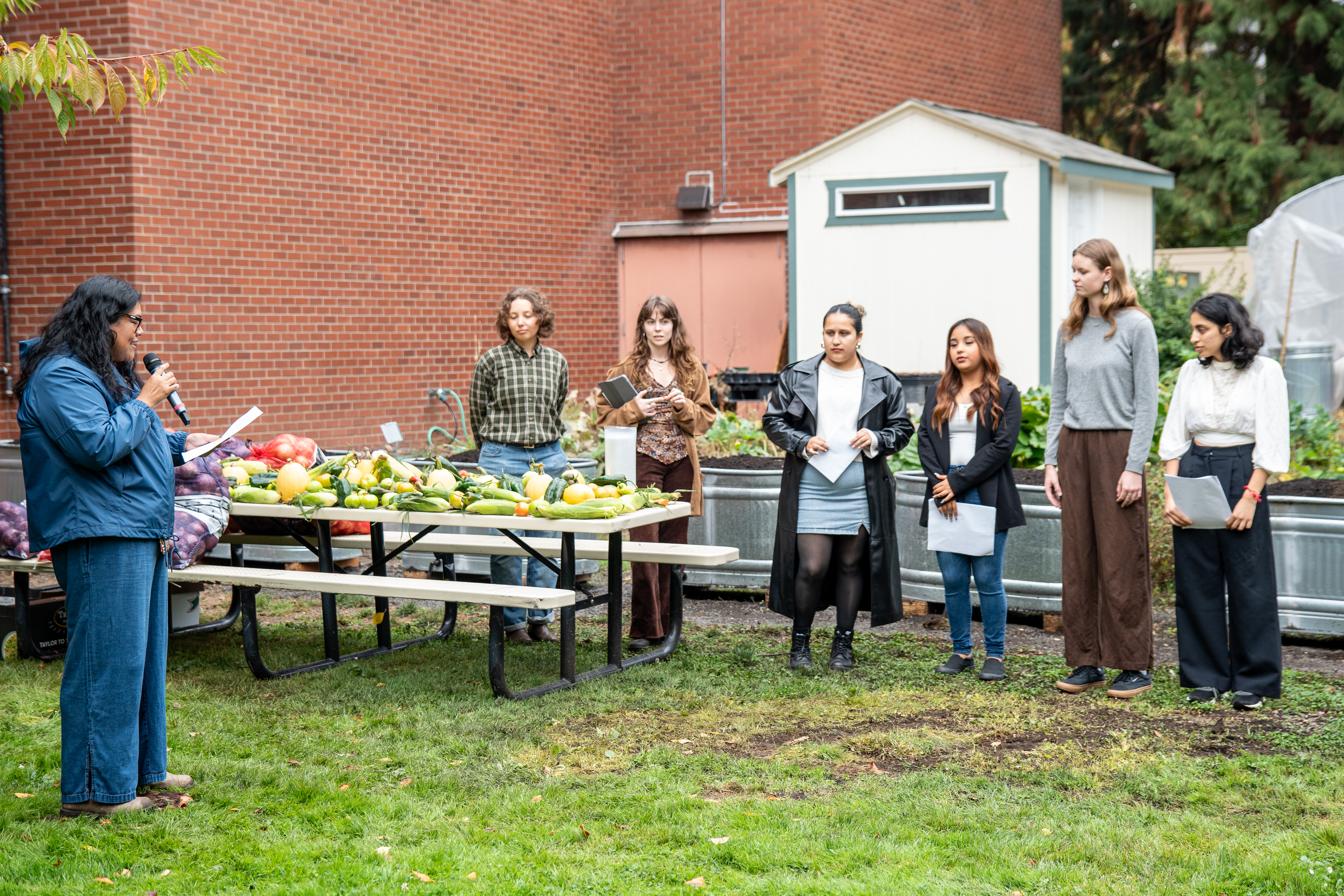 Photograph of Dr. Teresa Hernández speaking into a microphone while undergraduate students Itzel Garibay Cervantes, Ananya Gupta, Tania López Flores, Lydia Hoffner, Vera Sieck, and Merry Smith listen during Mr. Alfonso Guzmán's dedication ceremony.