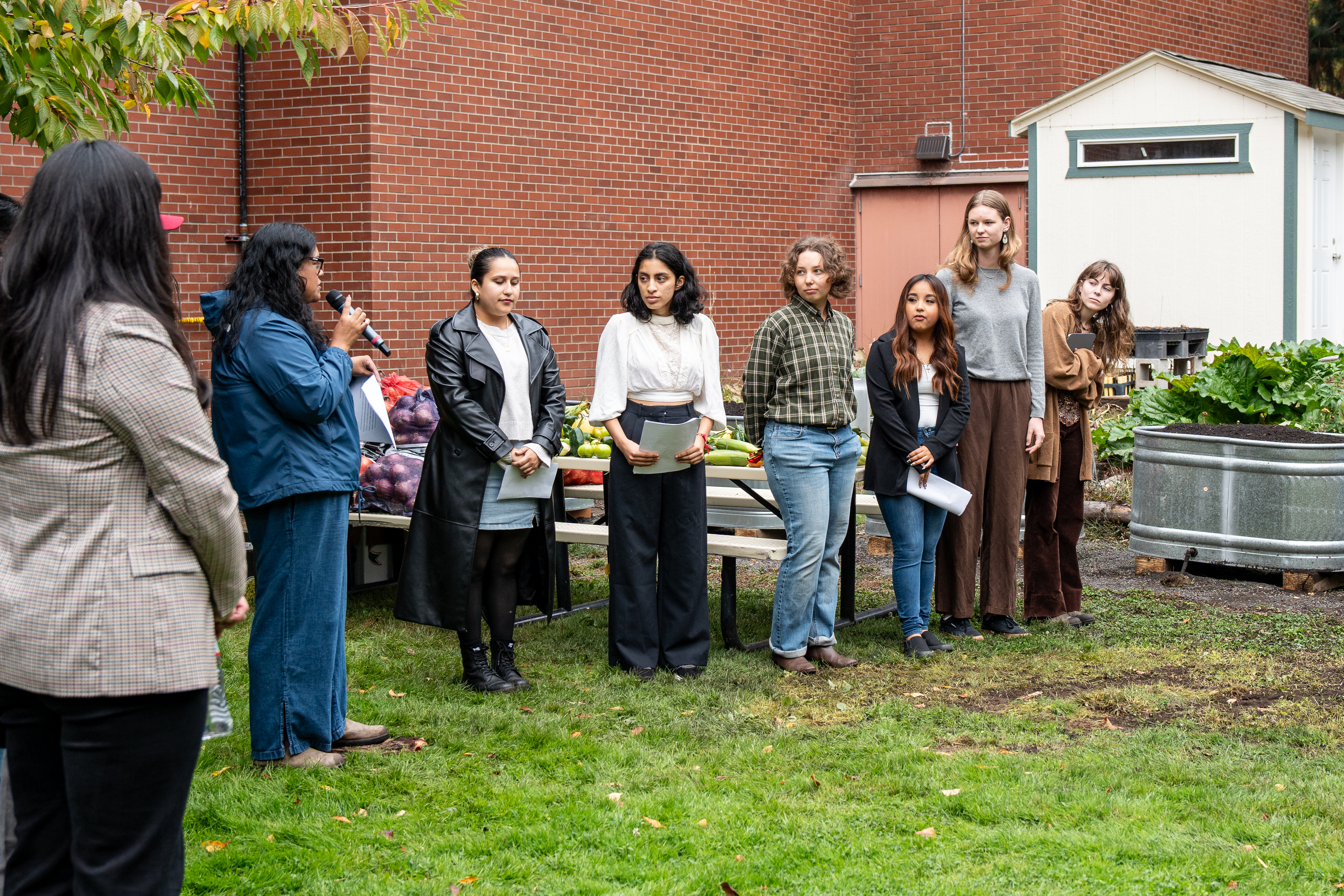 Photograph of Dr. Teresa Hernández speaking into a microphone while undergraduate students Itzel Garibay Cervantes, Ananya Gupta, Tania López Flores, Lydia Hoffner, Vera Sieck, and Merry Smith listen during Mr. Alfonso Guzmán's dedication ceremony.
