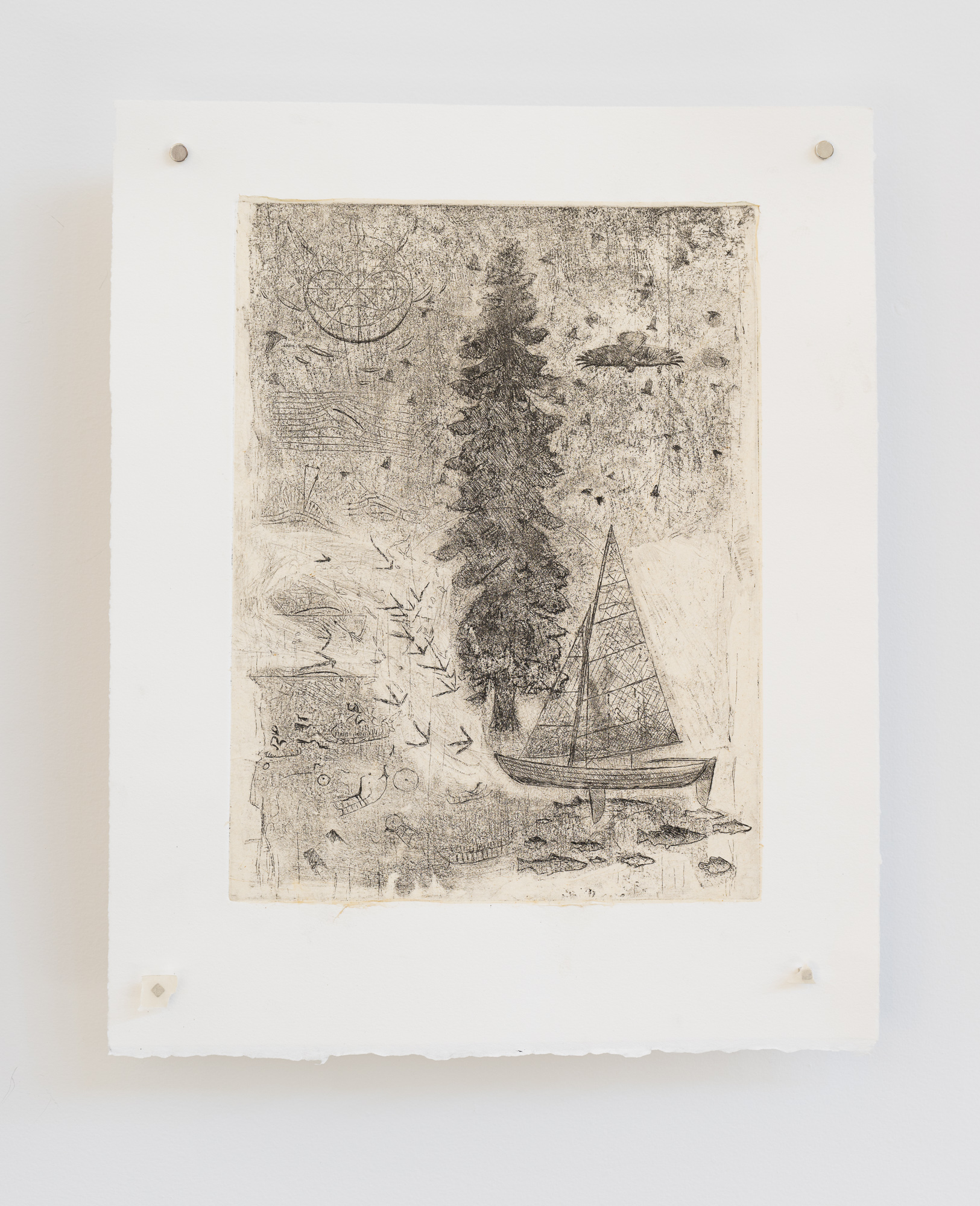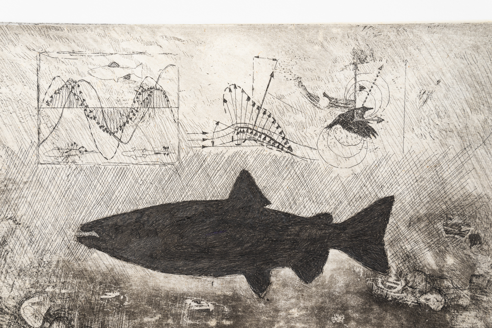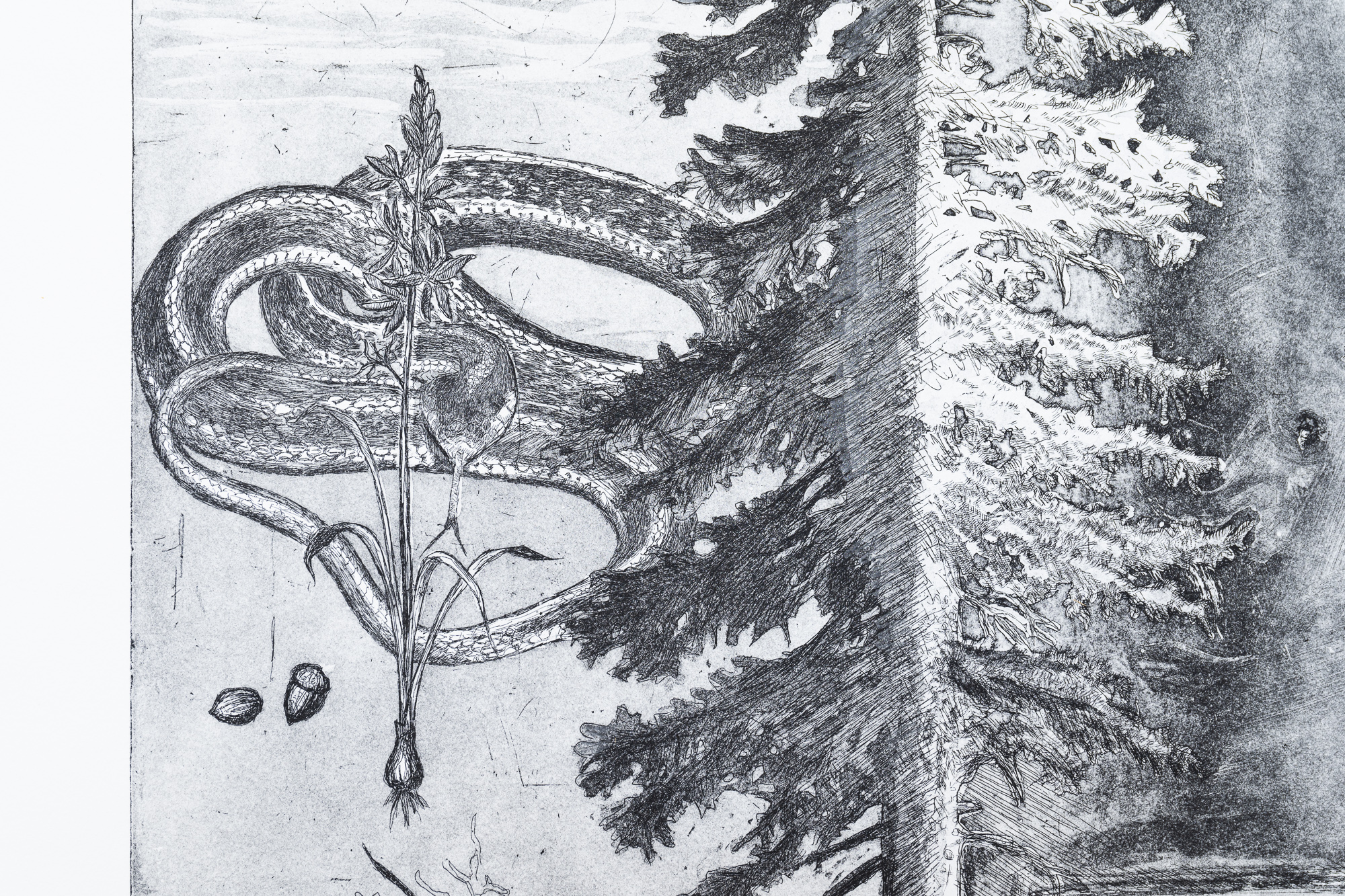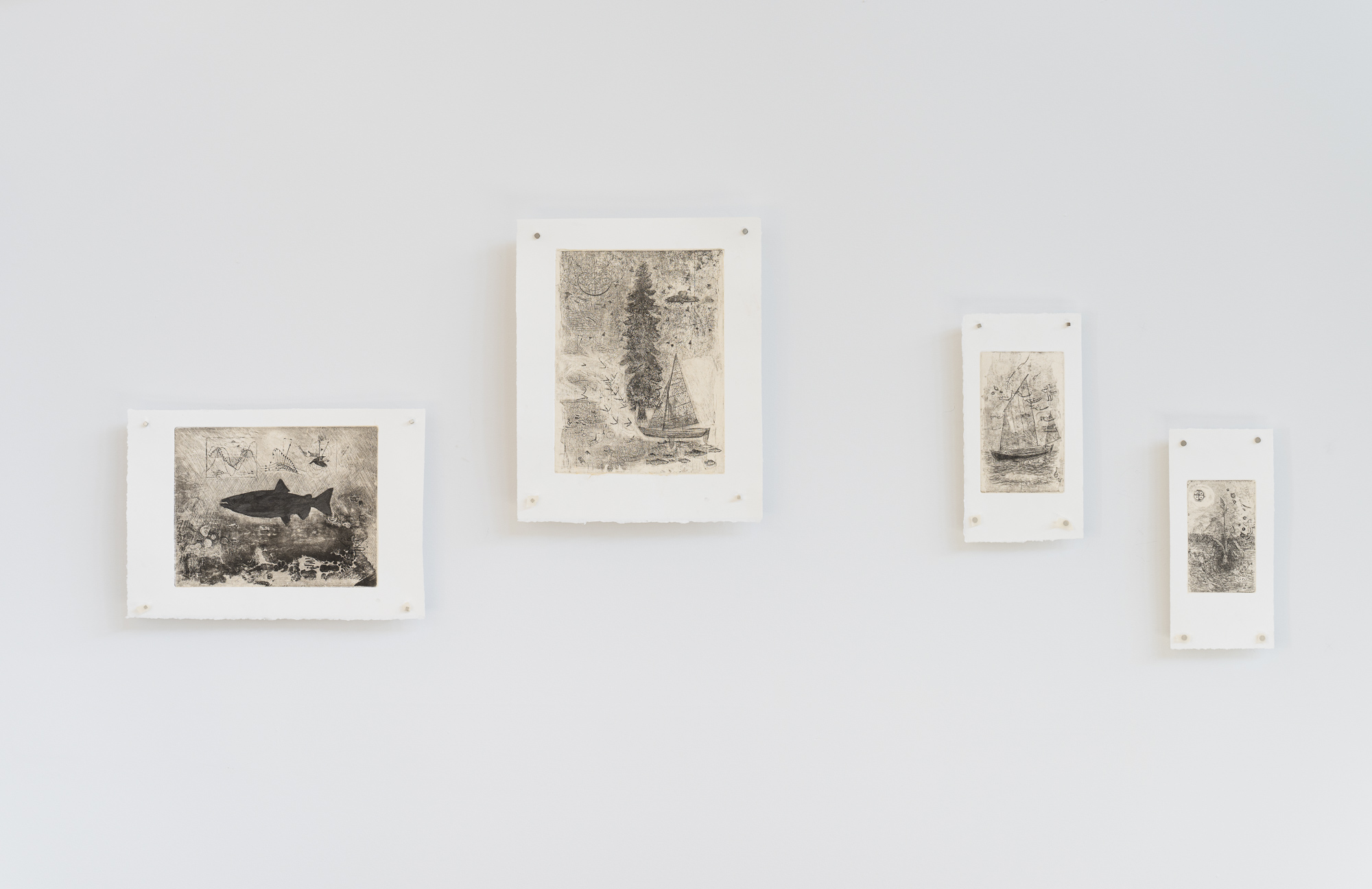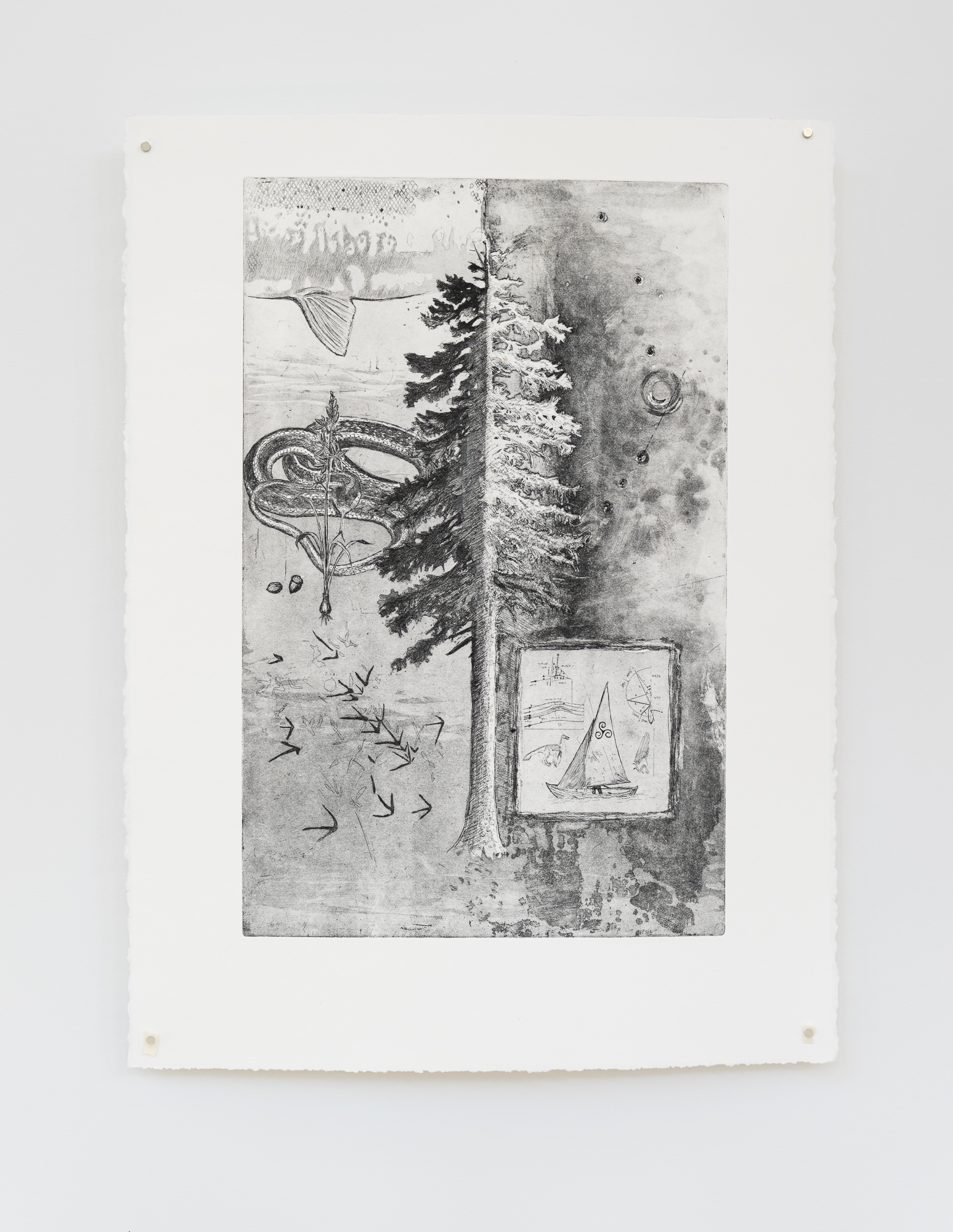 With my series of intaglio prints, I explore themes relating to identity construction and place, arguing that those residents who think of themselves as “Portlanders” should instead shift their primary allegiance to the Willamette River. My thesis work contributes to this project of identity reformation by building an affective-aesthetic matrix of imagery, recalling viewers back to local land and water forms, the reality of political violence, and the larger cosmos. My work includes references to the often-suppressed Indigenous materiality of this place, recognized as a fact of the social environment that demands reckoning, plus imagery from the distant past of my own European ancestry, as well as “composted” charts and diagrams from scientific research. By “composting,” I mean erasing the legibility of a graphic or making it esoteric, in order to remove it from rigidly emotionless systems of information-and-control. The main text of my thesis takes the form of a glossary, meant to aid in “reading” the visual work.