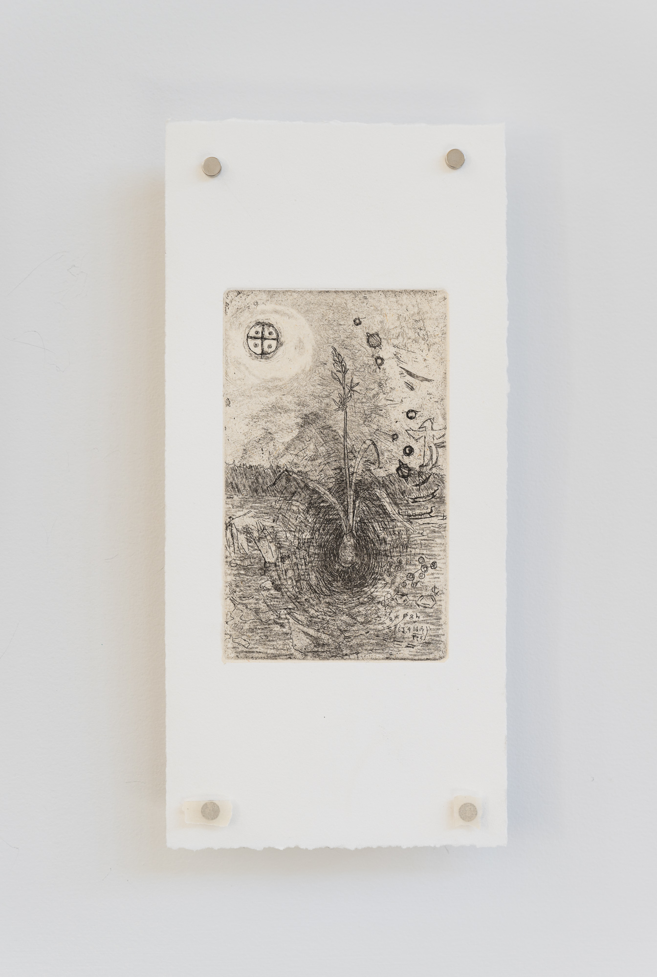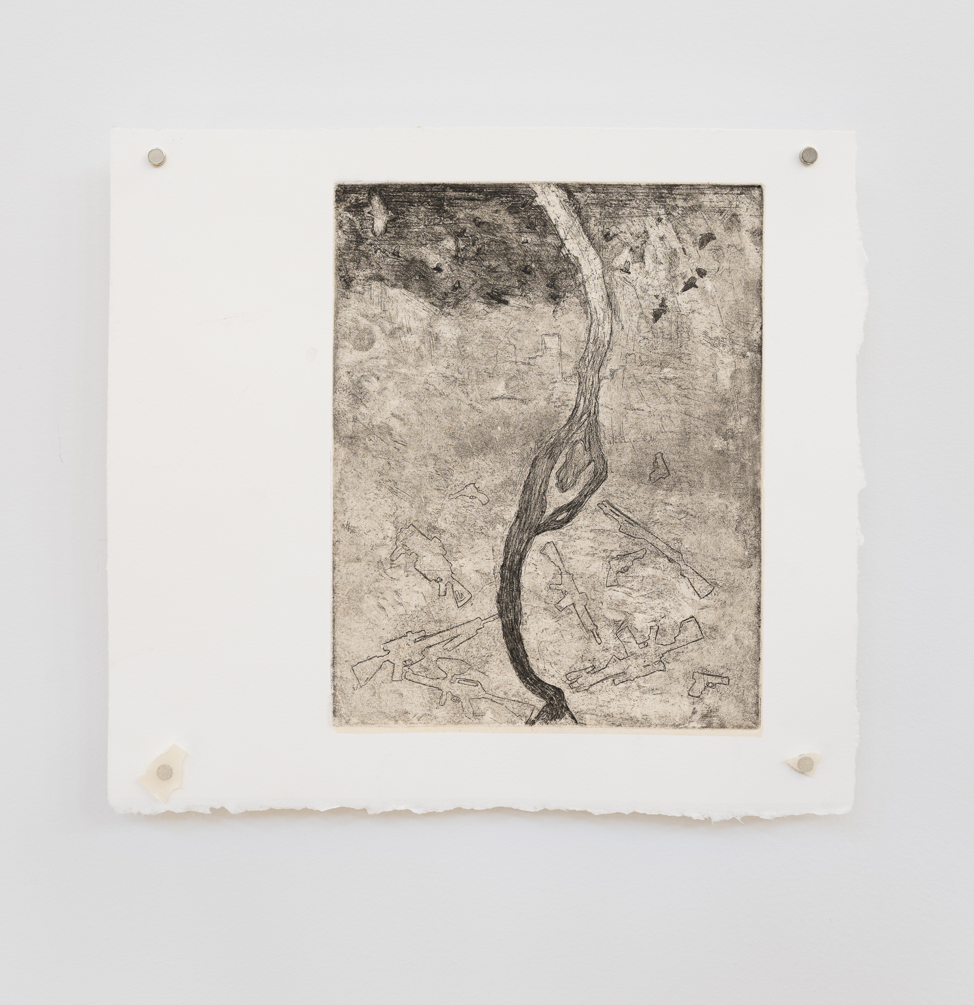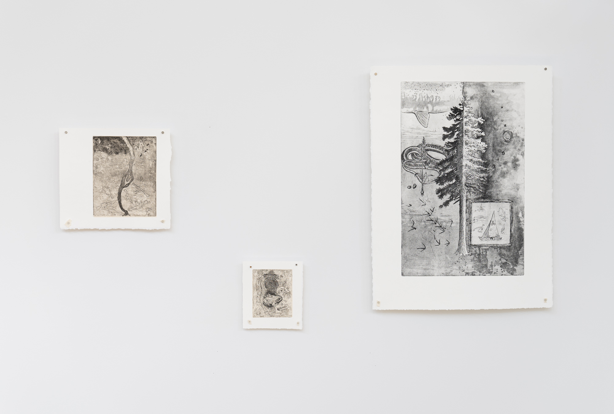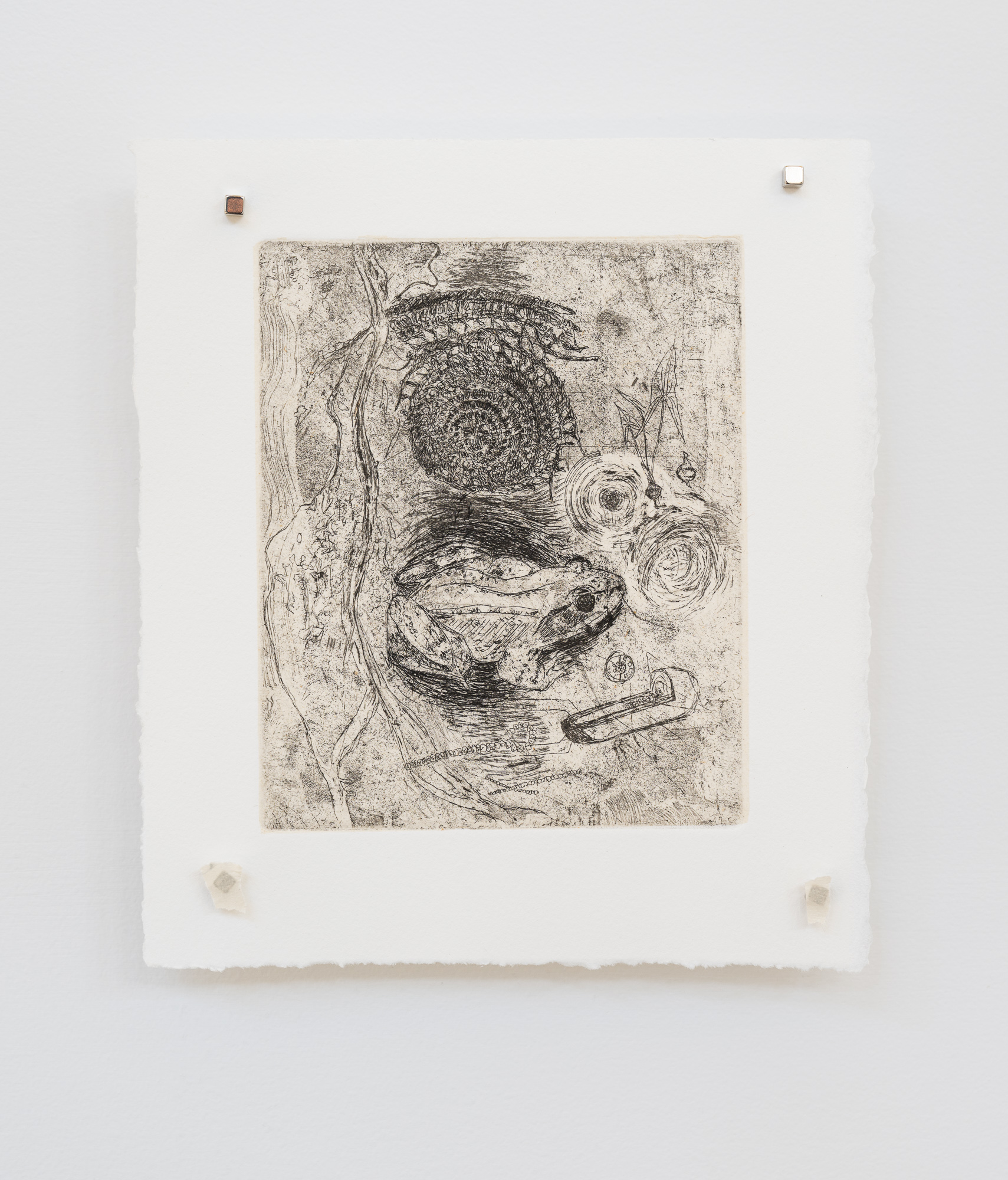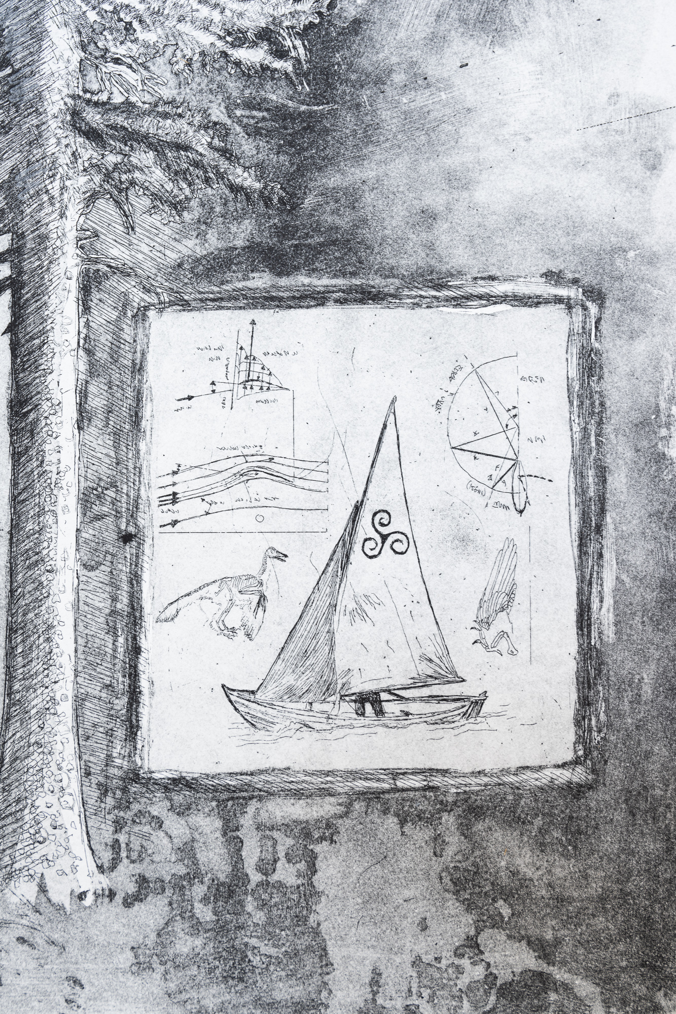 With my series of intaglio prints, I explore themes relating to identity construction and place, arguing that those residents who think of themselves as “Portlanders” should instead shift their primary allegiance to the Willamette River. My thesis work contributes to this project of identity reformation by building an affective-aesthetic matrix of imagery, recalling viewers back to local land and water forms, the reality of political violence, and the larger cosmos. My work includes references to the often-suppressed Indigenous materiality of this place, recognized as a fact of the social environment that demands reckoning, plus imagery from the distant past of my own European ancestry, as well as “composted” charts and diagrams from scientific research. By “composting,” I mean erasing the legibility of a graphic or making it esoteric, in order to remove it from rigidly emotionless systems of information-and-control. The main text of my thesis takes the form of a glossary, meant to aid in “reading” the visual work.