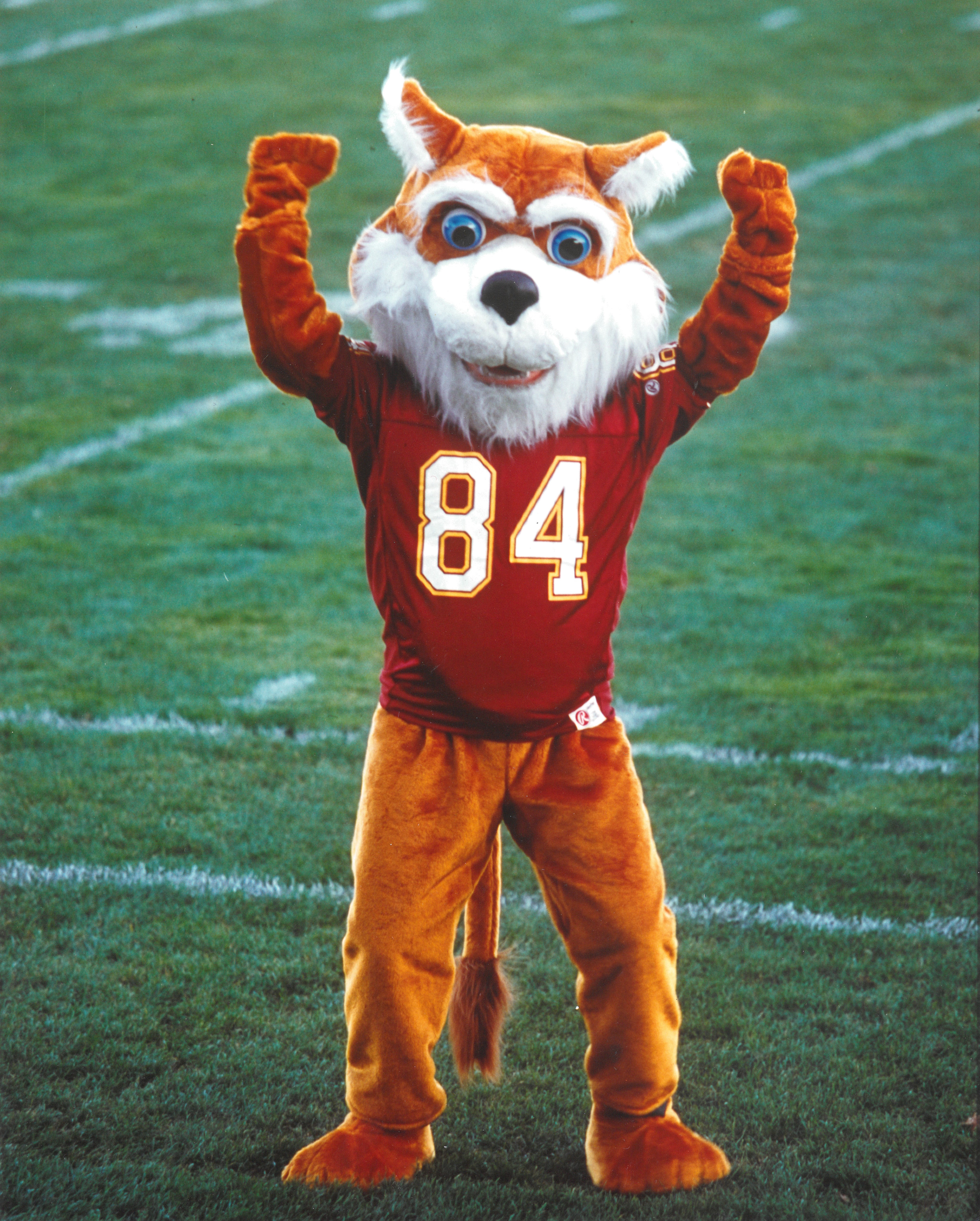 Photograph of Blitz the Bearcat wearing jersey #84 on football field.