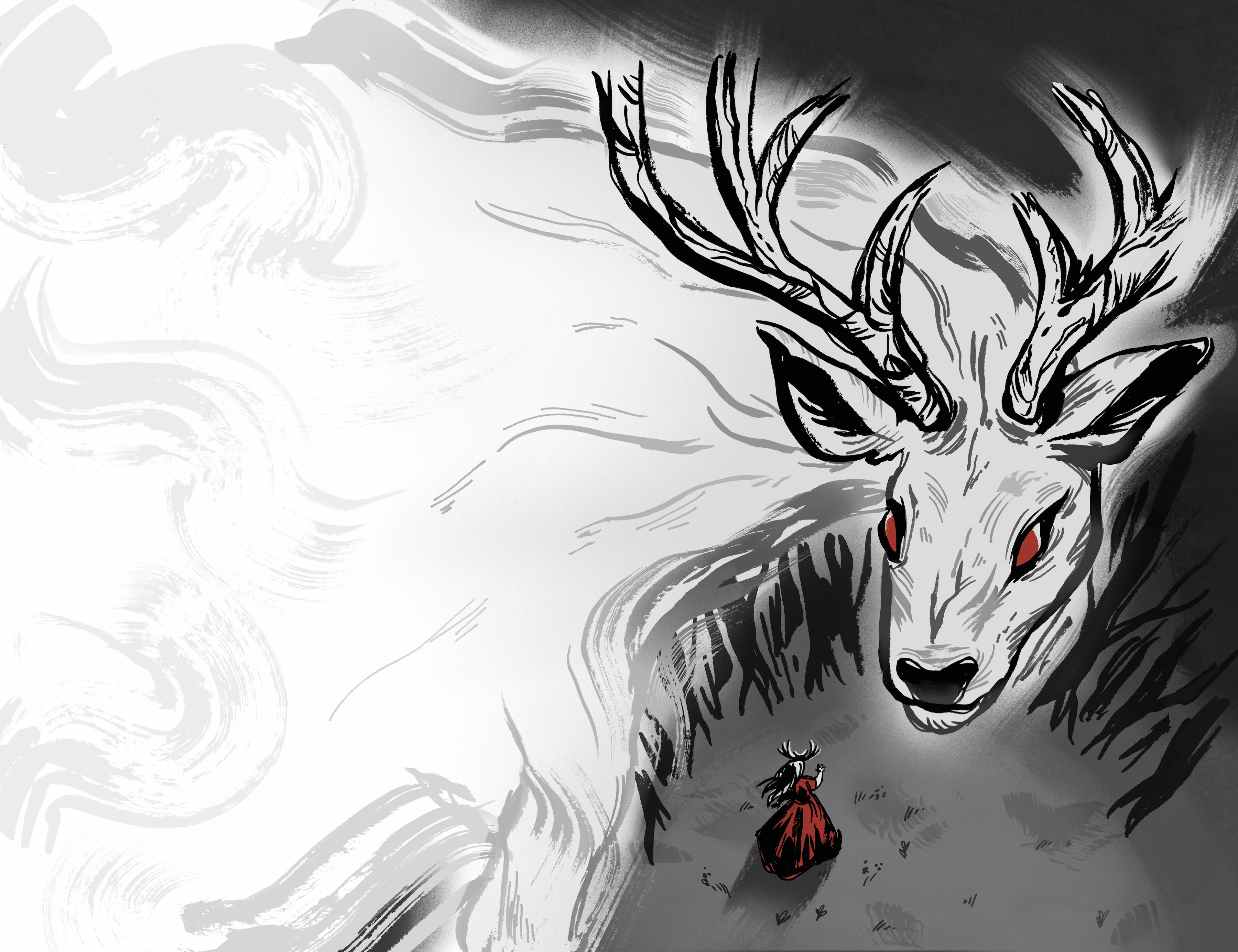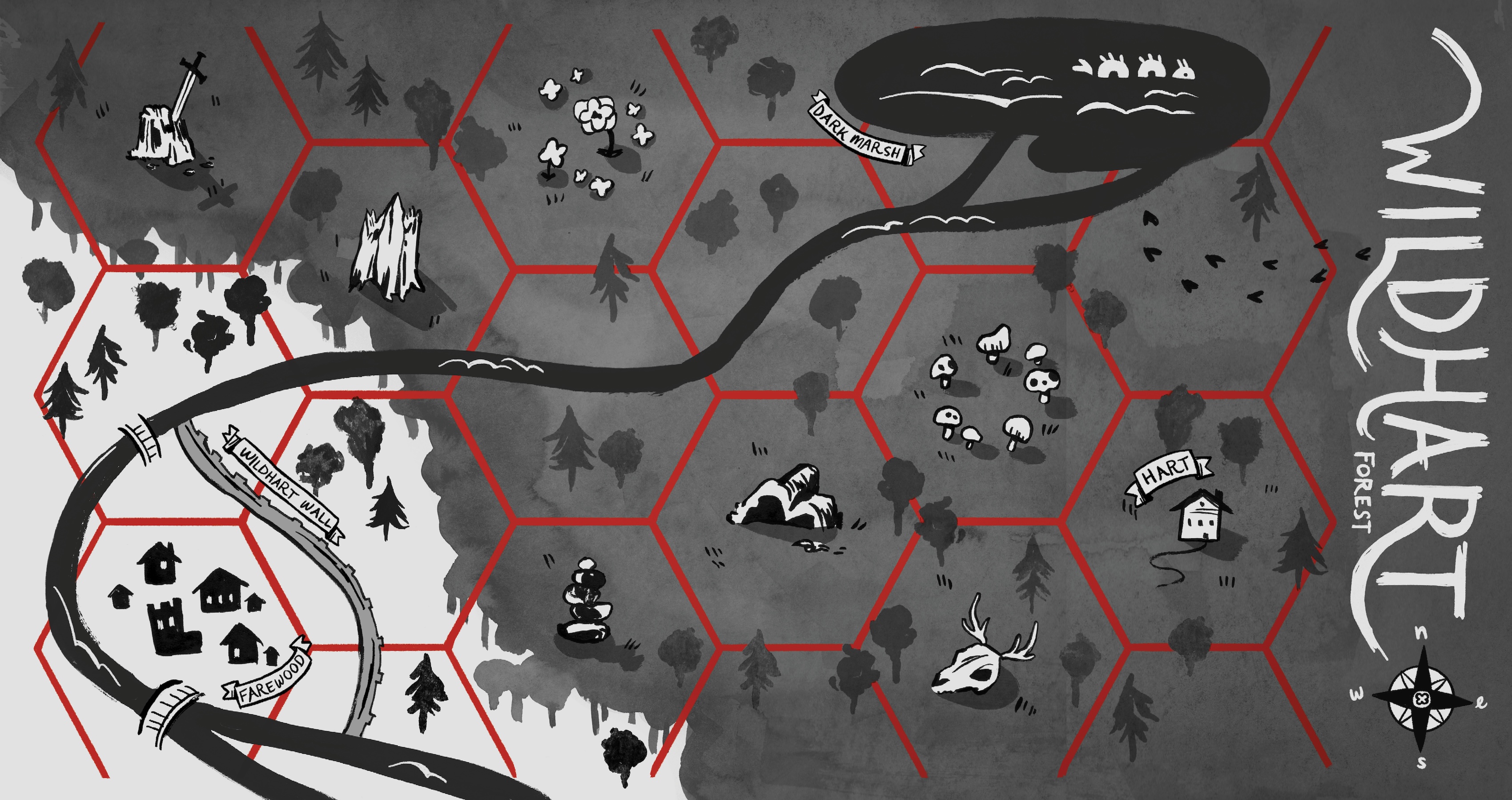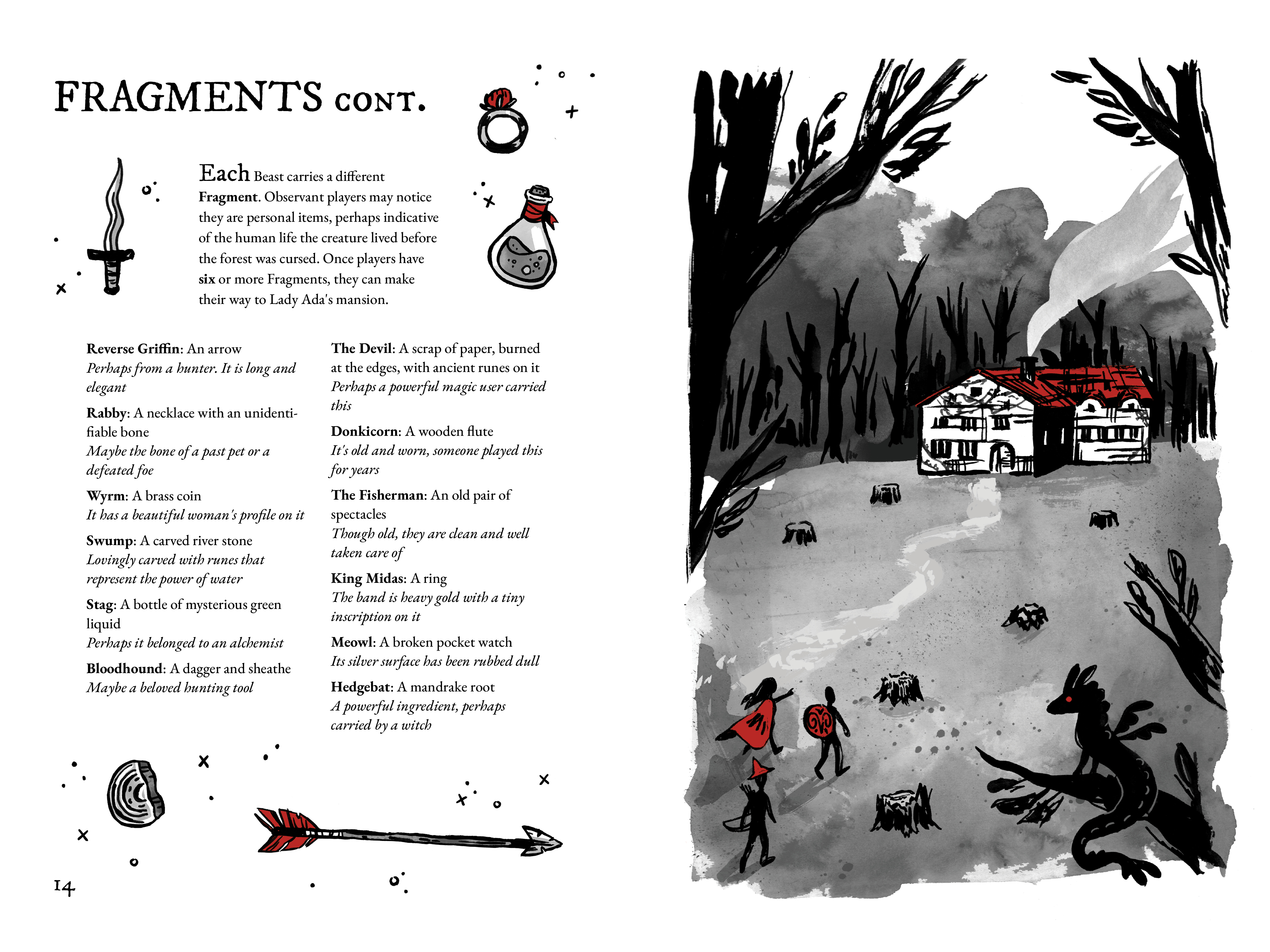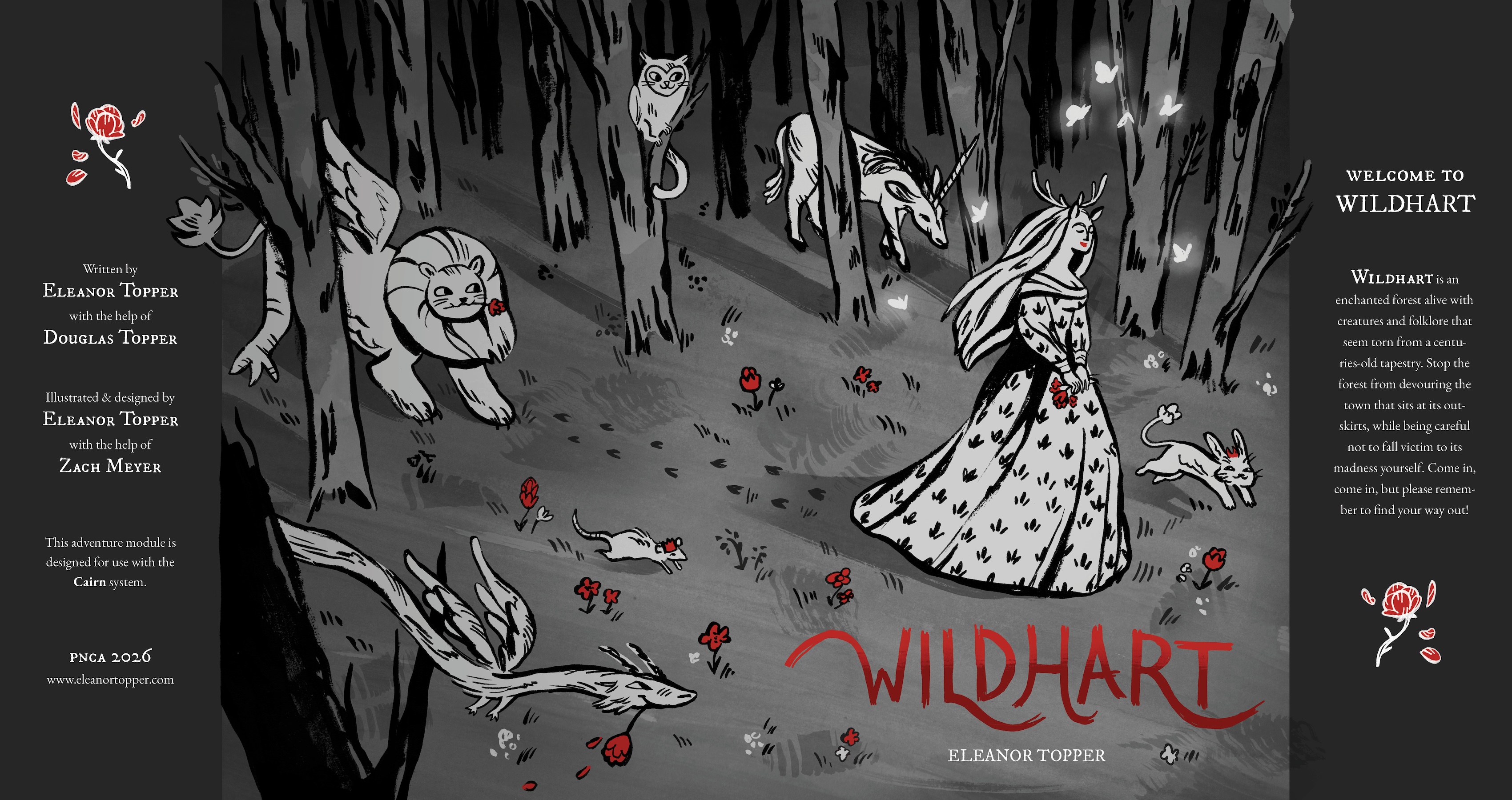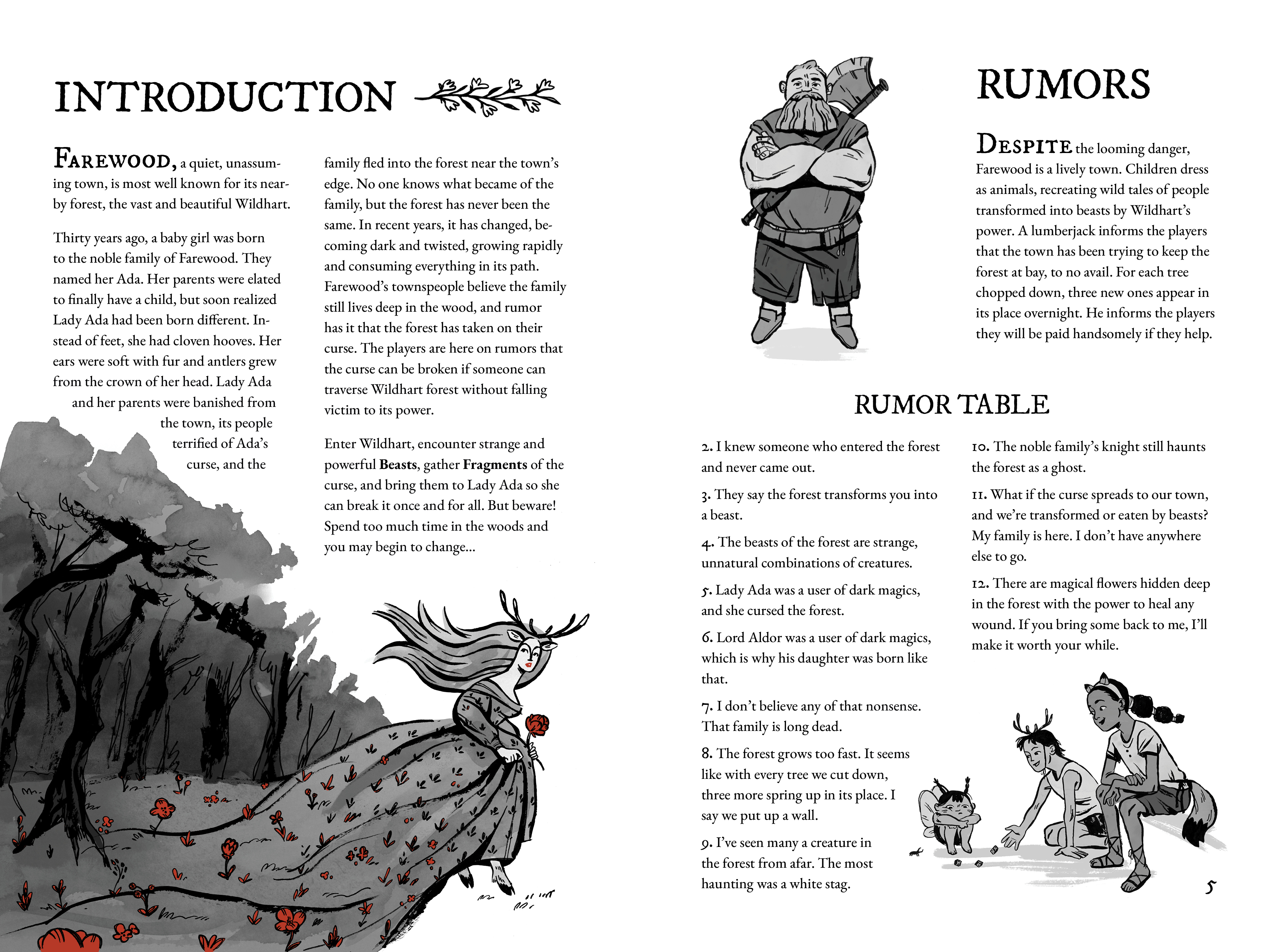 Wildhart is a 20 page D&D adventure module with an original story, illustrations, and gameplay. The story begins in Farewood, a small town on the edge of Wildhart forest. Rumor has it that strange, unnatural creatures roam the forest, and too much time spent in the woods might turn you into a Beast yourself. Wildhart forest has recently begun to grow faster than it should, expanding around the town and threatening to swallow it and its people. The players, set against the clock by a game mechanic involving randomized cards that transform each player into a different whimsical creature, must find Lady Ada, the mysterious half-woman, half-deer who lives at the heart of the forest and is the only one with the power to break the curse. Along the way, players encounter the whimsical Beasts of Wildhart forest, who give players riddles or challenges in exchange for Fragments of the curse. The adventure ends when players battle the 13th Beast, a powerful ghostly stag. Players discover he is Lord Aldor, who created the curse because he wanted to protect his daughter Lady Ada from Farewood’s cruelty. Lady Ada breaks the curse and restores the forest and the players to their natural states. This project involved analogue and digital processes. The illustrations were done with brushes, ink, and illustration pens. Compositing and coloring were done in Procreate and Photoshop. The book design was done in InDesign. Wildhart came from a love of book design, medieval art history, and the urge to make classic fairy tale subjects fresh and fun. Though the goal is for it to be a complete game in the near future, it’s not quite there yet. This semester has been dedicated to making Wildhart a strong illustration and design project rather than perfecting gameplay.