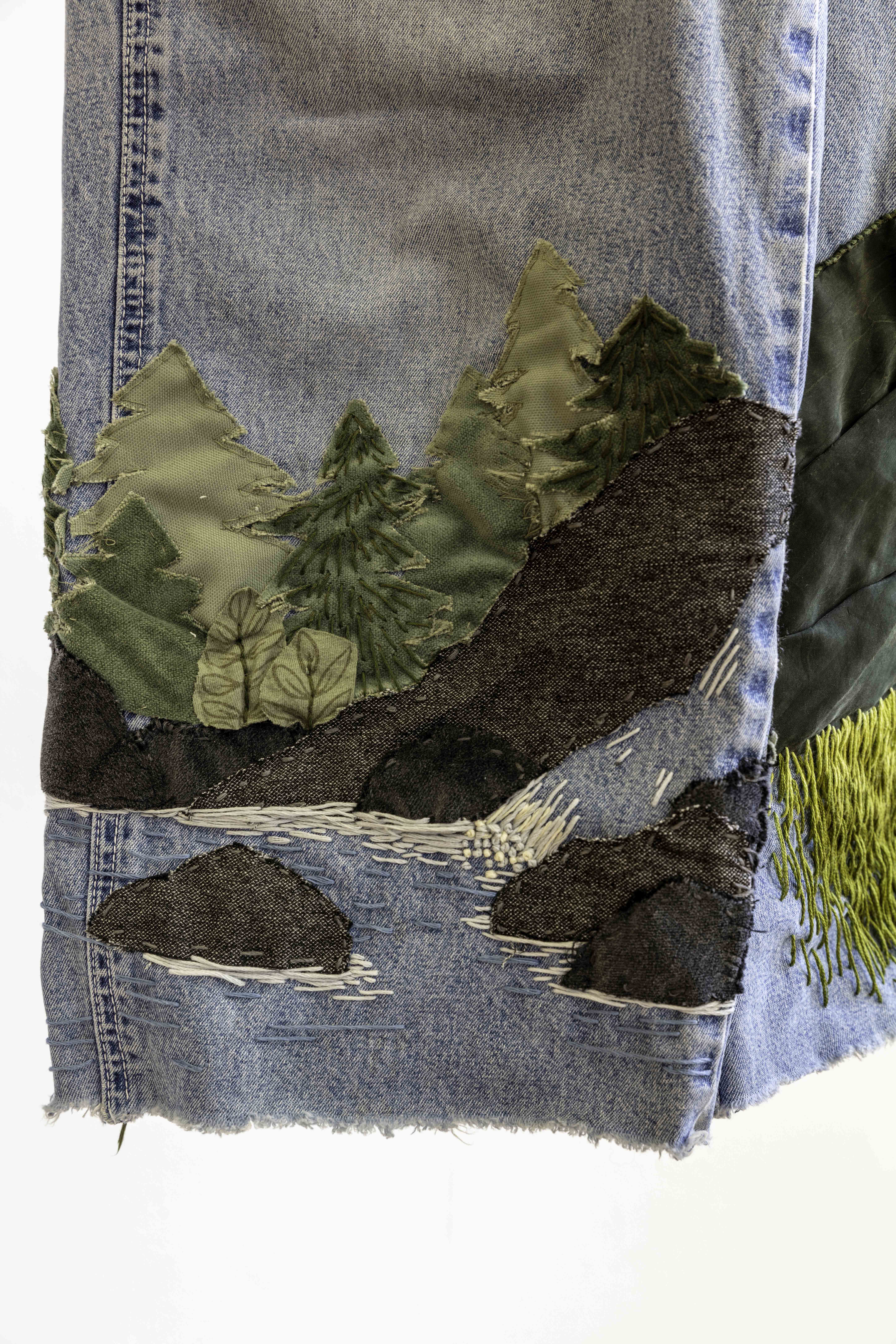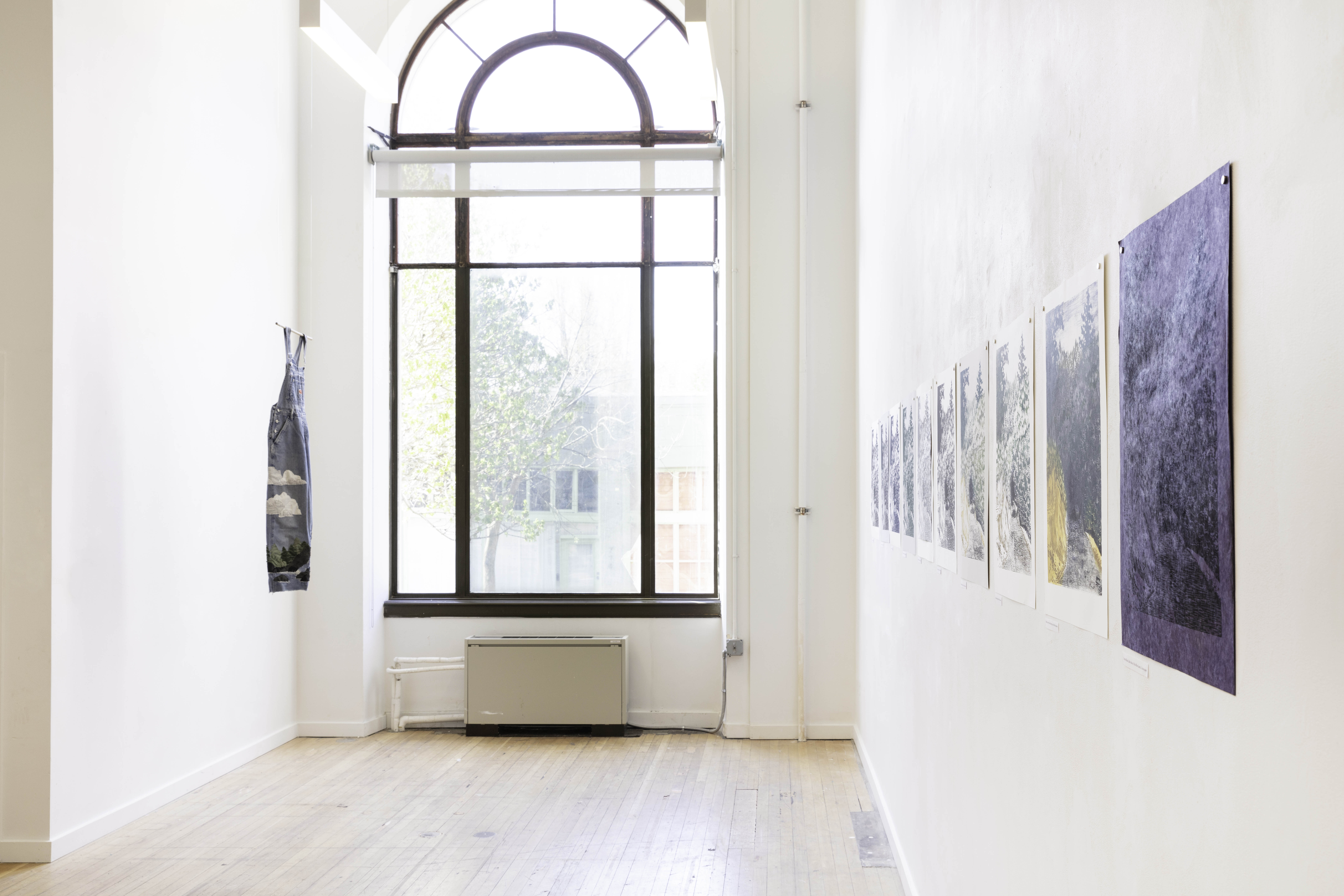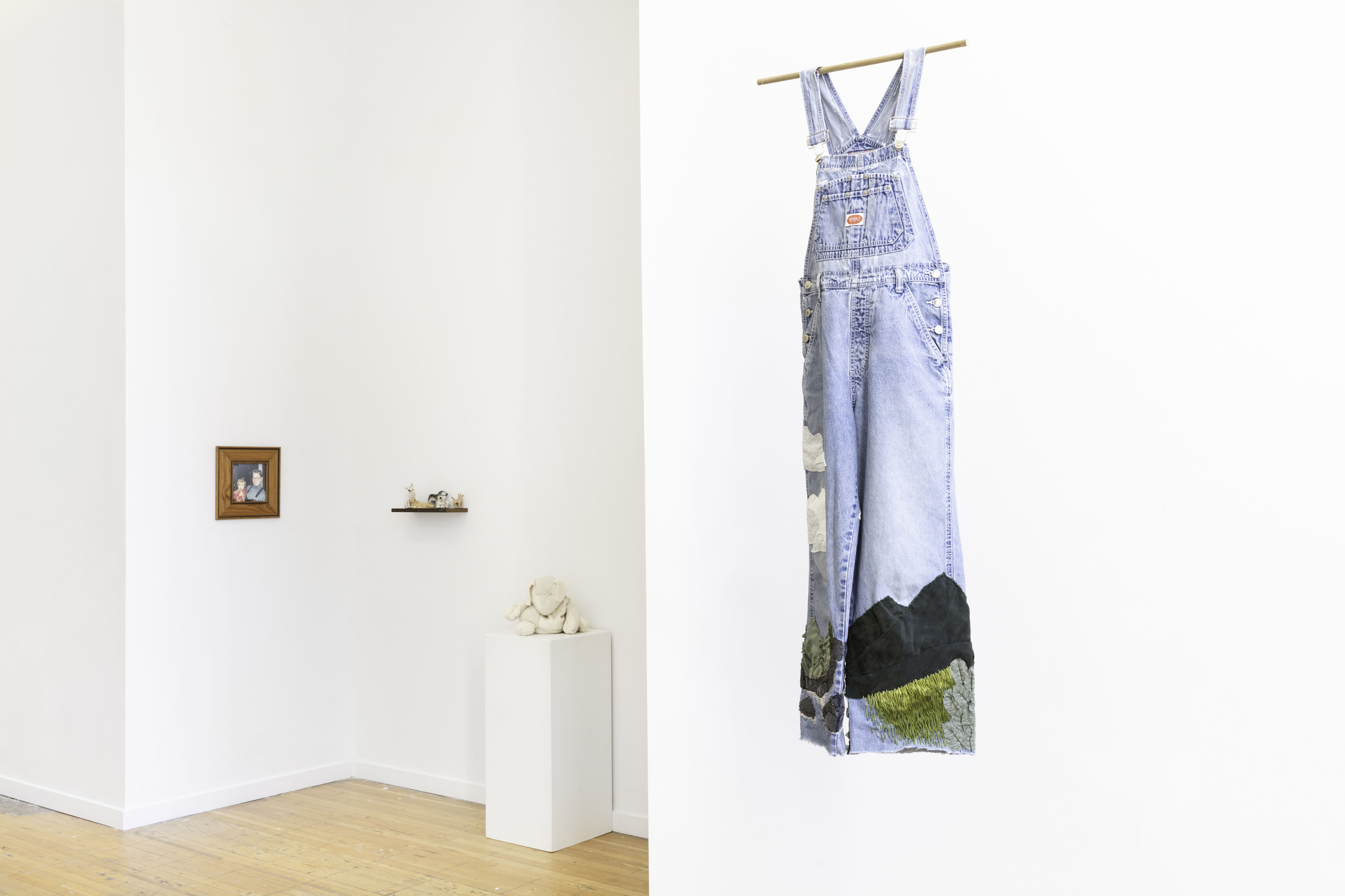 The Church is a Dog Park is a mixed media installation project that explores grief, memory, and the processing of loss through tactile art making. The work honors Ellen, an influential figure in the artist's life who took her own life in October 2023 due to health issues. Ellen, affectionately known as "the crazy dog lady" in their community, fostered numerous dogs and served as a third parental figure to the artist. The project's title stems from the poignant discovery that Ellen spent her final moments at what others called a church but she experienced as a dog park—a green space where she frequently walked her dogs. The installation comprises four primary components: ceramic figurines representing dogs significant to their shared history, embroidered and mended denim overalls symbolizing Ellen's practical nature, a weighted puppy-shaped soft sculpture referencing memories of carrying sleepy puppies during walks, and a variable edition of woodblock prints depicting The Dark Corner, a meaningful landscape from their walks together. Each medium serves as a different avenue for processing grief—the repetitive motions of embroidery, the grounding quality of clay work, and the layered transformations of printmaking mirror the complexities of mourning. Influenced by artists like Zoe Leonard, Felix Gonzalez-Torres, and Alison Bechdel, the work examines how objects and natural environments become vessels for memory. The project is informed by research on trauma, emotional connection in mammals, tactile art as therapy, and the concept of "a good death." Through visible mending, variable editions, and interactive elements, the project explores how grief, like art making, is a transformative process—not obscuring damage but acknowledging it while creating something newly meaningful.