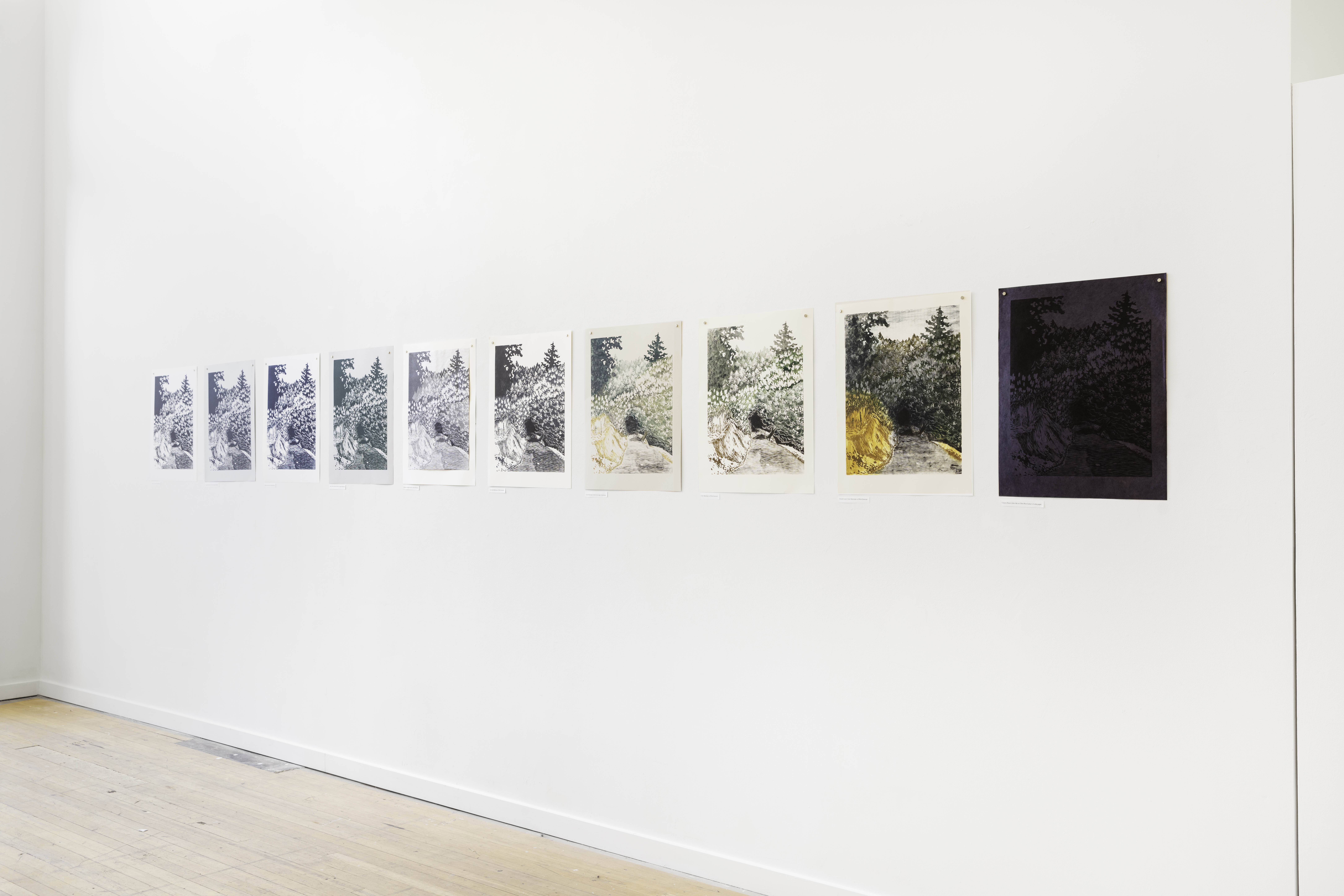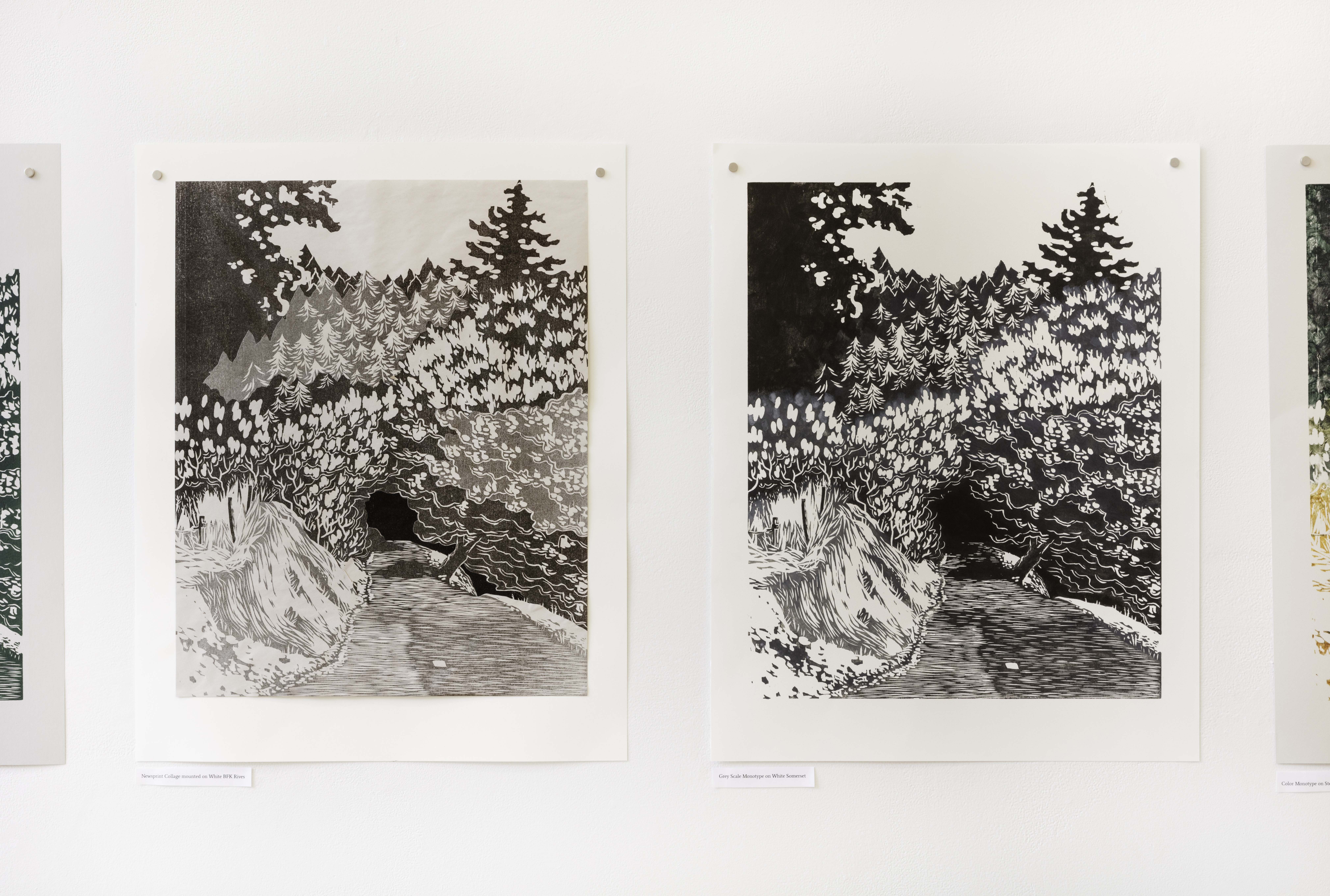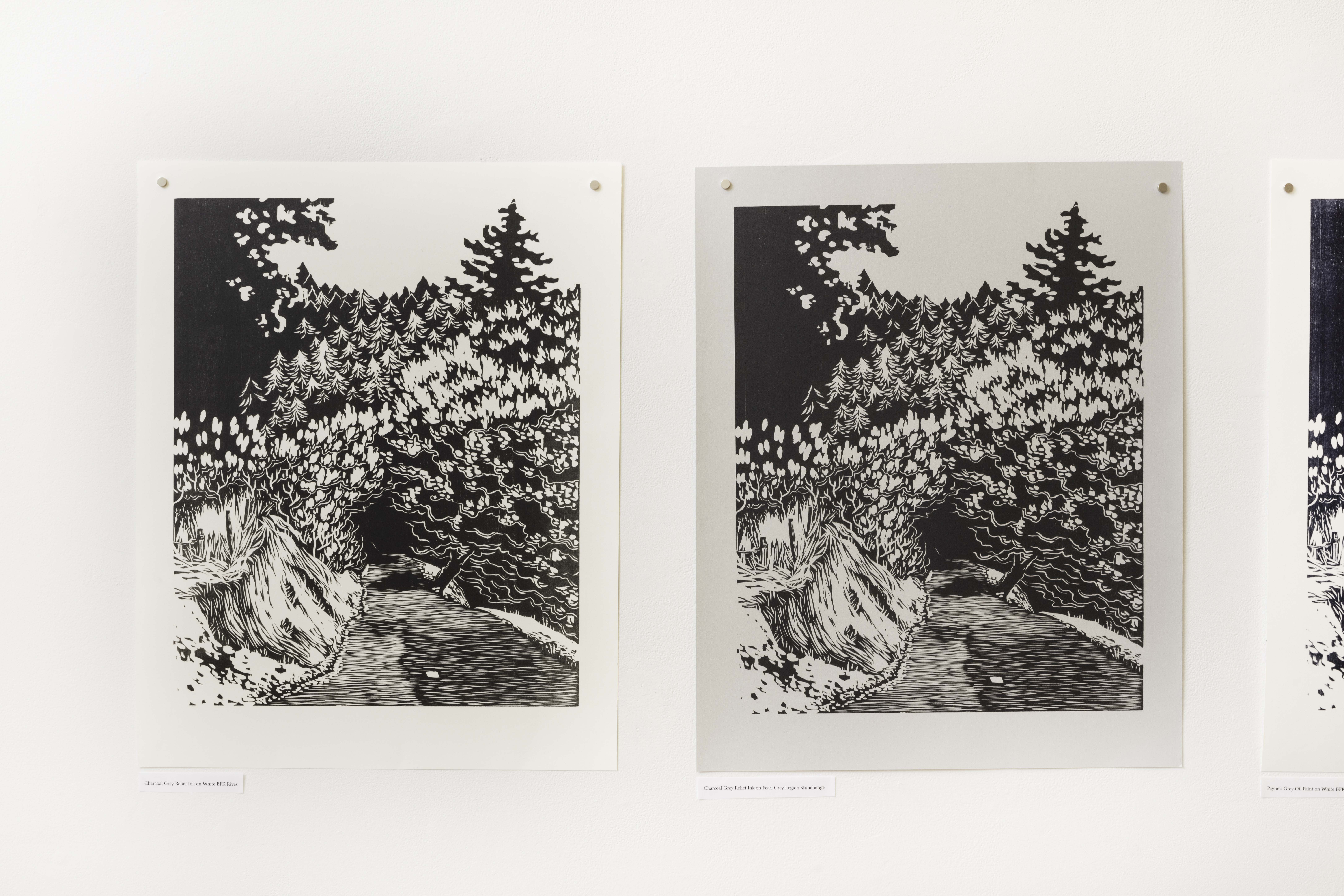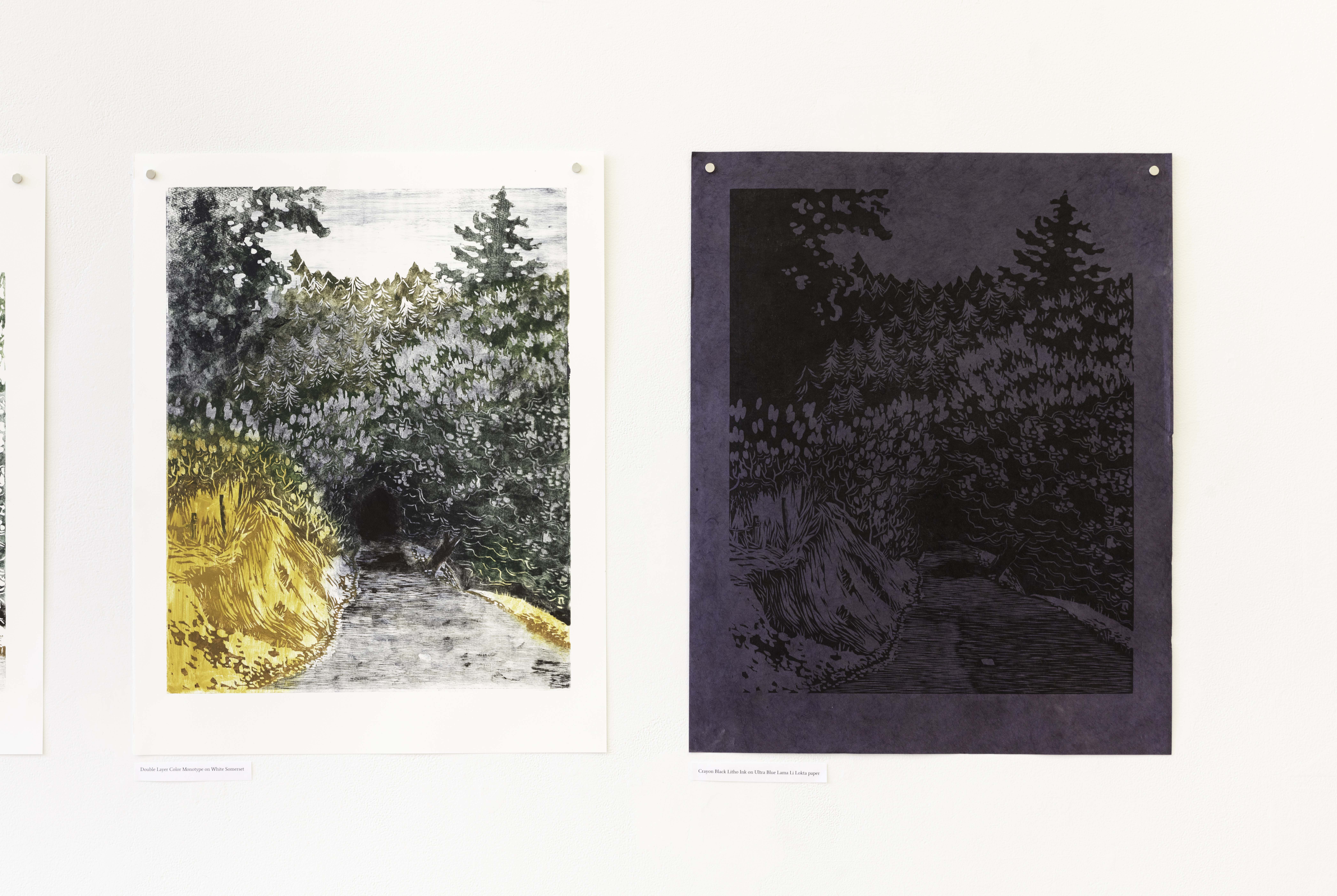 The Church is a Dog Park is a mixed media installation project that explores grief, memory, and the processing of loss through tactile art making. The work honors Ellen, an influential figure in the artist's life who took her own life in October 2023 due to health issues. Ellen, affectionately known as "the crazy dog lady" in their community, fostered numerous dogs and served as a third parental figure to the artist. The project's title stems from the poignant discovery that Ellen spent her final moments at what others called a church but she experienced as a dog park—a green space where she frequently walked her dogs. The installation comprises four primary components: ceramic figurines representing dogs significant to their shared history, embroidered and mended denim overalls symbolizing Ellen's practical nature, a weighted puppy-shaped soft sculpture referencing memories of carrying sleepy puppies during walks, and a variable edition of woodblock prints depicting The Dark Corner, a meaningful landscape from their walks together. Each medium serves as a different avenue for processing grief—the repetitive motions of embroidery, the grounding quality of clay work, and the layered transformations of printmaking mirror the complexities of mourning. Influenced by artists like Zoe Leonard, Felix Gonzalez-Torres, and Alison Bechdel, the work examines how objects and natural environments become vessels for memory. The project is informed by research on trauma, emotional connection in mammals, tactile art as therapy, and the concept of "a good death." Through visible mending, variable editions, and interactive elements, the project explores how grief, like art making, is a transformative process—not obscuring damage but acknowledging it while creating something newly meaningful.