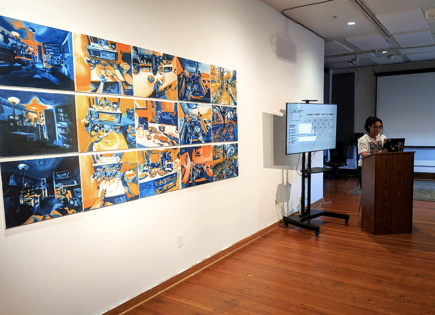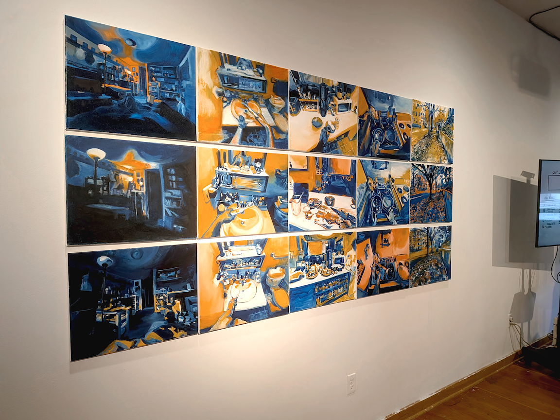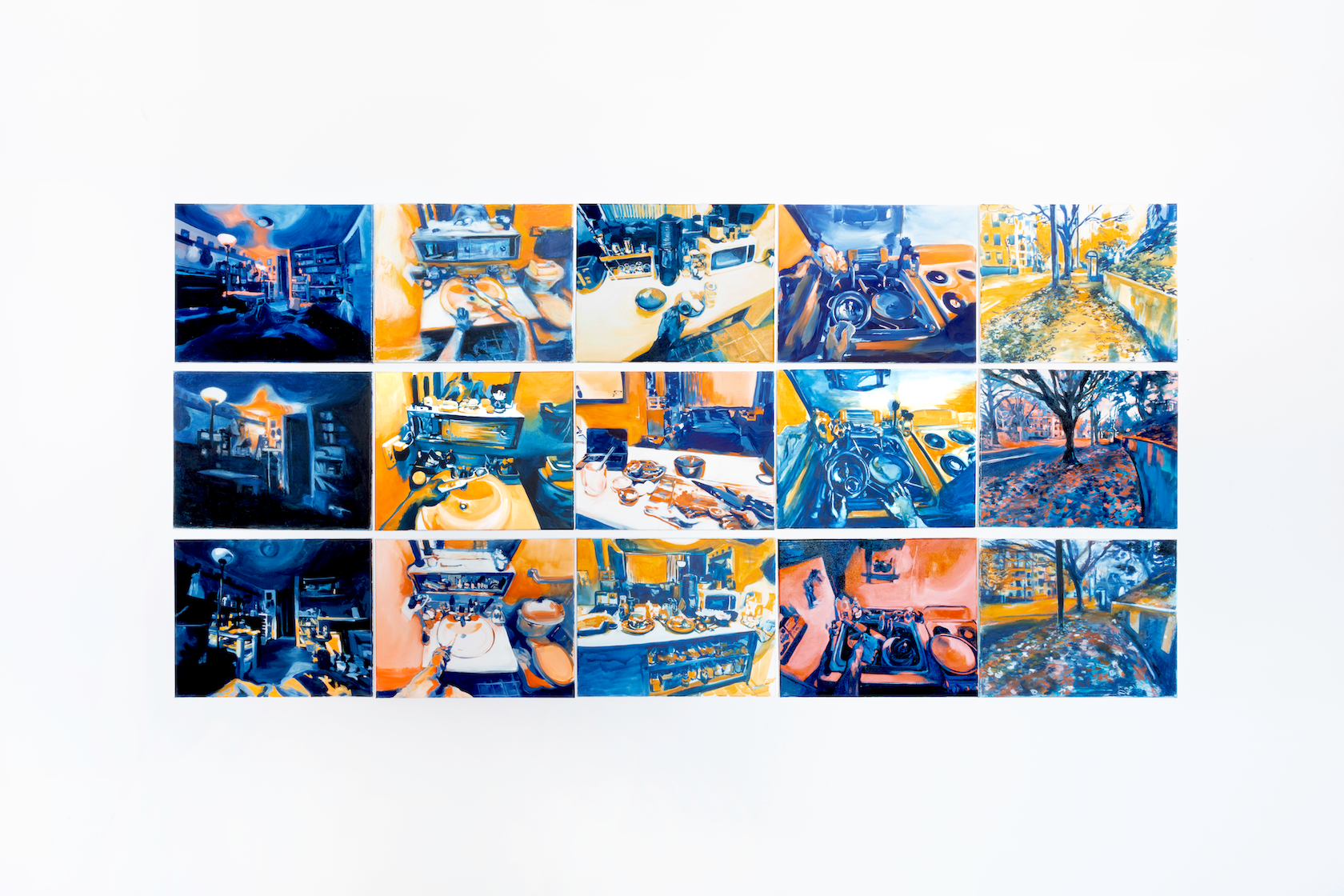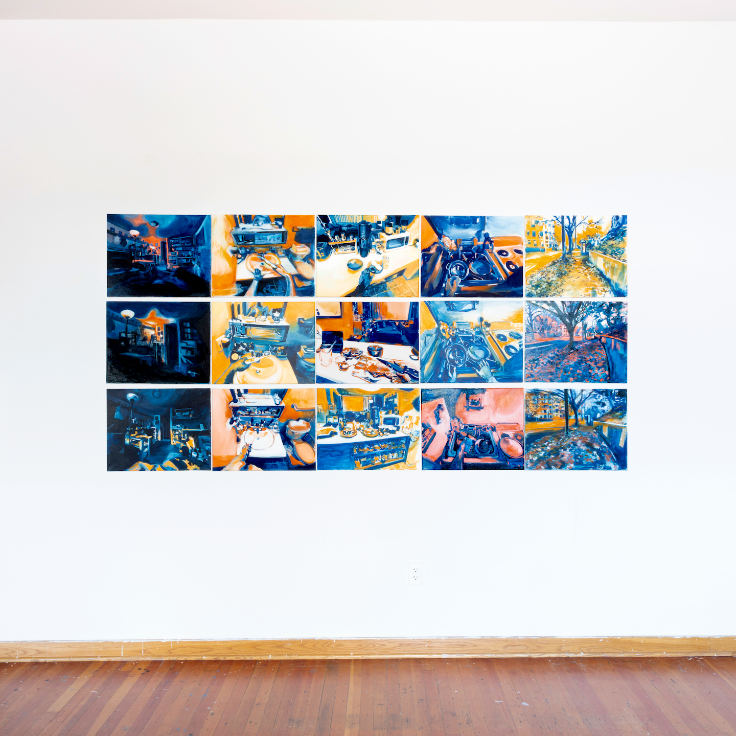 The Beauty of the Mundane is a series of autobiographical still-life illustrative works by Claire Weitz. Fifteen paintings are used to depict three days of repeating actions, each respectively translated in three different mediums. Five mediums are used in total; oil paint, oil pastel, acrylic paint, gouache and watercolor. Arranged in a 3×5 grid, read left to right, are the following subjects: waking up, brushing my teeth, making food, doing the dishes, and the walk home.