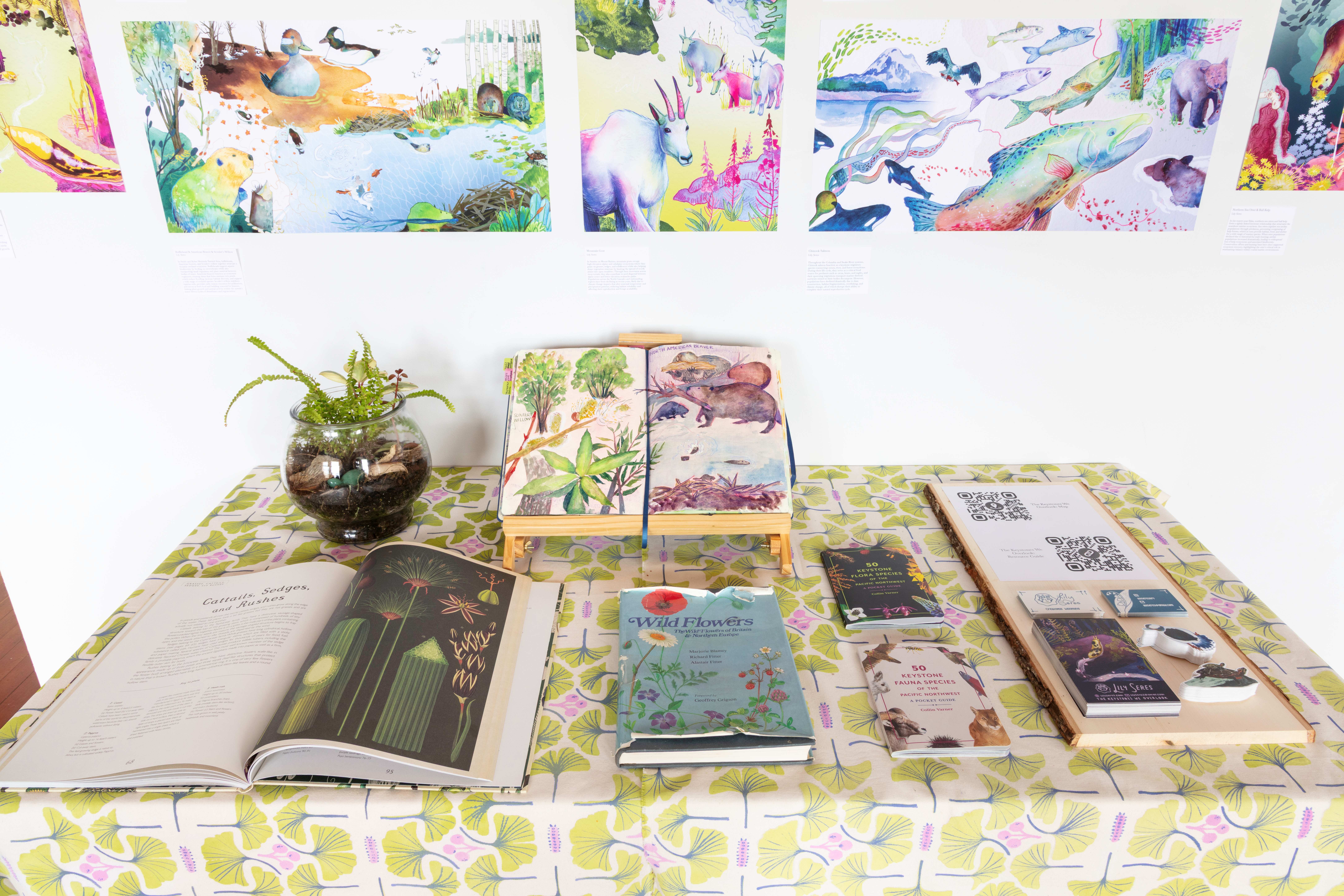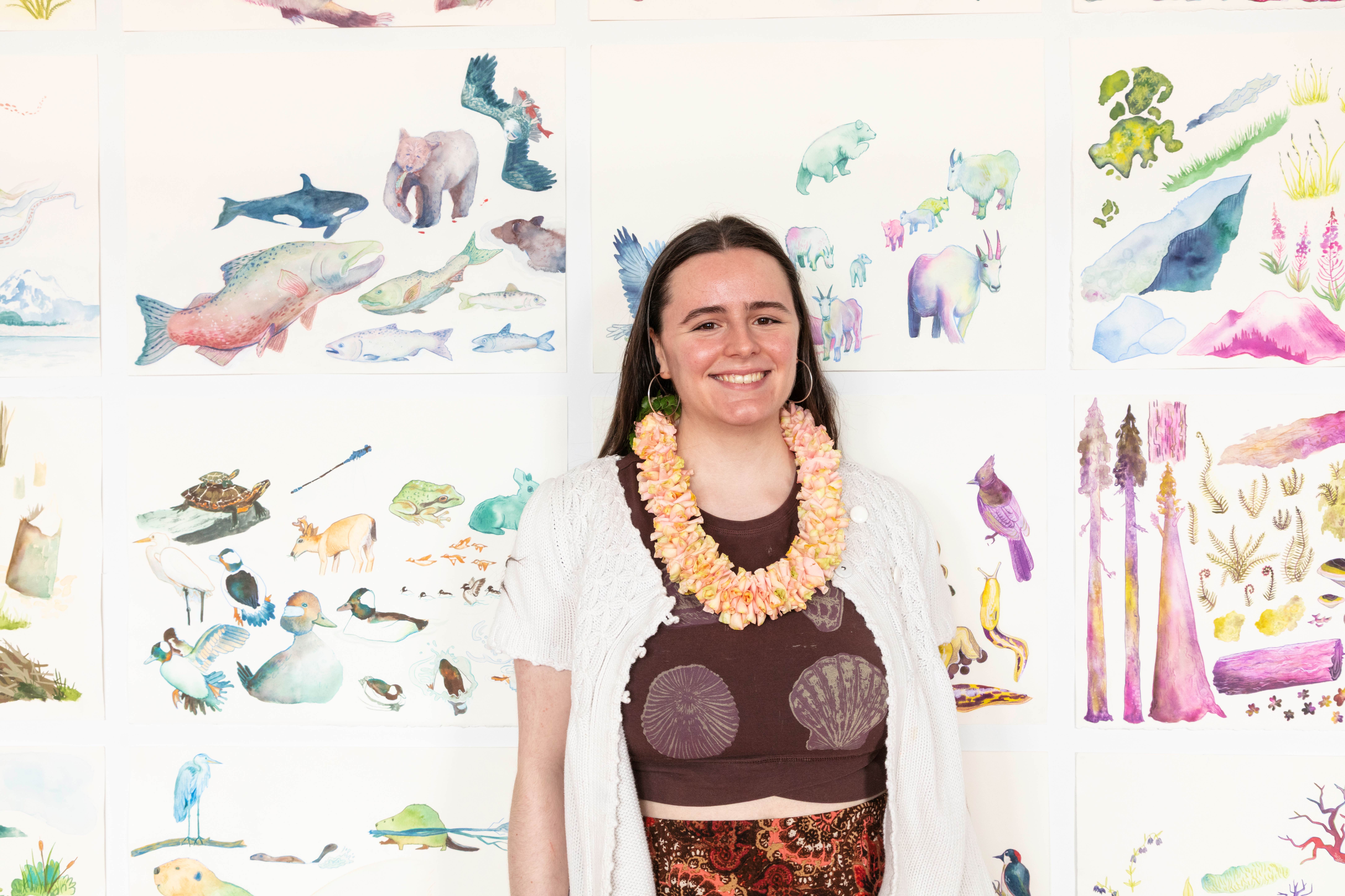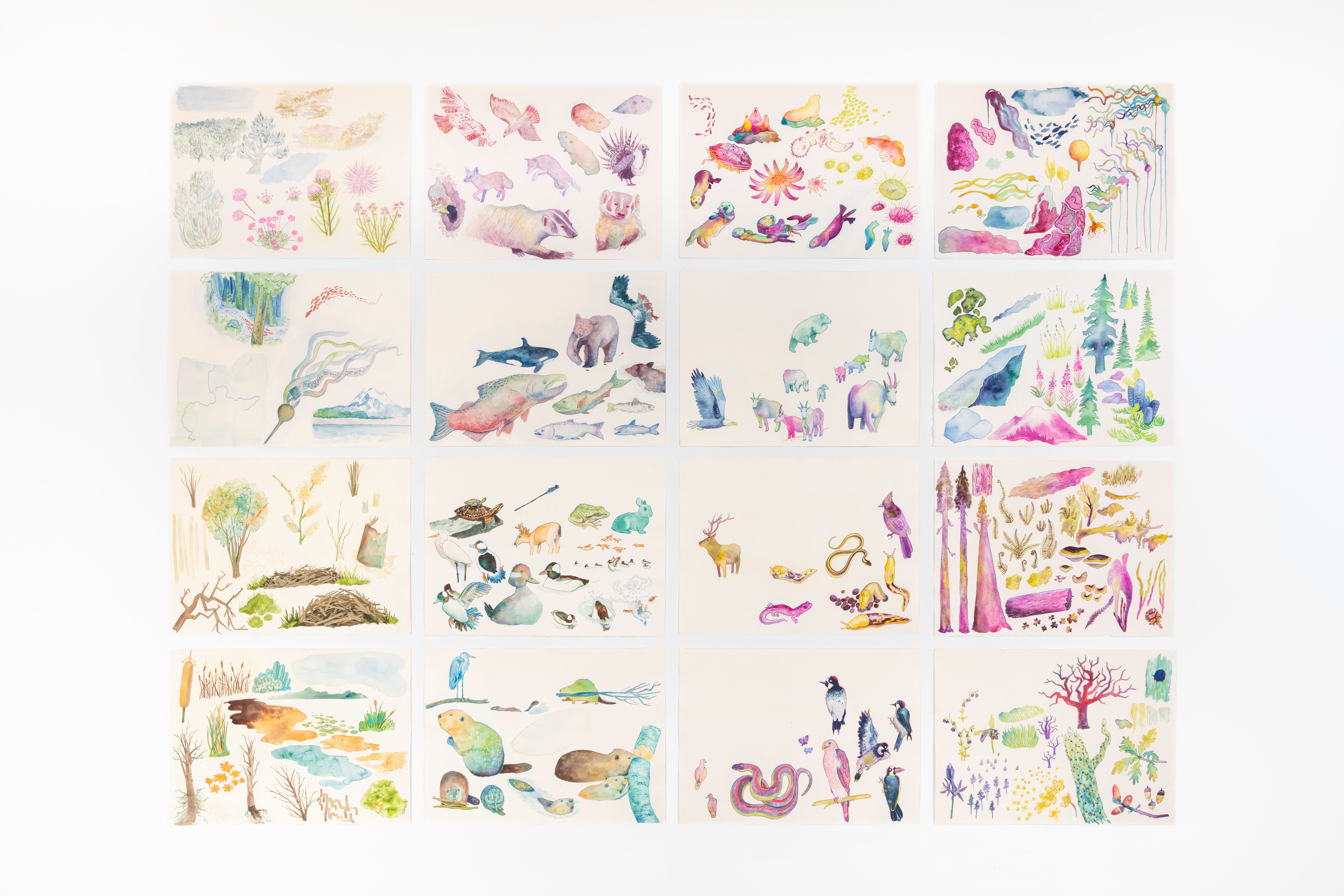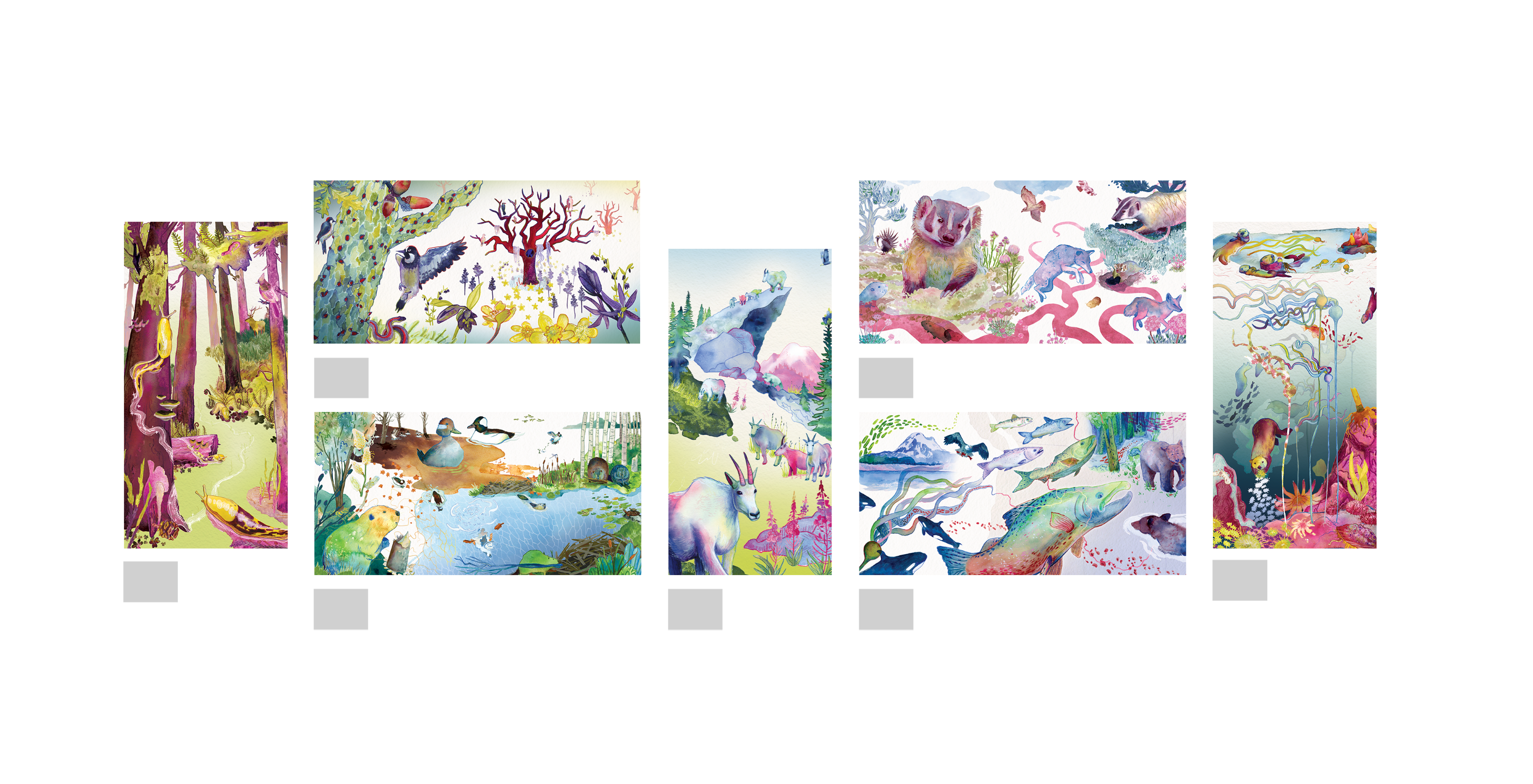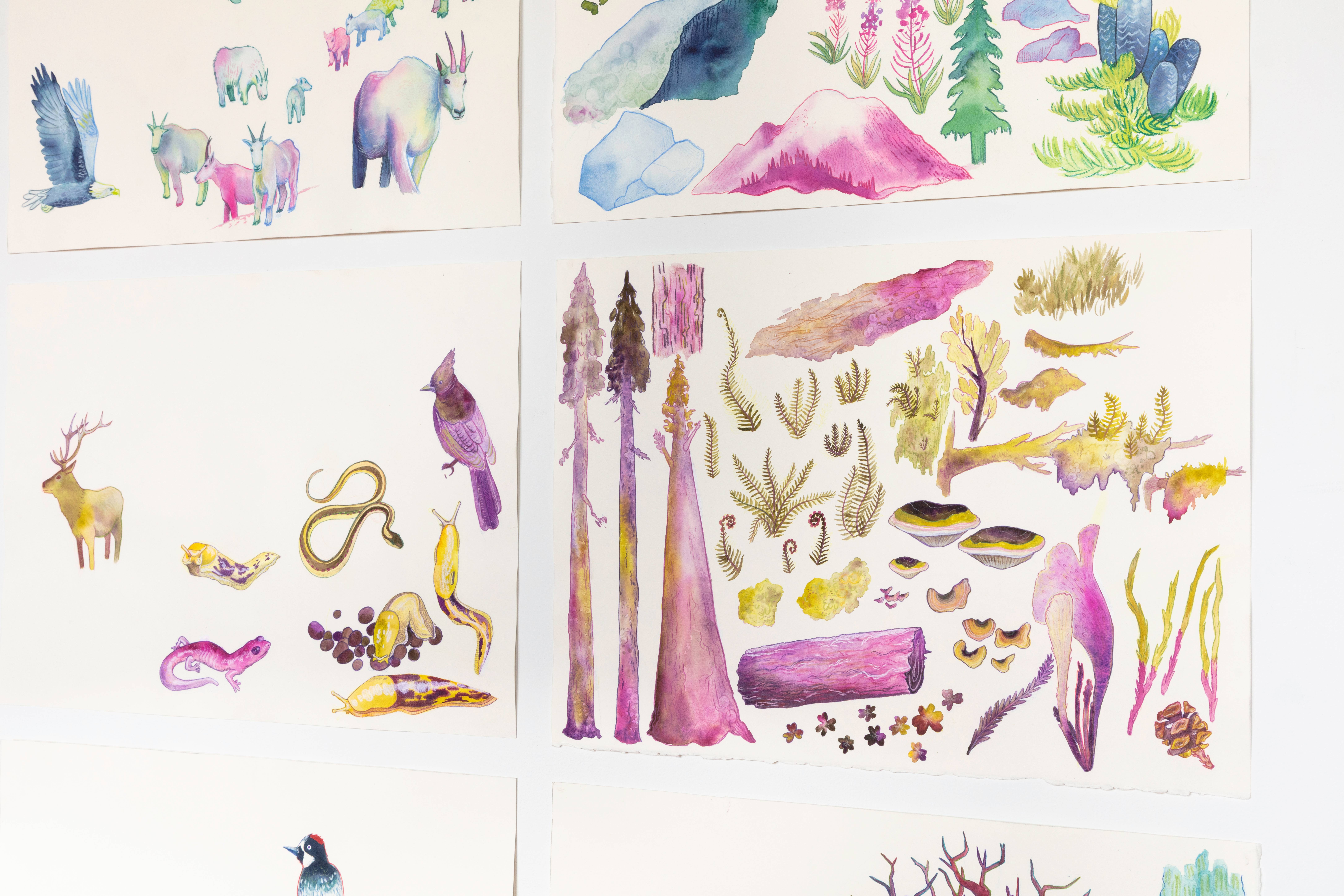 This series of seven digitally collaged watercolor paintings visually illustrates the stories of how Pacific Northwest keystone species interconnect with their ecosystems. The pieces include the Banana Slug & coastal Redwood, Oregon White Oak & Acorn Woodpecker, Bufflehead & American Beaver & Scouler’s Willow, Mountain Goat, American Badger, Chinook Salmon, and Northern Sea Otter & Bull Kelp. My intention is to draw the viewer in by portraying the beauty that nature has to offer. Each piece feels unique while all having the same bright, playful, and colorful energy. Just like a real ecosystem, there’s always a detail you didn’t notice the first time, causing the viewer to linger in each piece. The diverse group of animals and plants are accompanied by title cards briefly explaining each scene and how the keystone species benefits its ecosystem. My explanation then teaches the viewer about the interactions in each piece, leading to a further understanding and appreciation for the environments. The reason I made the series specific to the PNW was to create a greater connection with my local audience. My goal is to share this series and, in turn, inspire ecological awareness.