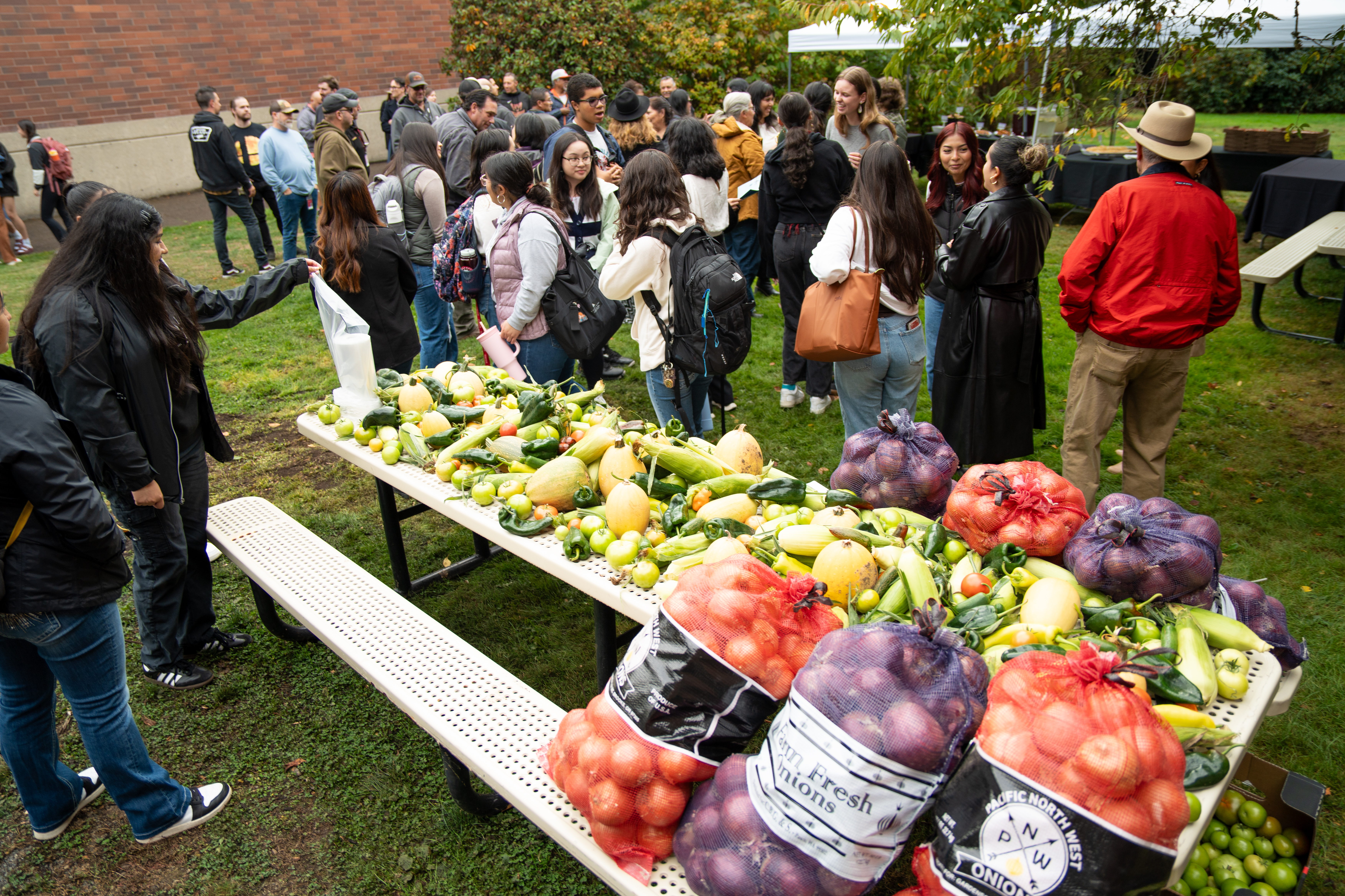 Photograph of attendees selecting vegetables from a picnic table during Mr. Alfonso Guzmán's dedication ceremony.