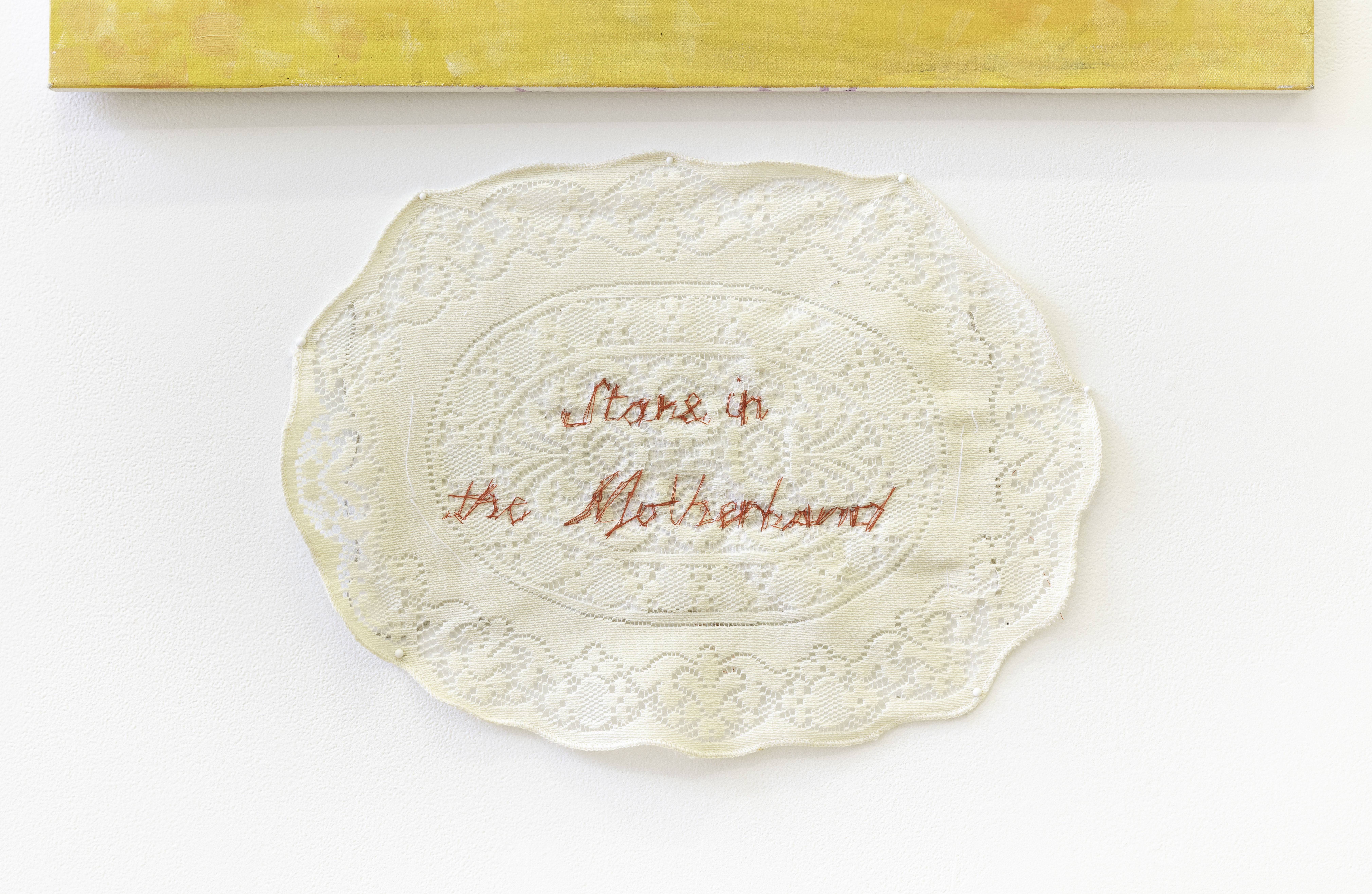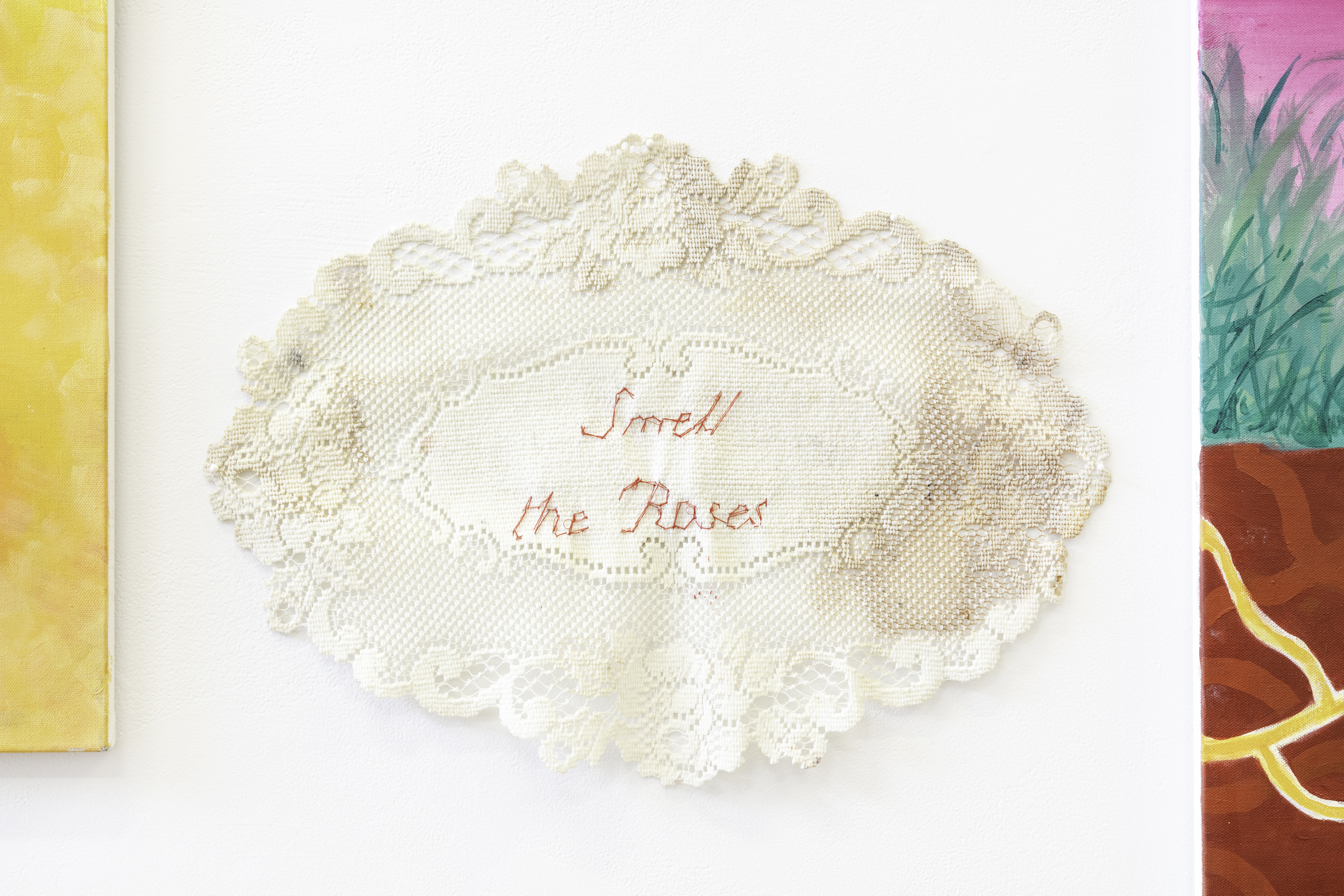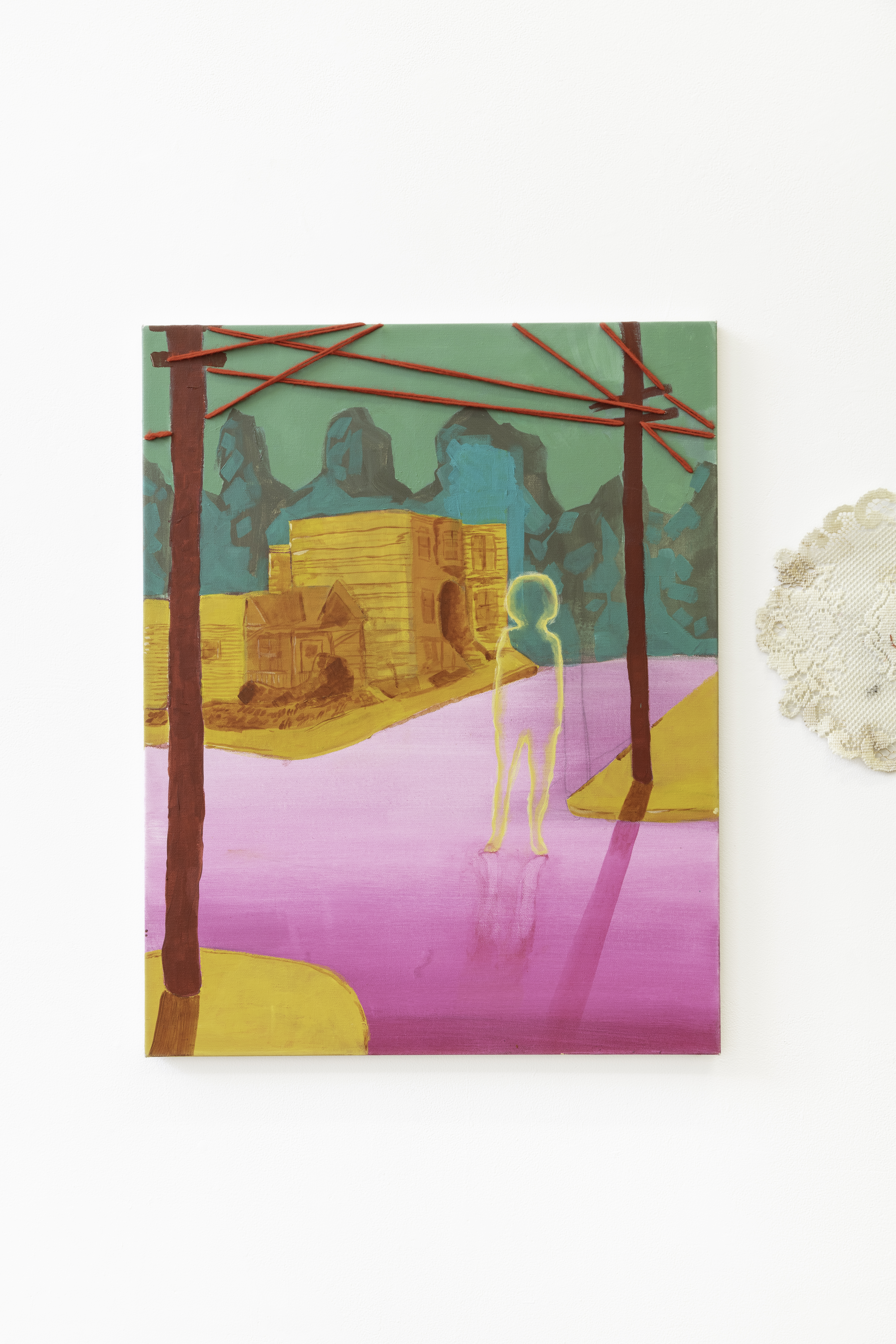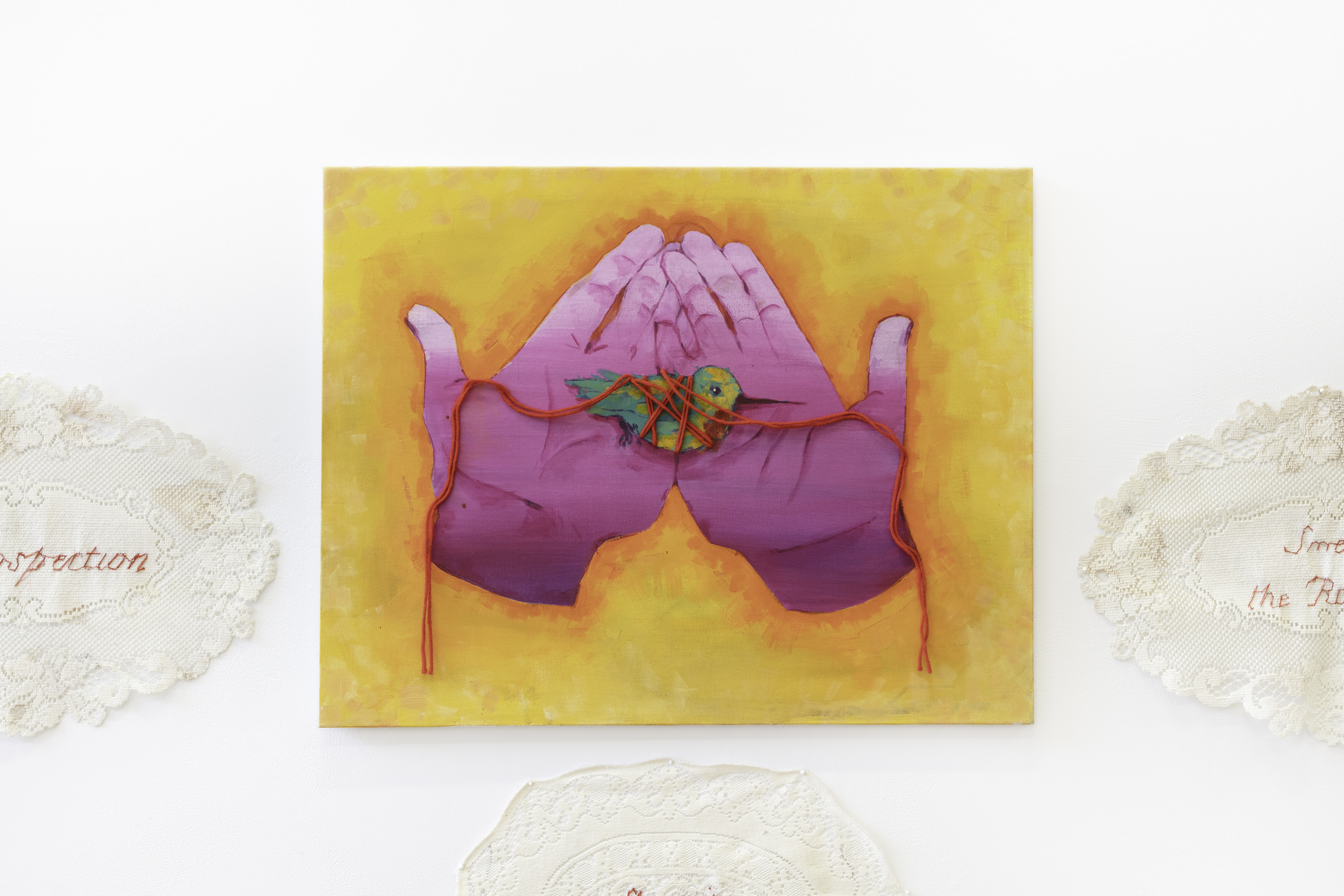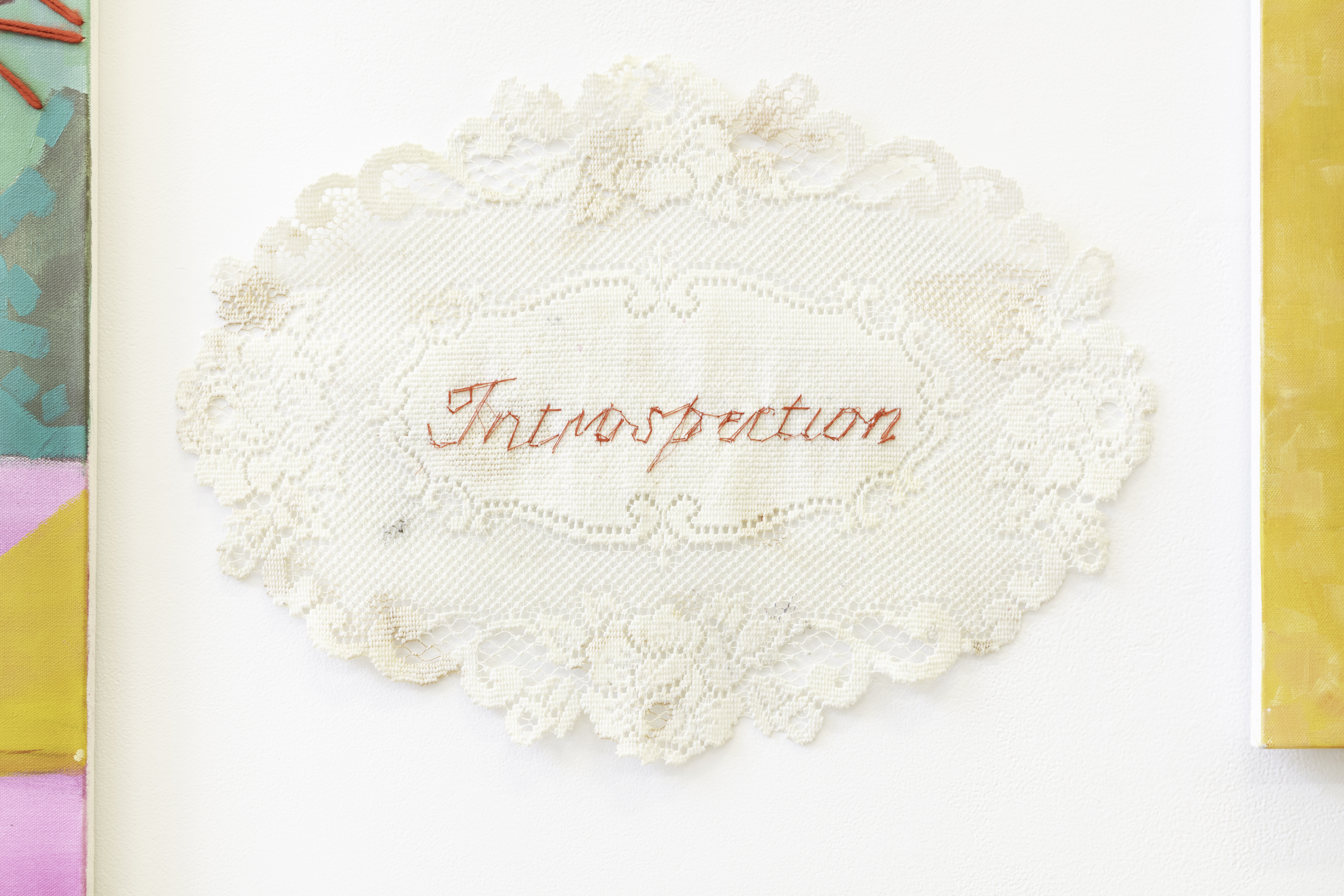 Introspection: the examination or observation of one's own mental and emotional process. This set of three paintings and three embroidered doilies simultaneously evokes feelings of isolation and connection, as well as growth.