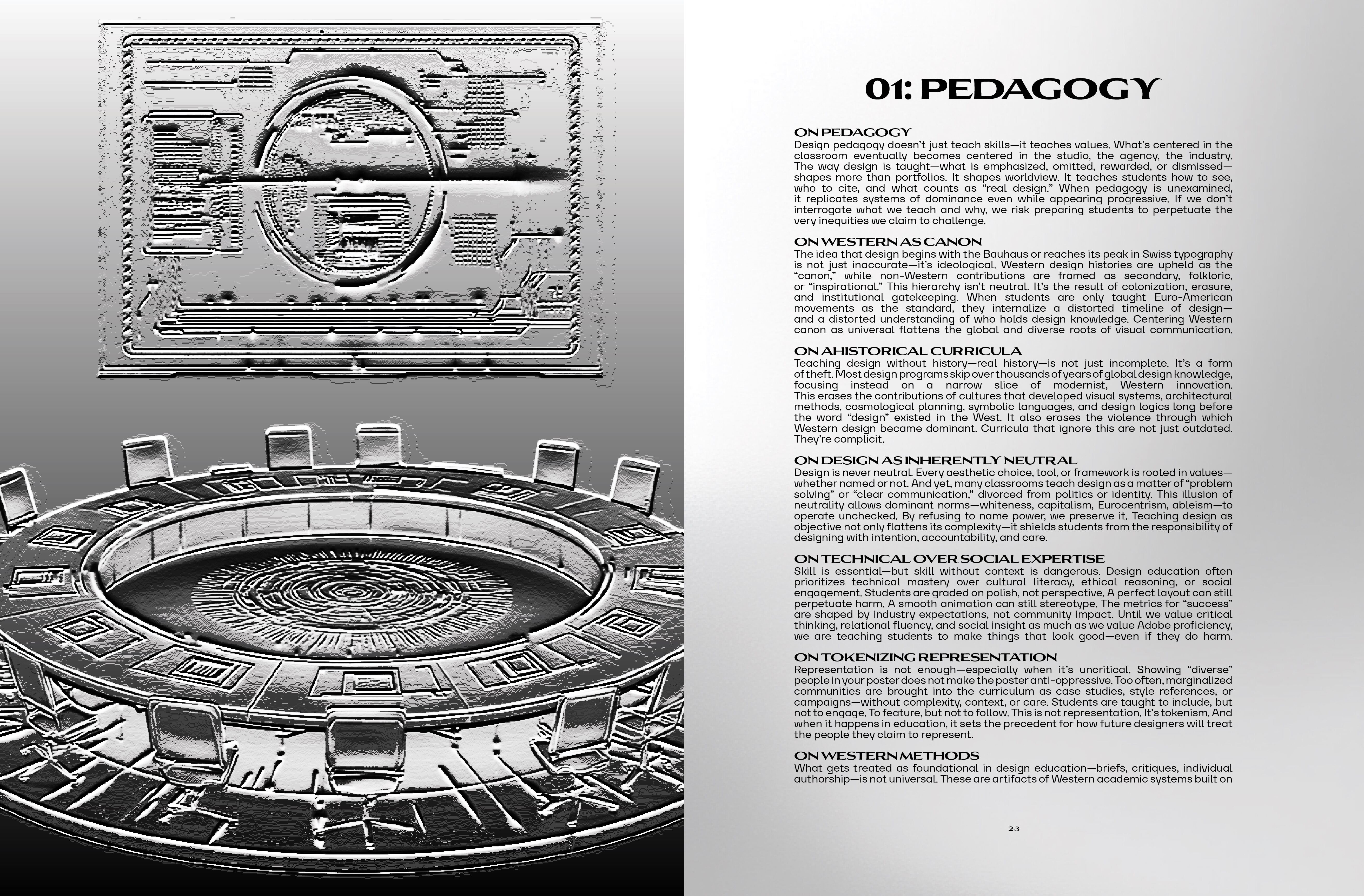 | dc.description.abstract | Full Thesis Statement / Abstract: “The Future of Design (and of the World) Is Holistic: Examining & Transcending Western Design Pedagogy, Practice & Paradigm” is a digital thesis booklet that positions design as a world-building force and posits that an equitable, efficient, and holistic design industry—and world—is vital, denouncing Western design as canon. Drawing from global pre-colonial design histories, contemporary critique, and speculative frameworks, it presents a compelling case for reorienting design education, industry standards, and everyday applications—advocating for design in service of the collective good. | |