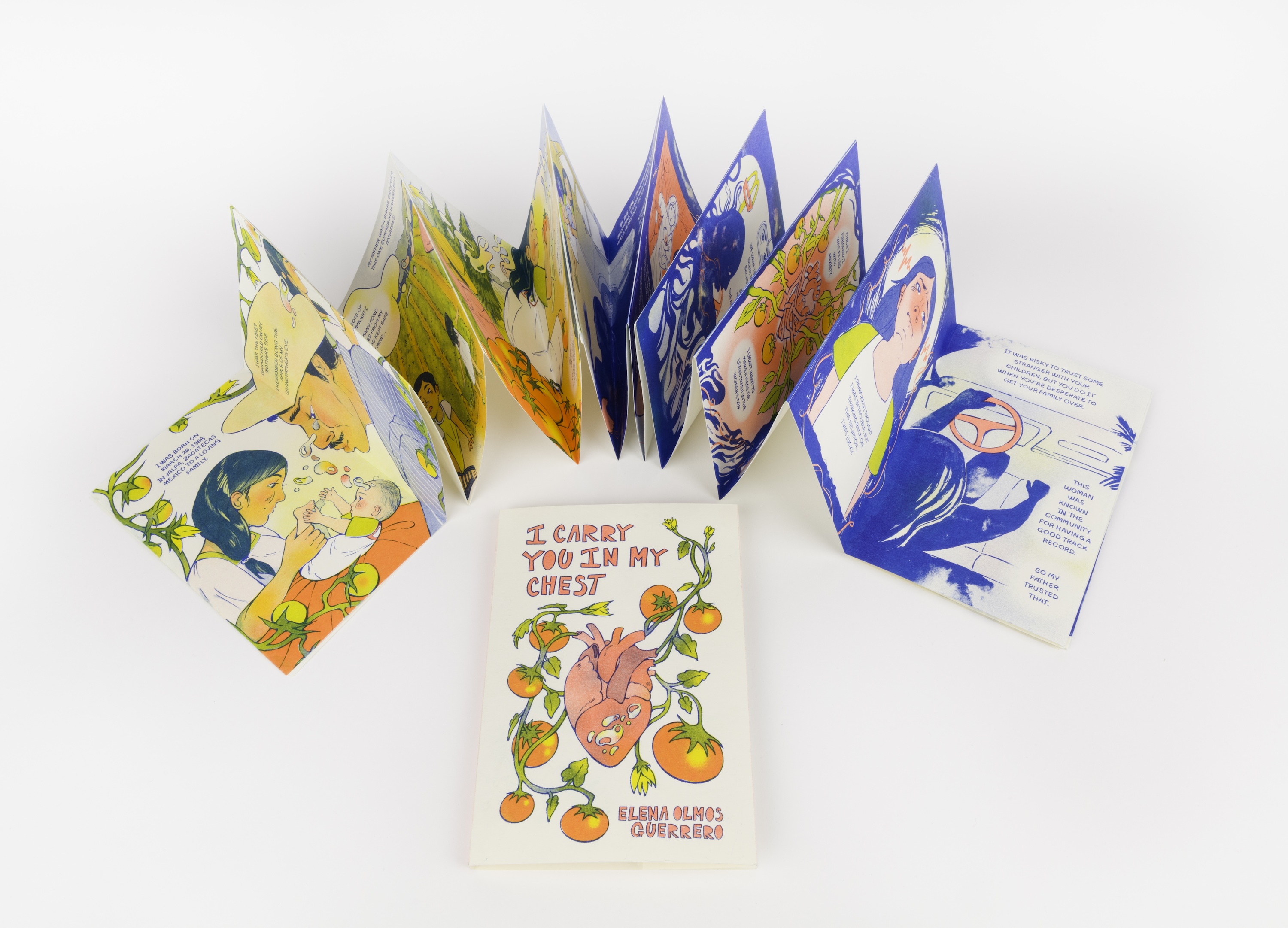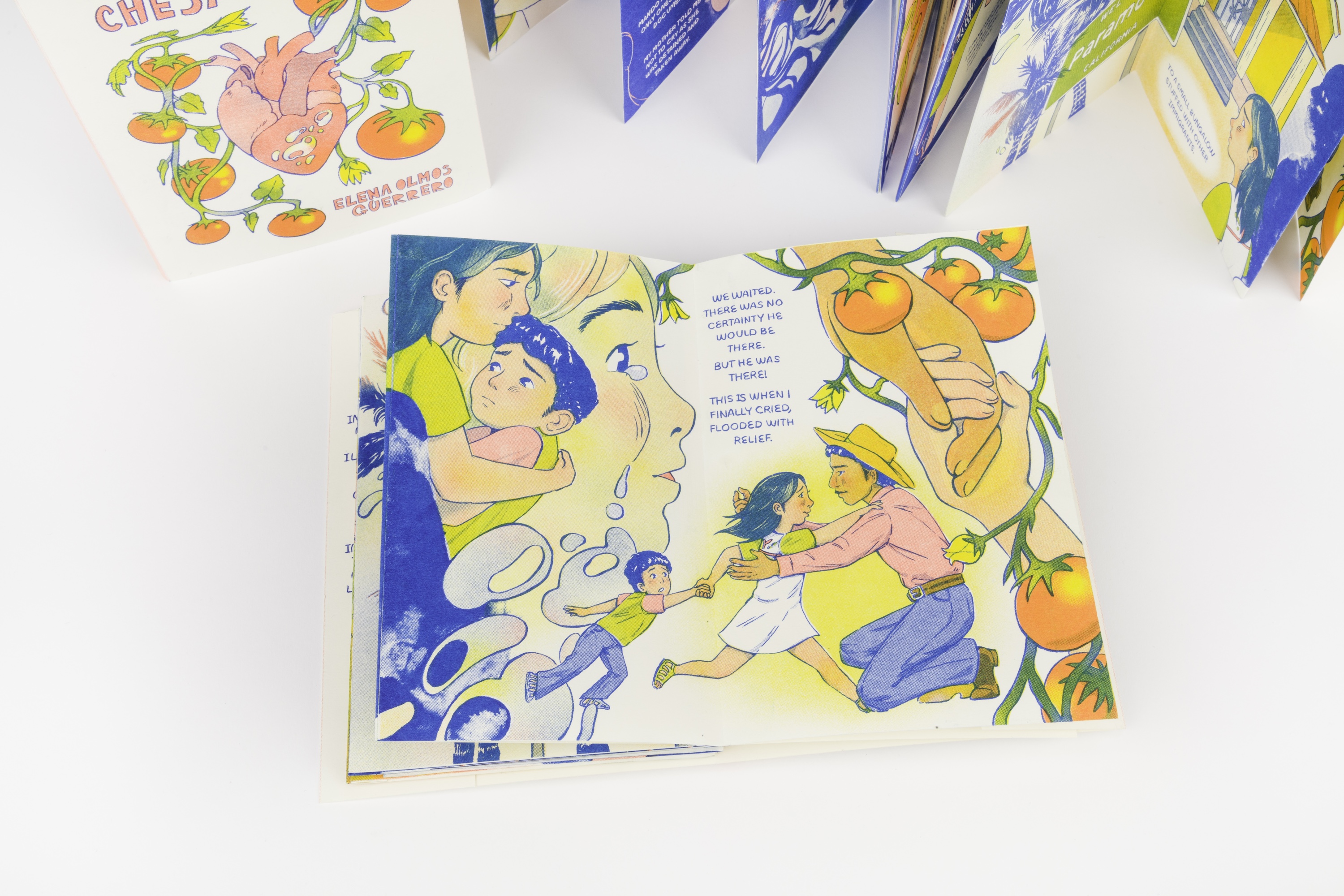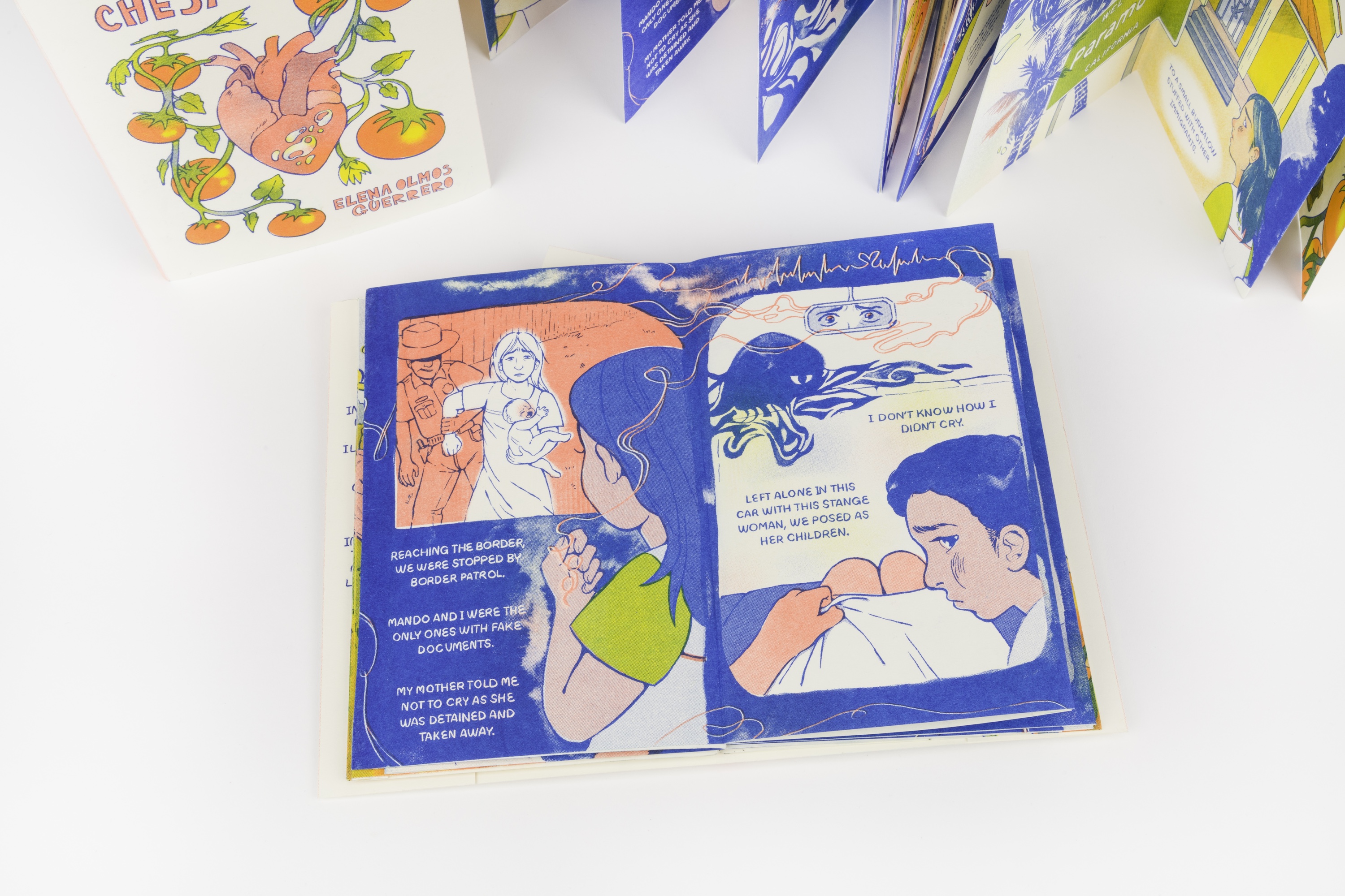 Riso-printed and hand-bound with love: An accordion style booklet illustrating the story of my mother crossing the U.S.-Mexico border. Composed in 20 pages, my project illustrates my mother crossing the border as a young girl. The story starts with her early life in Mexico, recalling the family and life she left behind when joining her father in the United States. The line work is drafted in Sumi Ink, scanned and taken to a digital format in order to prepare to be RISO printed. This booklet has two functions, to be read as a book from left to right or completely unfolded and seen in a panoramic view. Although this project relies heavily on the illustrations, there is text to help guide the reader and provide context. It is an illustrated narrative with picture book and comic influences without strongly leading into either or. The booklet will live inside a dust cover, encouraging the reader to take it out of the original format and engage with the accordion style folding techniques. I want the reader to empathize and connect with the content conveying how personal this story is to me and share that to the community. This project all started with an interview, I took that interview and illustrated it through my perspective.