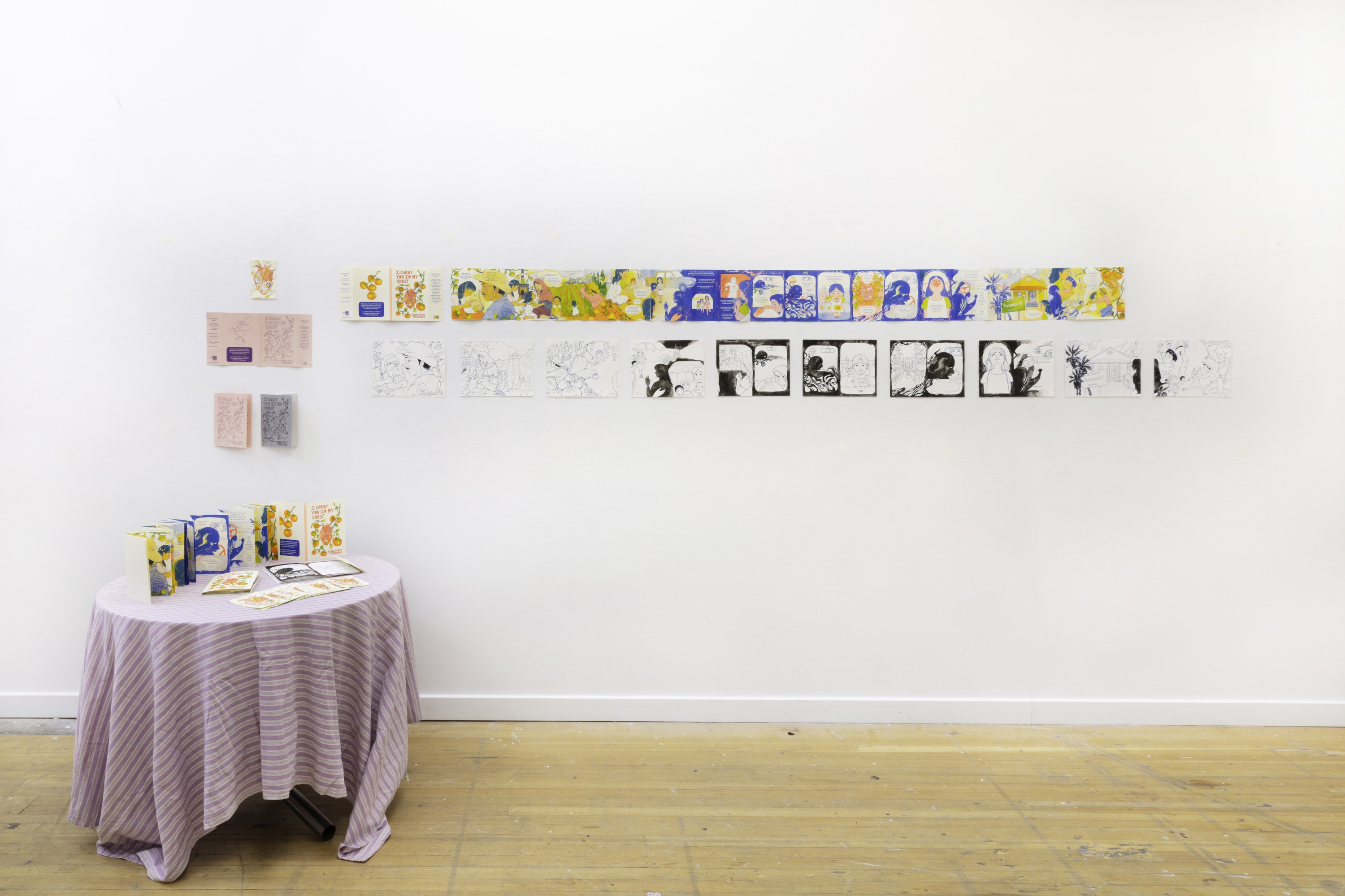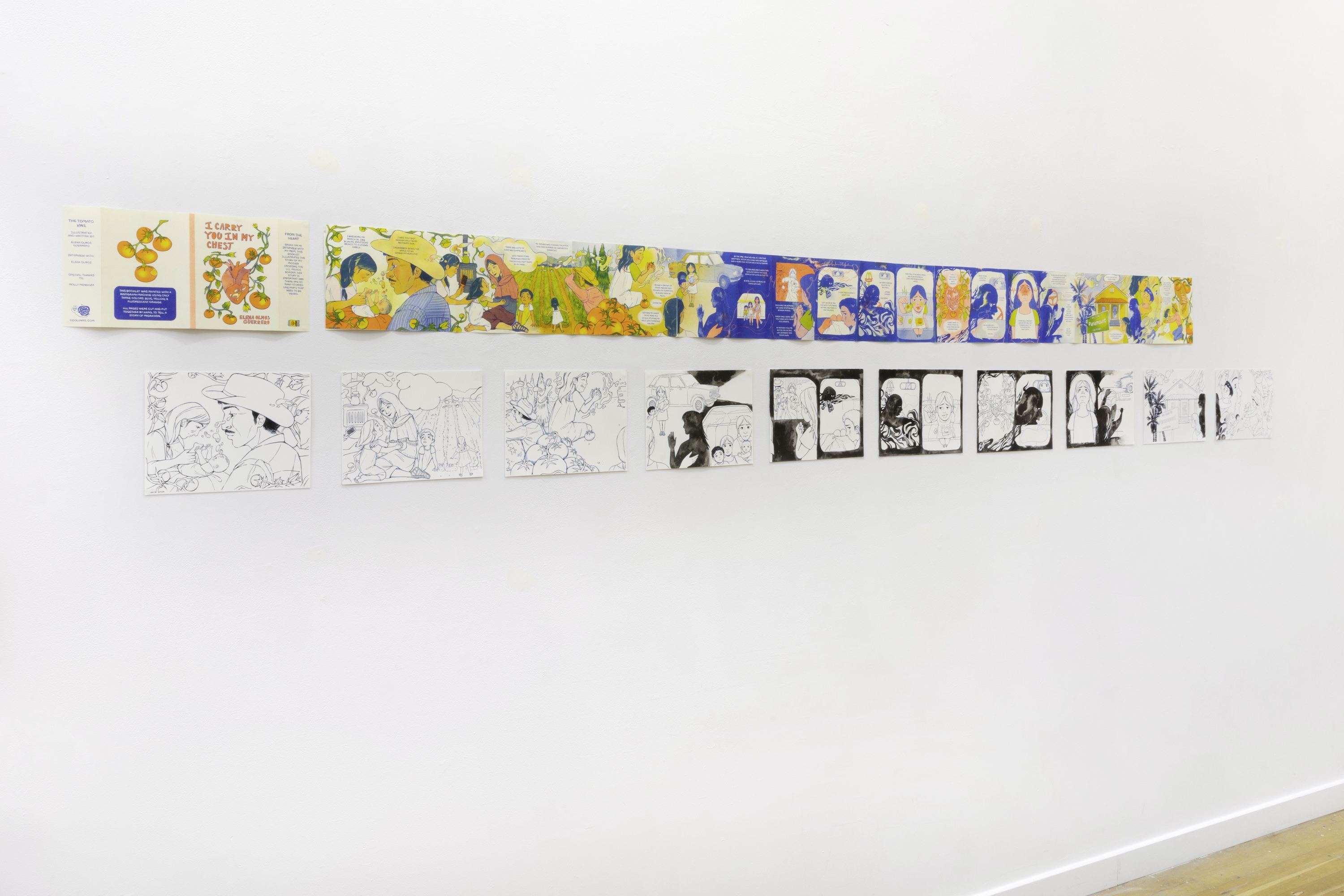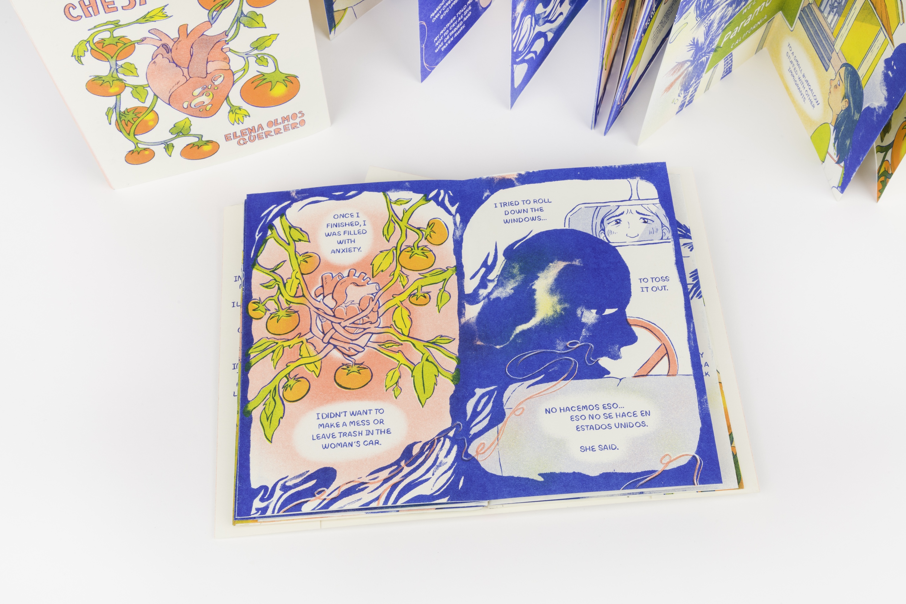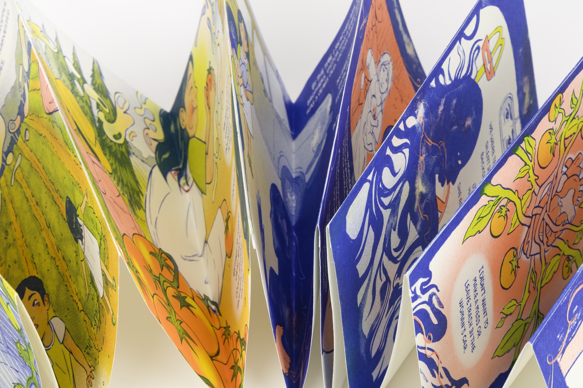 Riso-printed and hand-bound with love: An accordion style booklet illustrating the story of my mother crossing the U.S.-Mexico border. Composed in 20 pages, my project illustrates my mother crossing the border as a young girl. The story starts with her early life in Mexico, recalling the family and life she left behind when joining her father in the United States. The line work is drafted in Sumi Ink, scanned and taken to a digital format in order to prepare to be RISO printed. This booklet has two functions, to be read as a book from left to right or completely unfolded and seen in a panoramic view. Although this project relies heavily on the illustrations, there is text to help guide the reader and provide context. It is an illustrated narrative with picture book and comic influences without strongly leading into either or. The booklet will live inside a dust cover, encouraging the reader to take it out of the original format and engage with the accordion style folding techniques. I want the reader to empathize and connect with the content conveying how personal this story is to me and share that to the community. This project all started with an interview, I took that interview and illustrated it through my perspective.