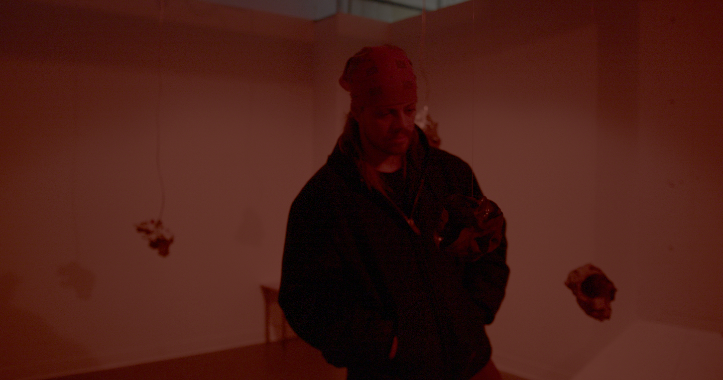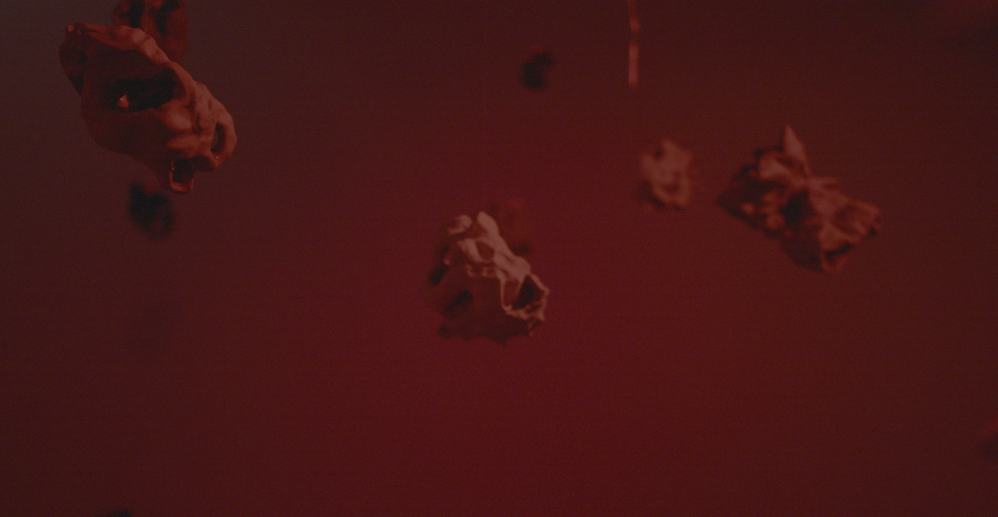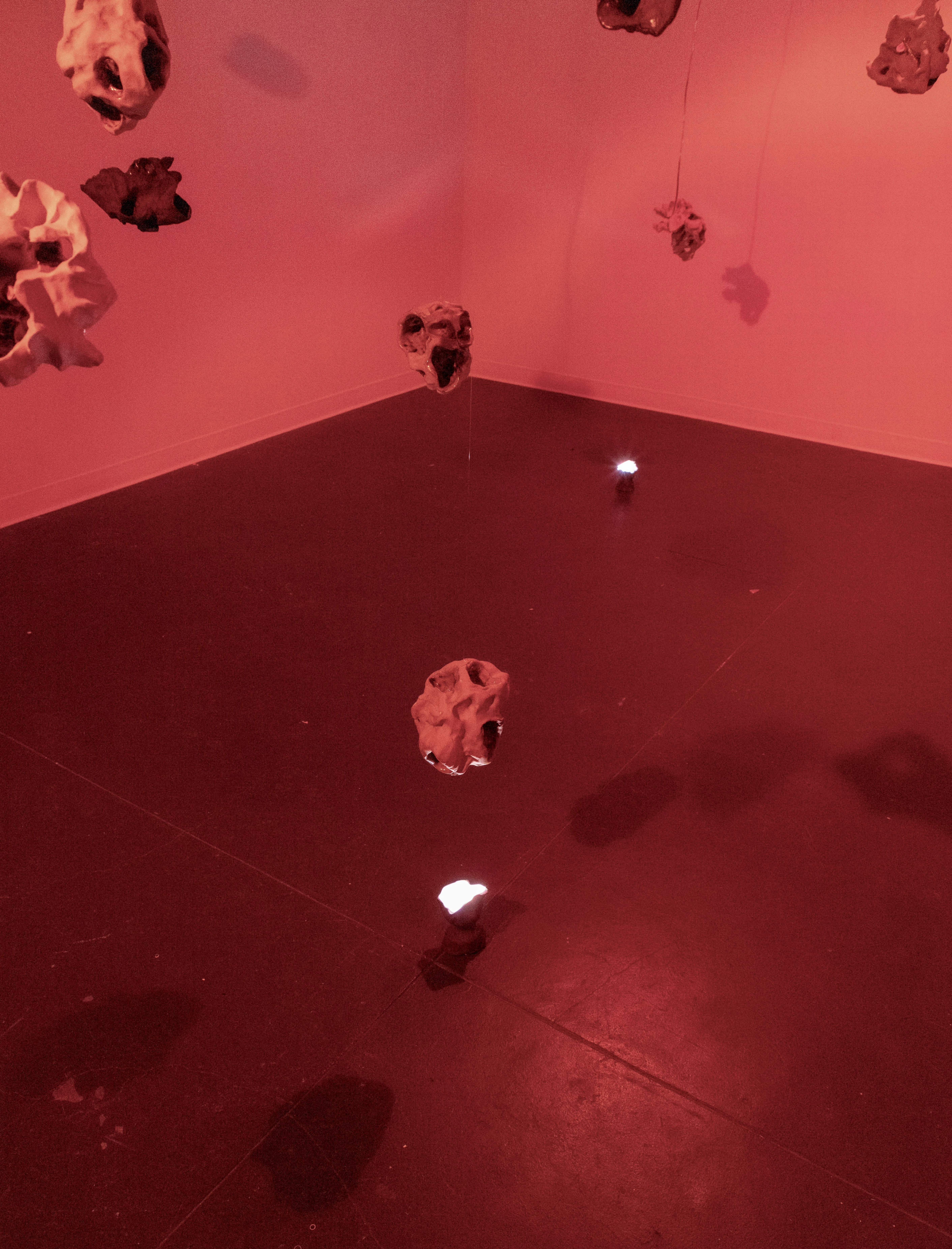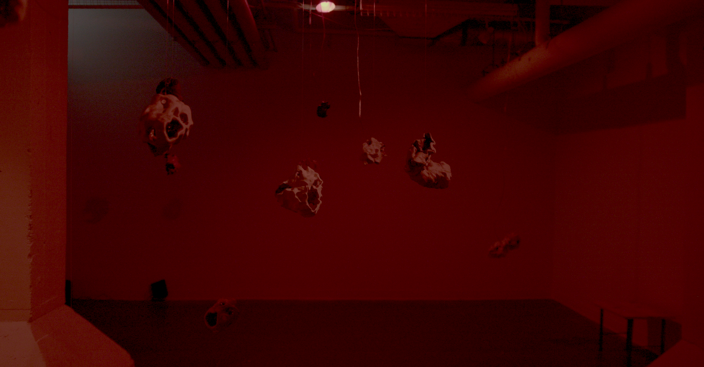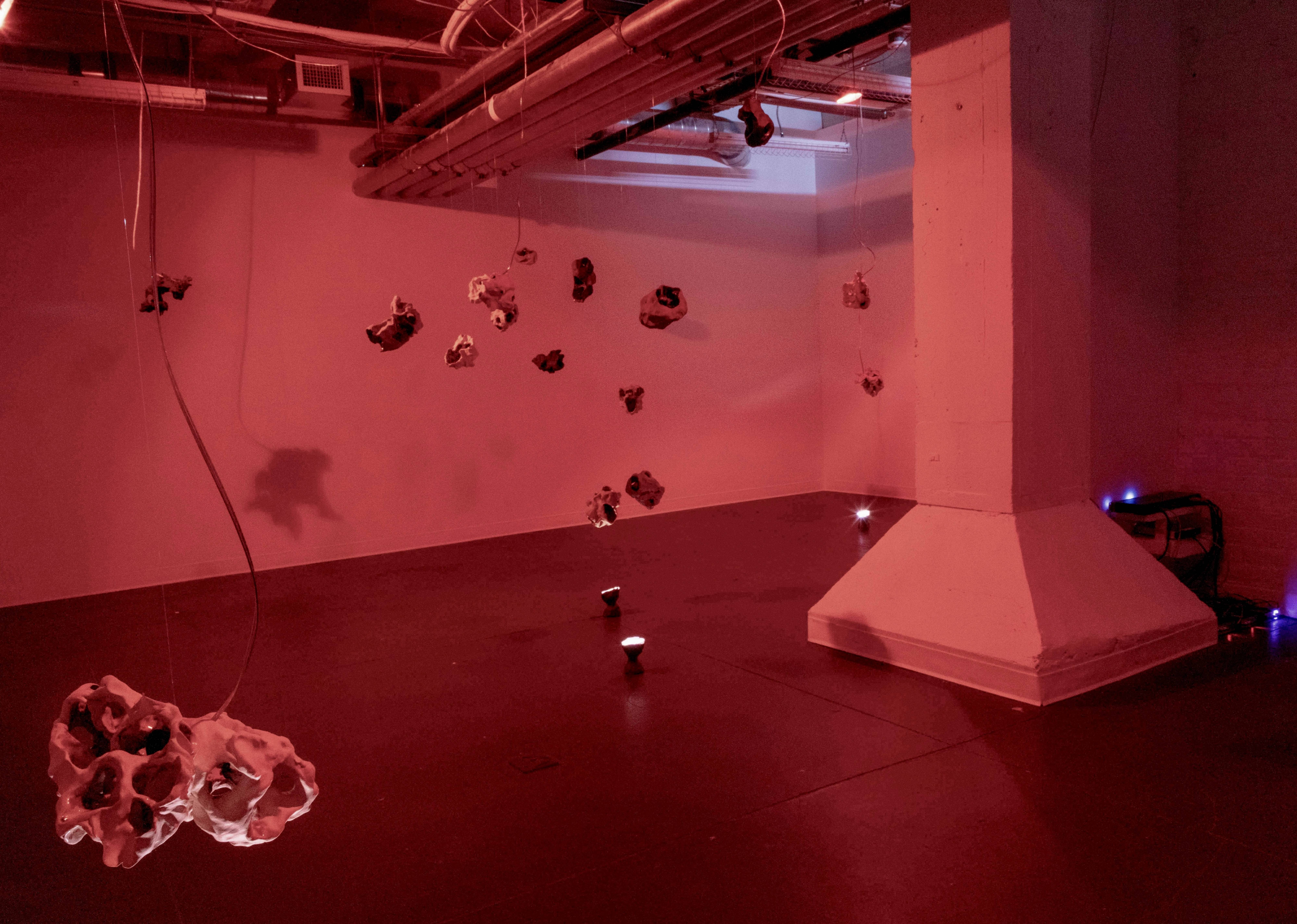 Formally, "synovia" is a sound and sculpture installation, consisting of 18 ceramic sculptures suspended through the space, many of which contain small speakers. The sound installation consists of subtle sounds moving around the space via these tiny speakers as well as a foundation of low-frequency sound played through a subwoofer. The installation is meant to invoke betweenity and the dancefloor in a highly abstracted manner – the formal choices are intended to evoke sensations of interaction, intimacy, inhabiting your body among other bodies, and feelings of perceptual relation: distance, proximity, and the space between these relations.