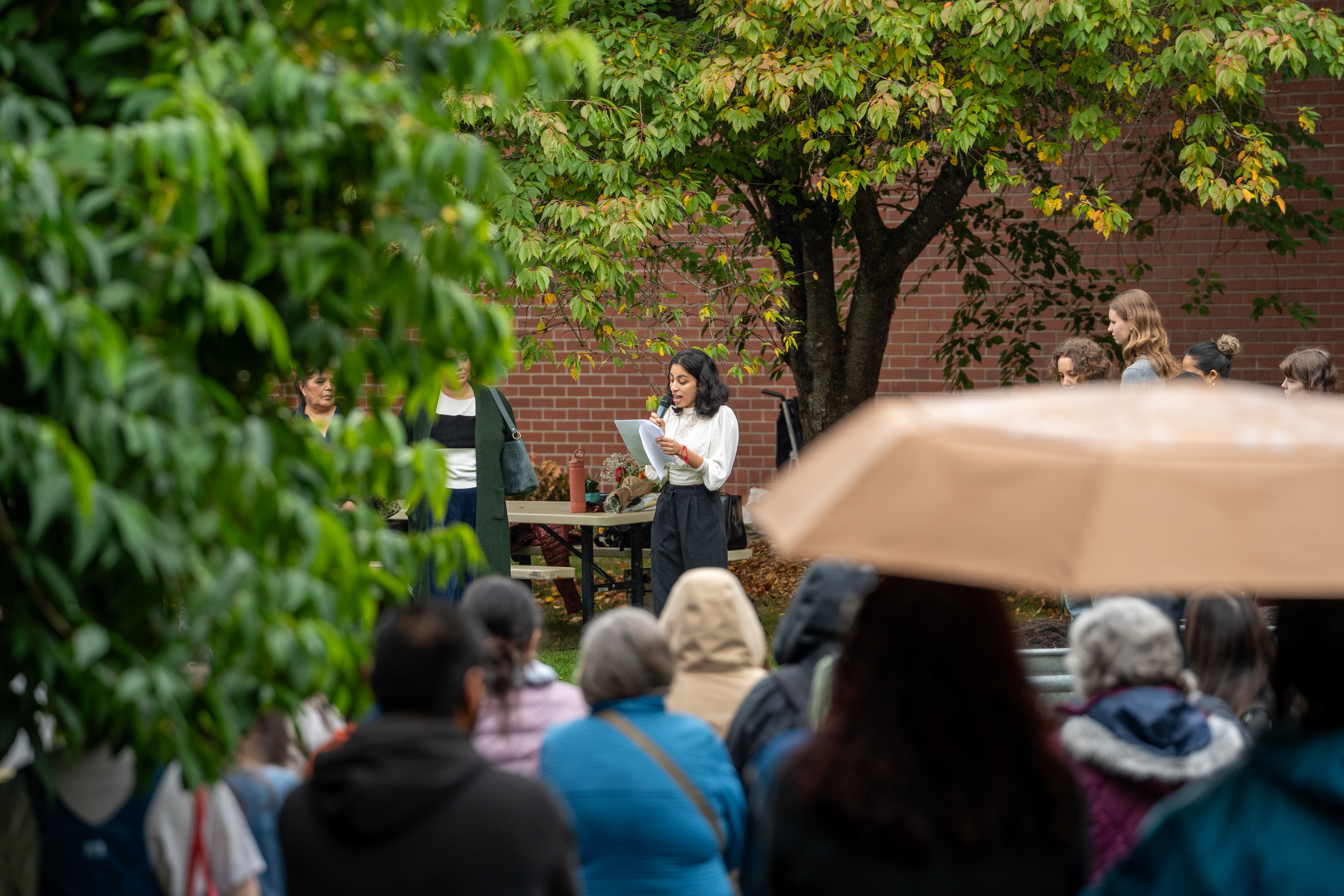 Photograph of student addressing attendees during Mr. Alfonso Guzmán's dedication ceremony.